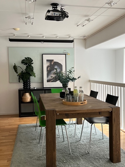 En rymlig trappa leder upp till övervåningen, även här finns en öppen yta med trevligt ljusinsläpp. Denna yta lämpar sig fenomenalt för möten.