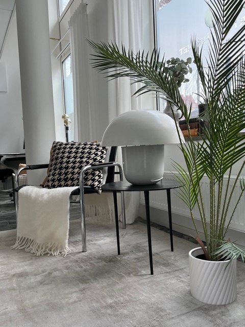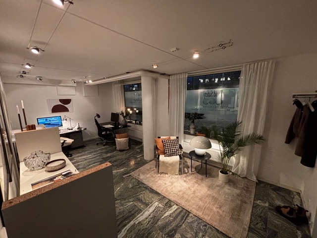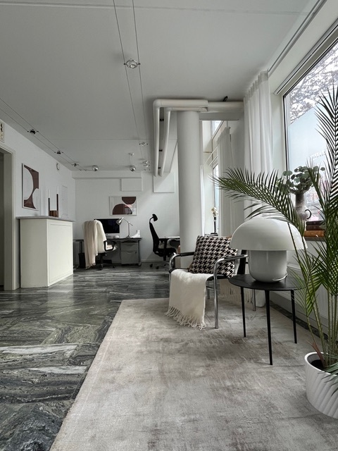 Marmorgolv, stora fönster mot gatan som släpper mycket sol och ljus - gör att med sina ca 70 kvm fördelade på två våningar - ger stor arbetsro.