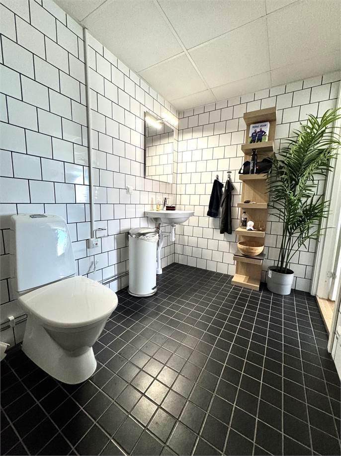 Lokalen präglas av ljusa ytor, generös takhöjd och en modern, stilren interiör som skapar en inspirerande arbetsmiljö. Här finns ett elegant pentry samt ett fräscht badrum med dusch och toalett – allt du behöver för en funktionell och bekväm vardag.