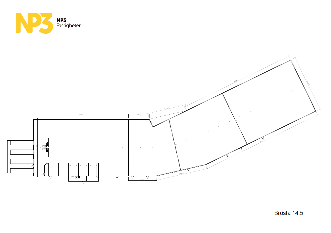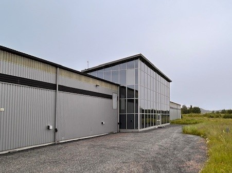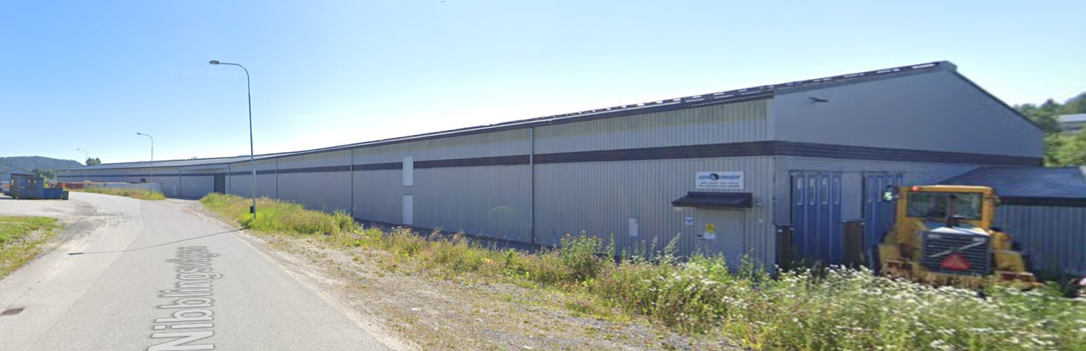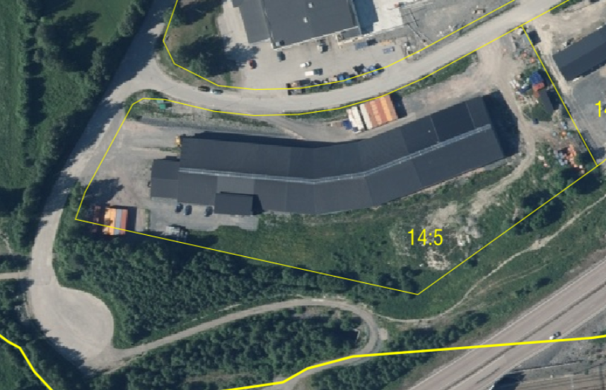 Den rymliga markytan runt byggnaden möjliggör smidig manövrering av större fordon, uppställning, utomhuslager eller framtida utveckling av verksamheten.