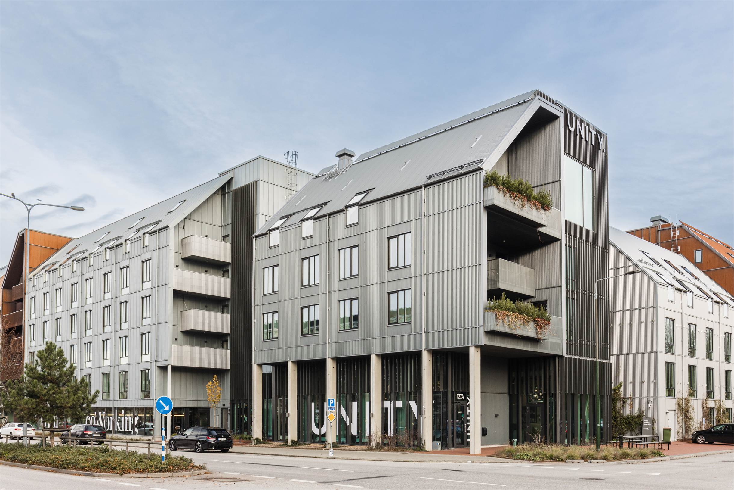 Unitys boendekoncept kombinerar hem och arbetsplatser i samma byggnad. De små hyreslägenheterna och studiorna har gemensamma sociala ytor och coworking‑platser, vilket gör att både boende och företag kan umgås, arbeta och nätverka på samma plats. Det skapar ett naturligt flöde av människor, vilket är positivt för verksamheter som vill ha synlighet och aktivitet i sin omgivning.