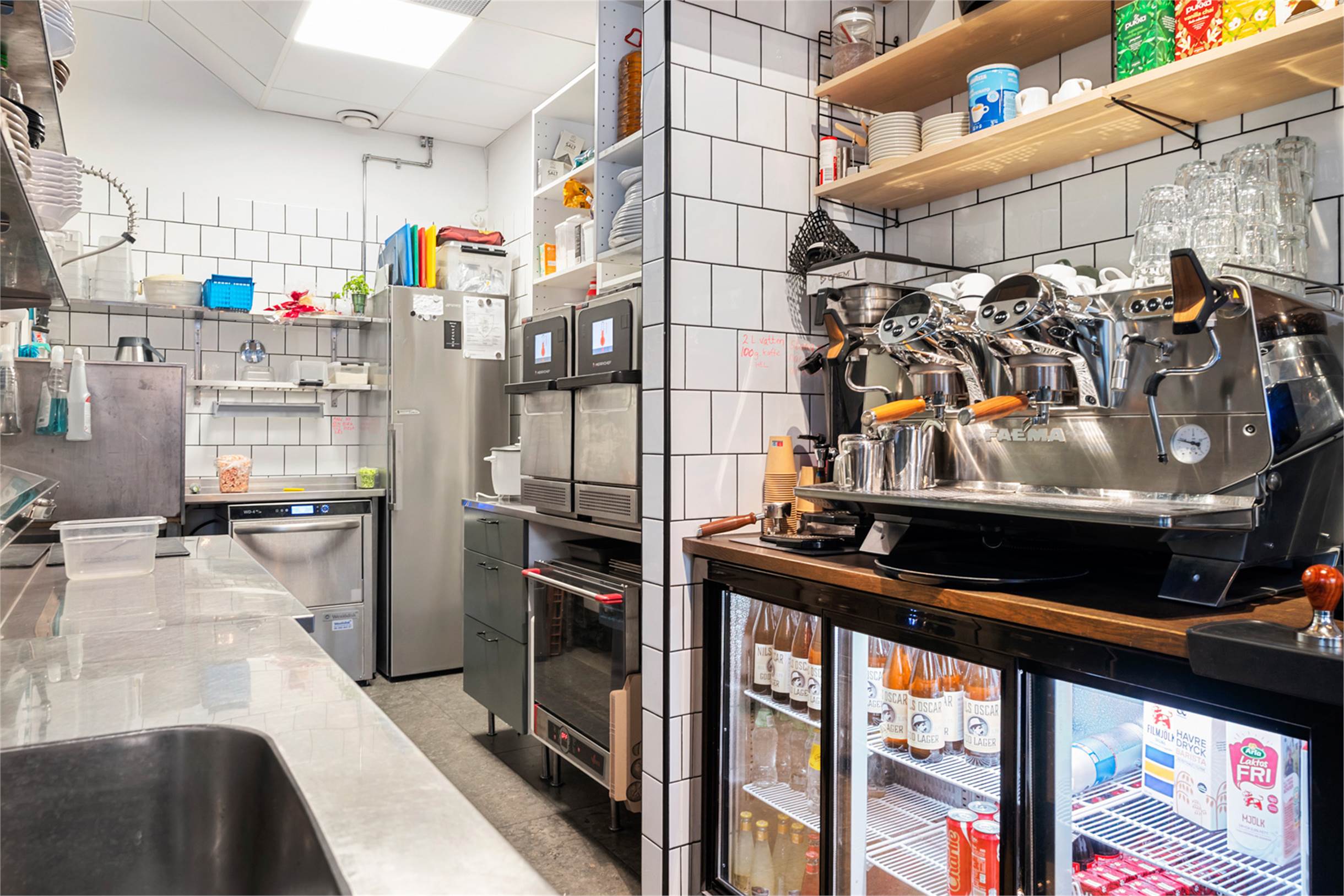 Här finns allt startklart för den som vill ta över en mycket fin verksamhet. Köket är välutrustat med tre ugnar att baka bröd och grädda pizzor i. Här finns kyl, frys, diskmaskin, dryckeskyl och två arbetsbänkar med kylda draglådor under. Goda arbetsytor i köket och här finns också vatten draget till en arbetsbänk. Ismaskin, stor espressmaskin, kaffekvarn och kassasystem. Smarta förvaringsmöjligheter i köket och under bänkarna i matsalen.