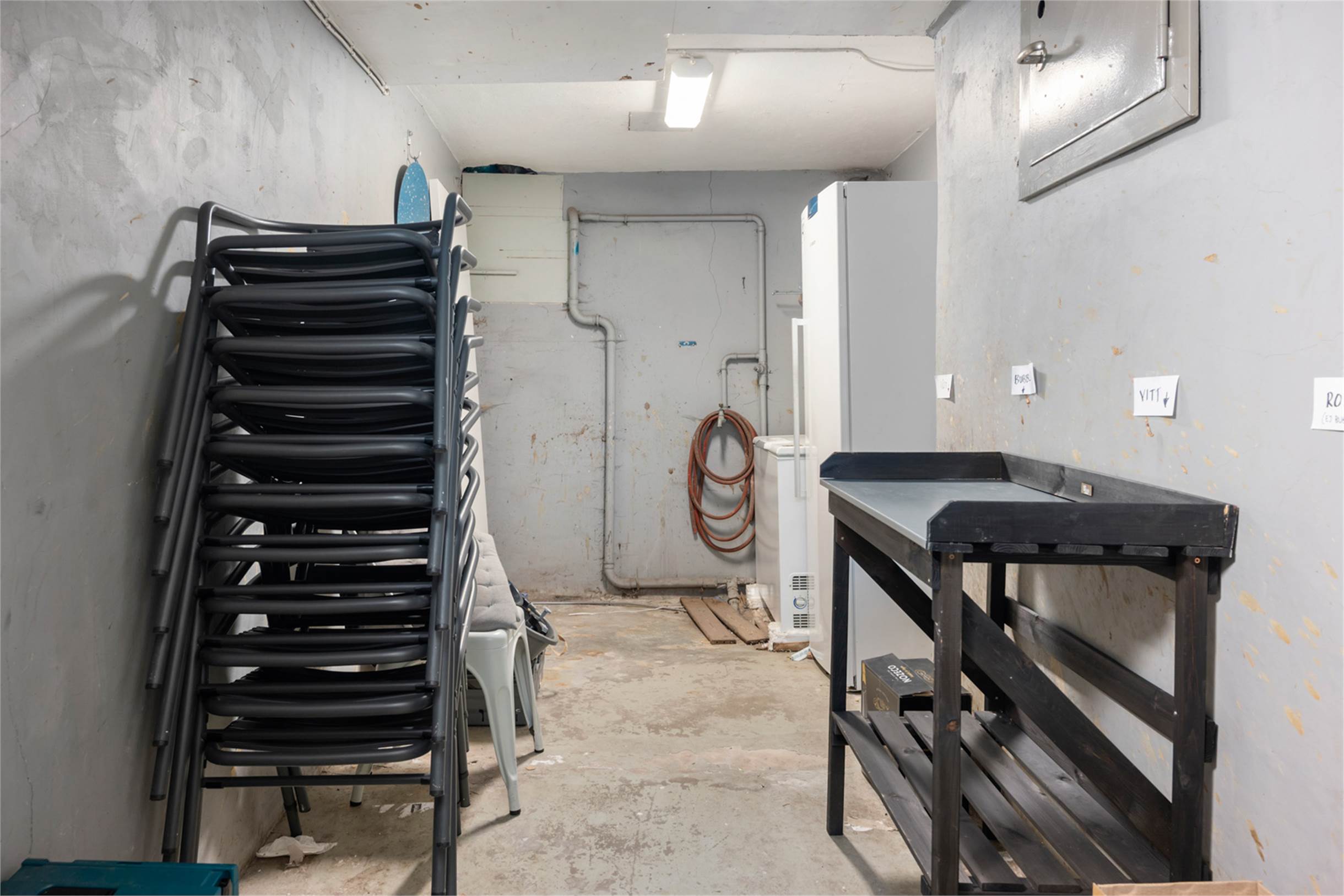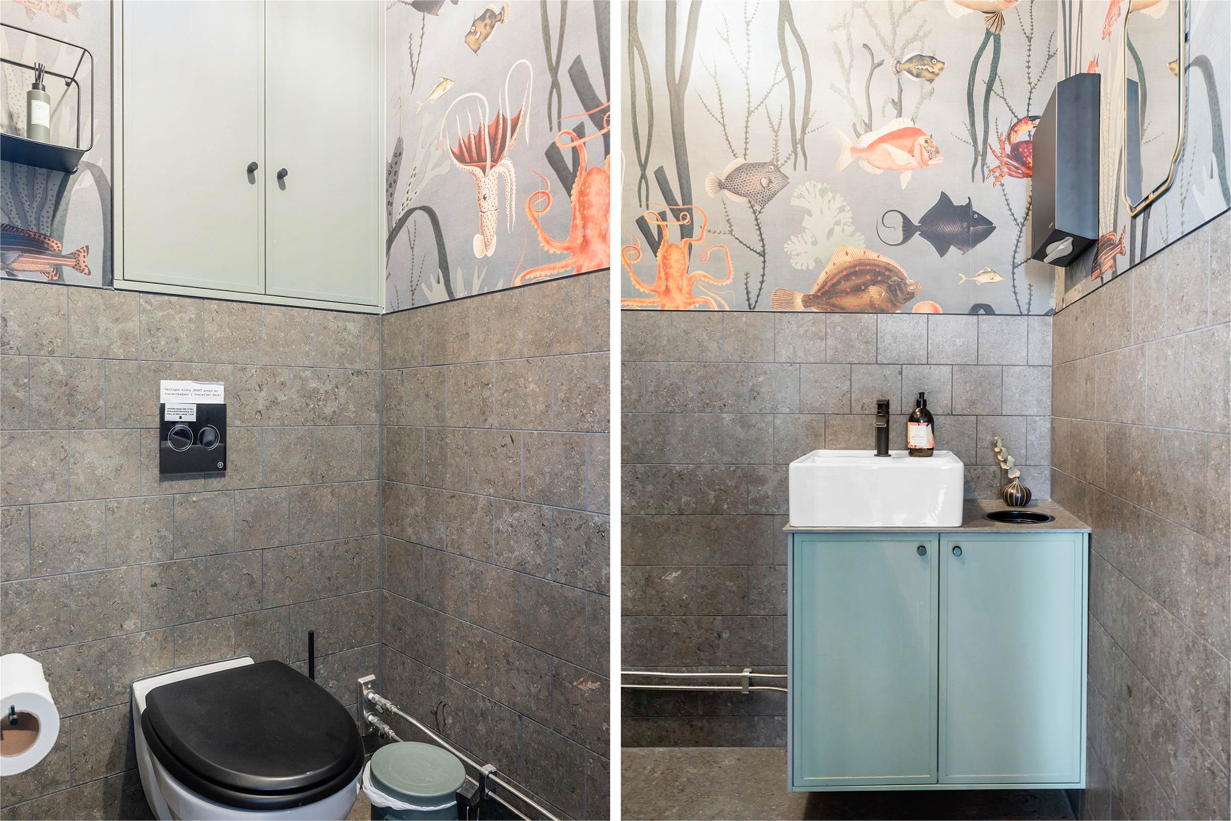 Fin gästtoalett i matsalen samt stor personaltoalett bakom köket. På husets innergård har man ett eget soprum med kylmöjligheter. I fastighetens källare ingår ett rymligt förråd där man kan förvara uteserveringens bord, stolar och parasoll under vintern. Här finns även restaurangens fettavskiljare som töms via soprummet.