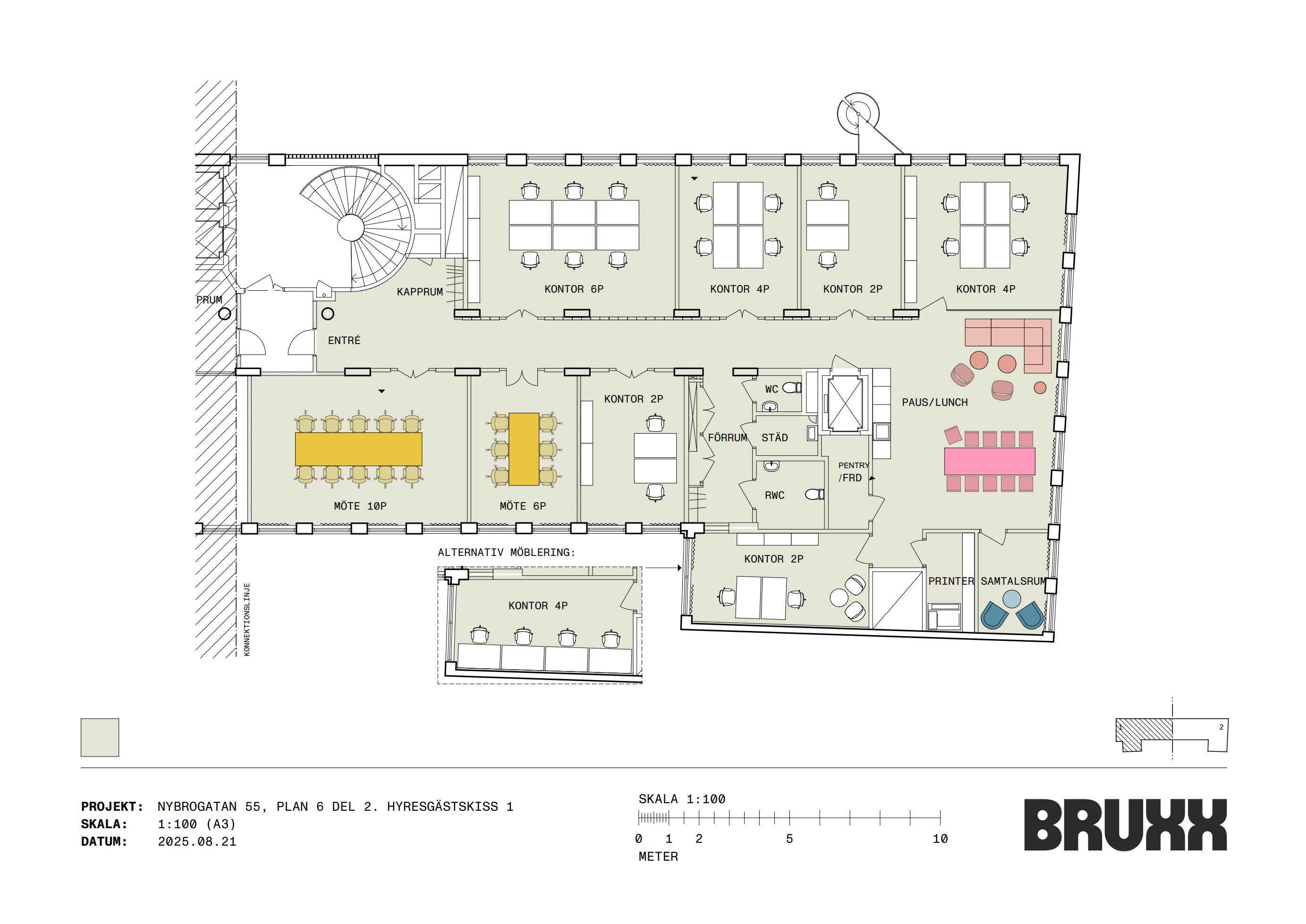 Idag har lokalen ca 46 arbetsplatser men går att förtäta upp till ca 55 arbetsplatser.