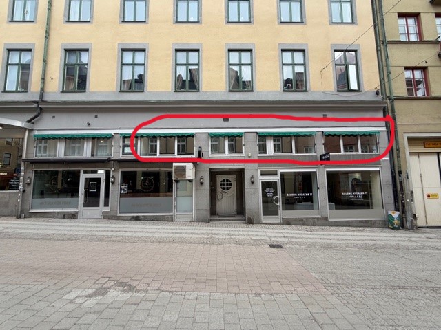 Möjlighet att skylta i fönster samt flaggskylt på fasad.