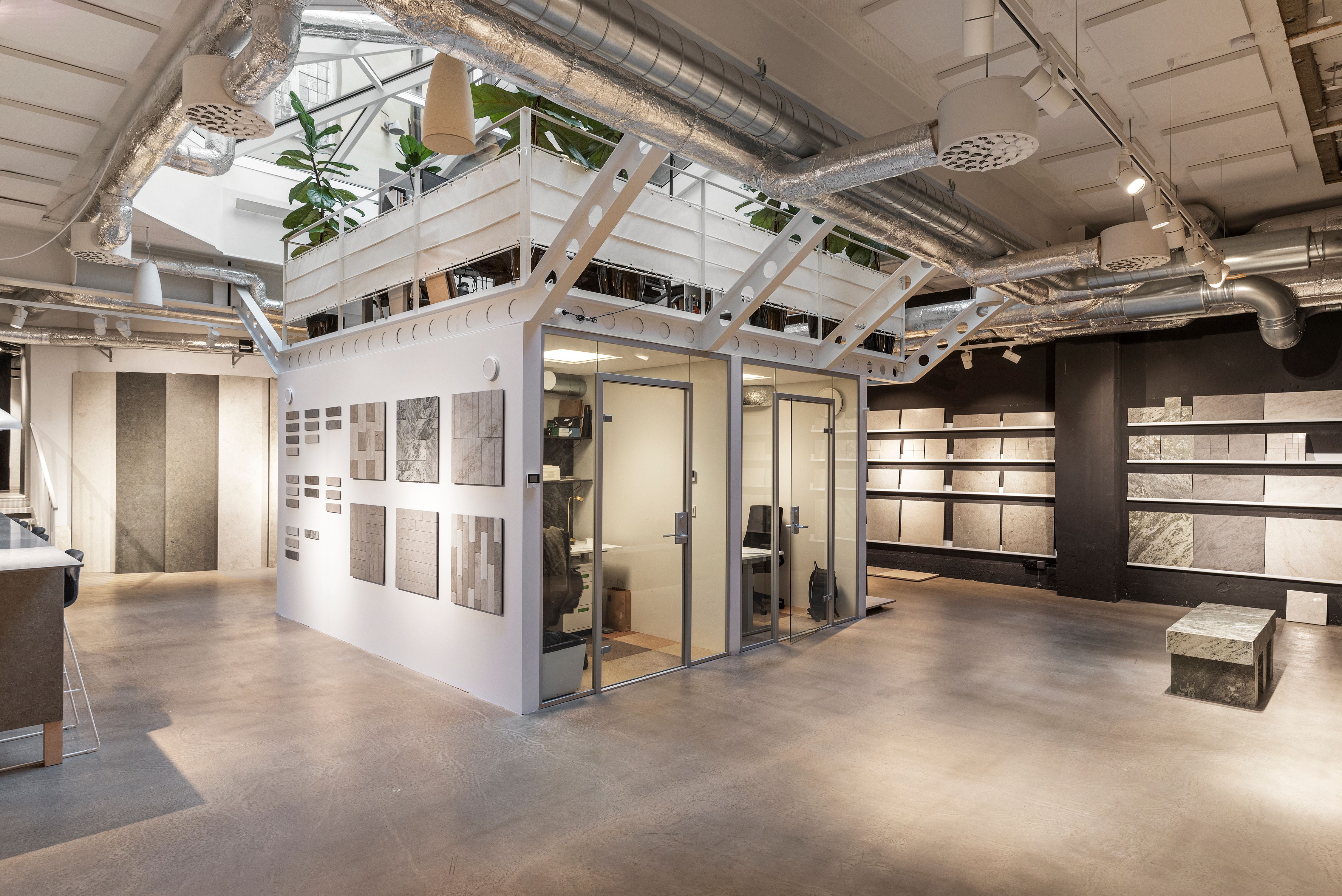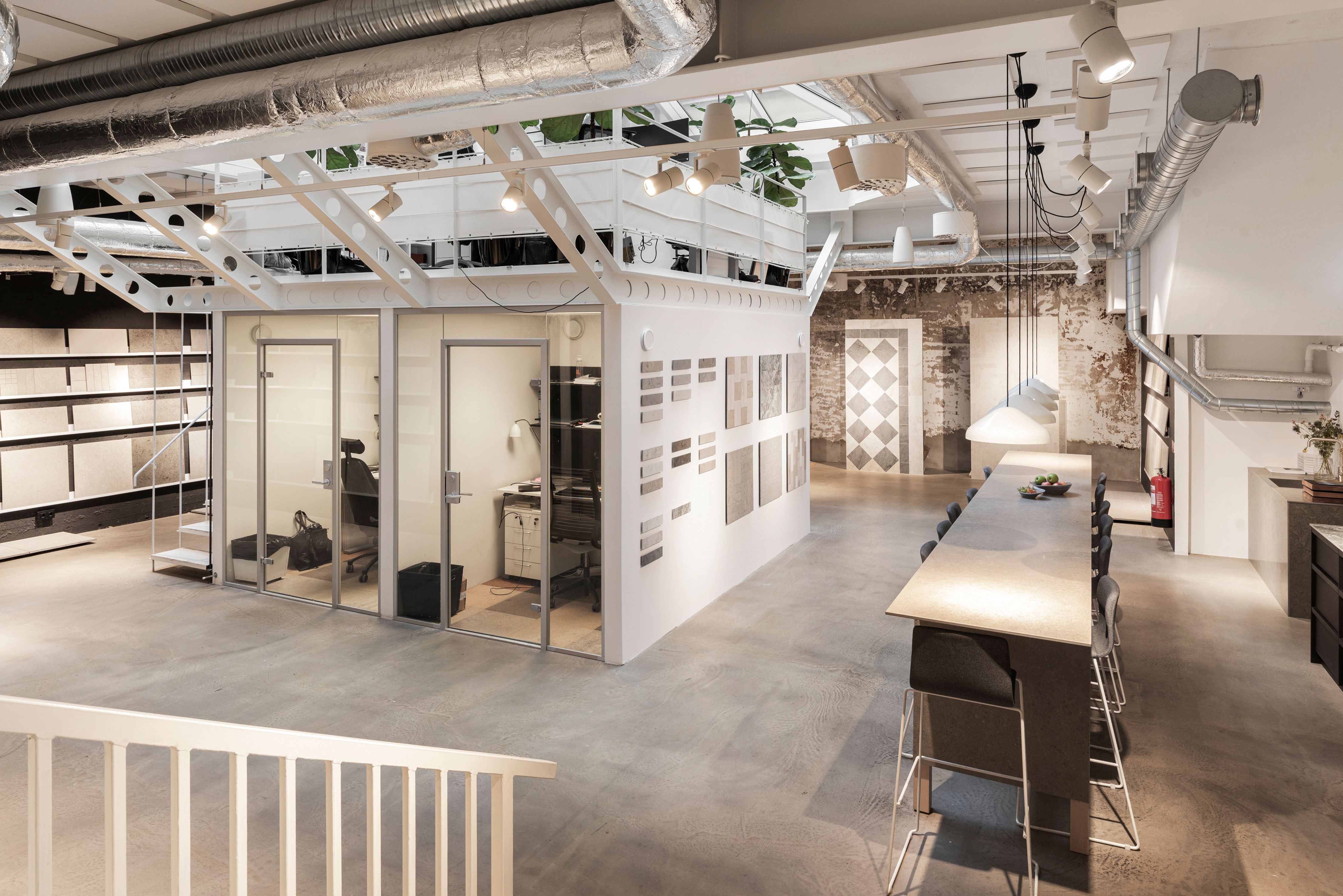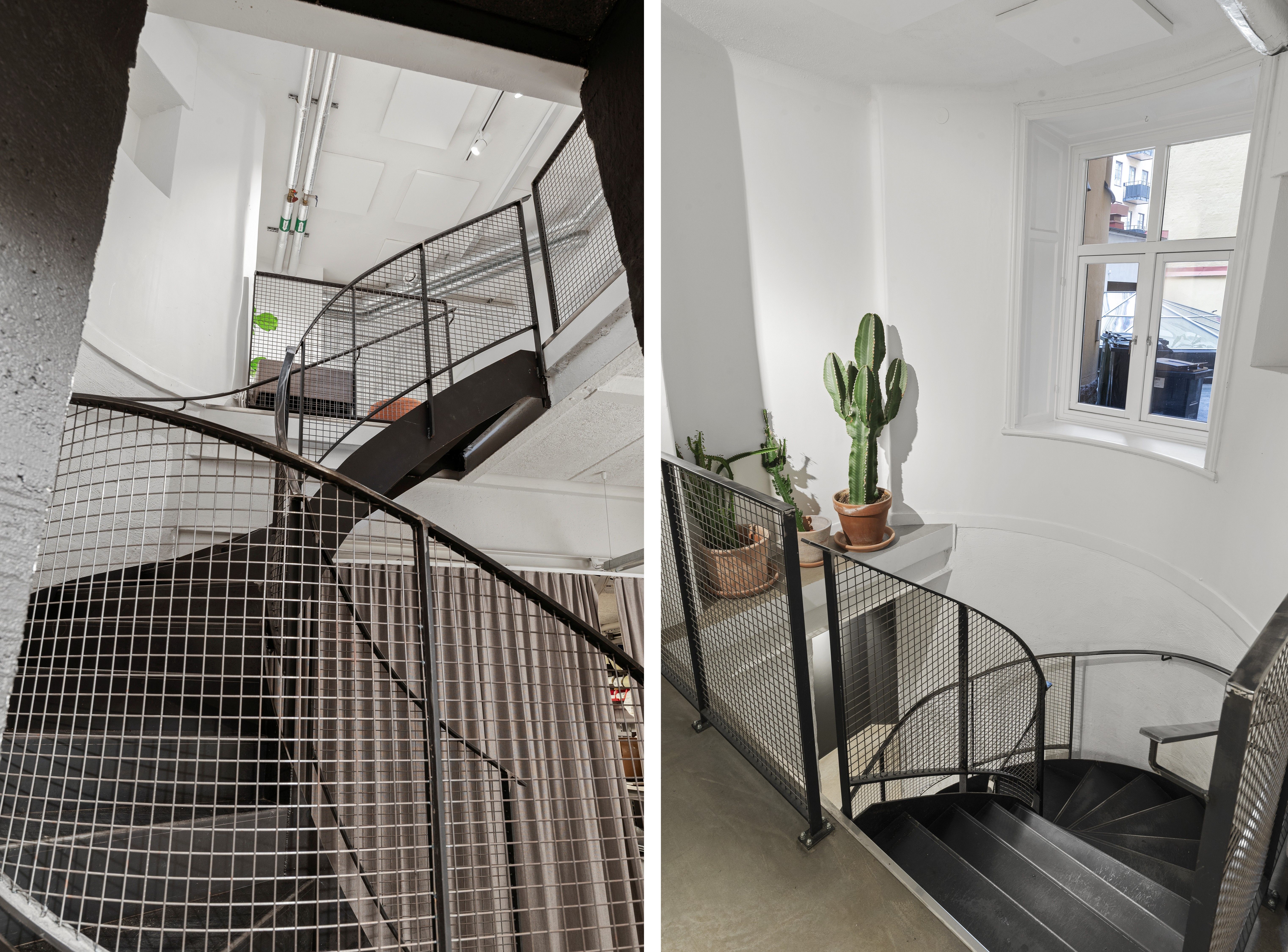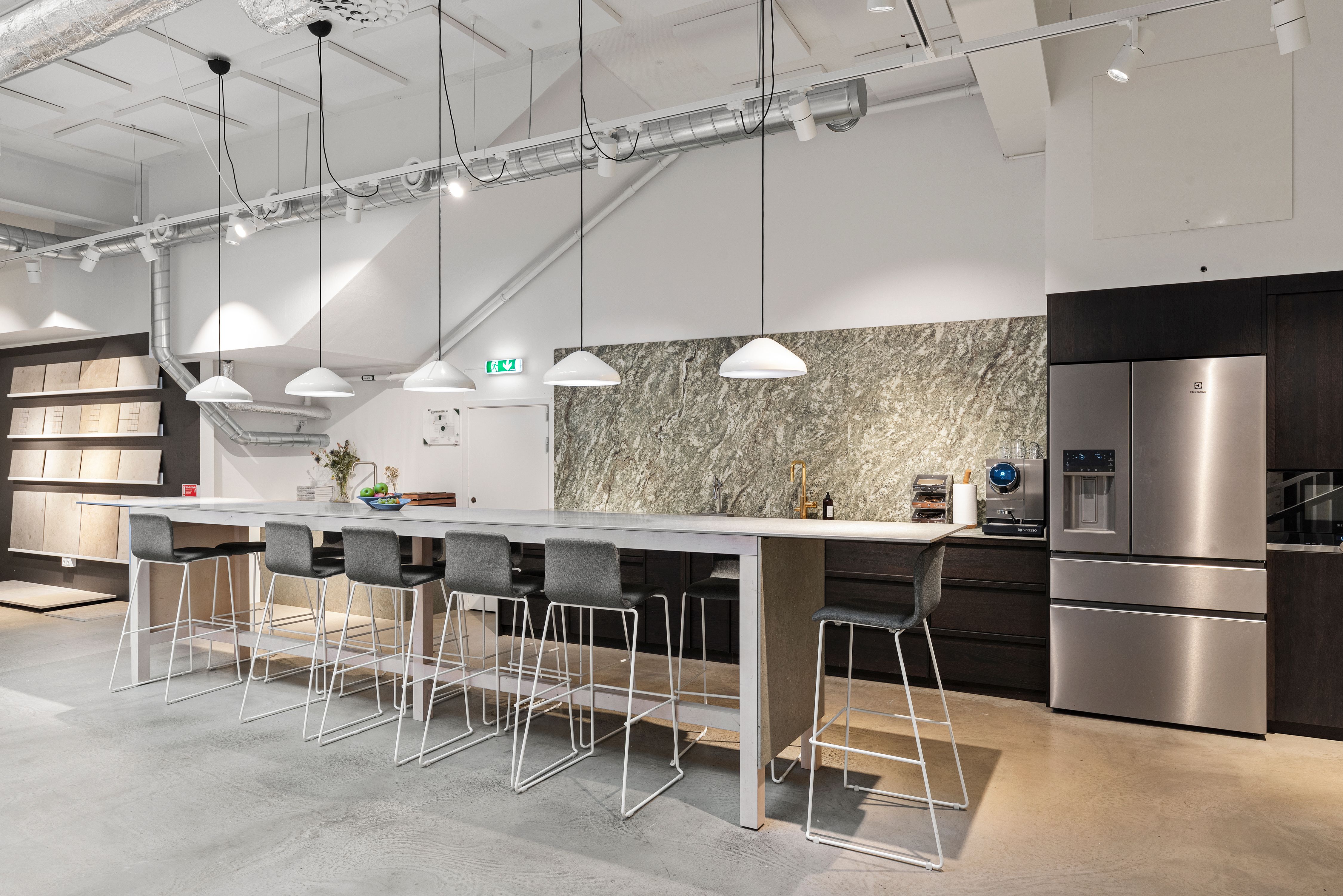 Via lokalens interntrappa nås det nedre planet som kröns av en spektakulär showroomyta. Med en takhöjd på ca 4,5 meter och naturligt ljusinsläpp från takfönster skapas en atmosfär som är perfekt för exponering och kreativa möten. Här finns även praktiska utrymmen för möten, umgänge och förvaring. Här finns även ett platsbygg kök och badrum med hög kvalitet.