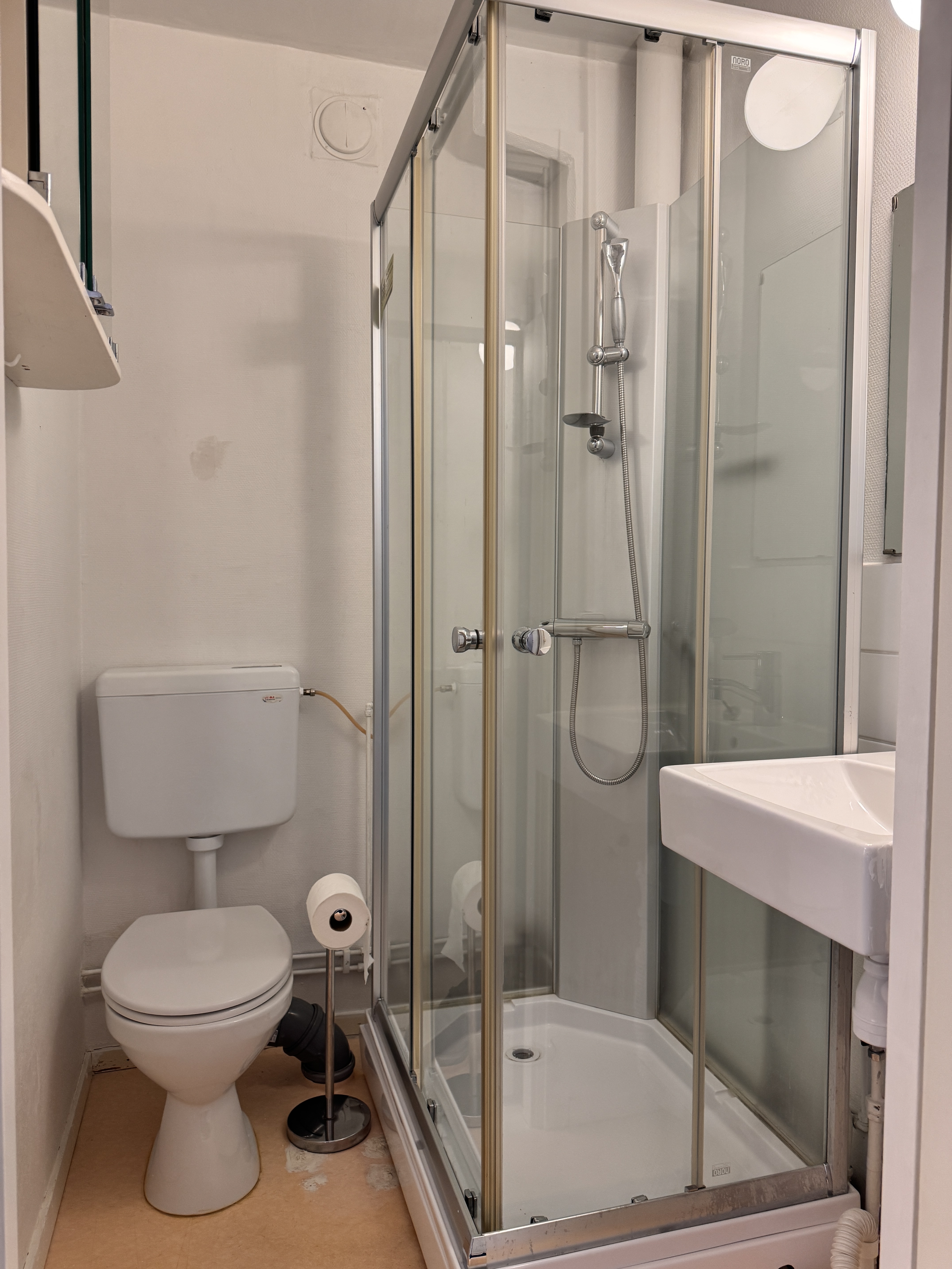 Toalett samt duschkabin direkt till höger från entrén.