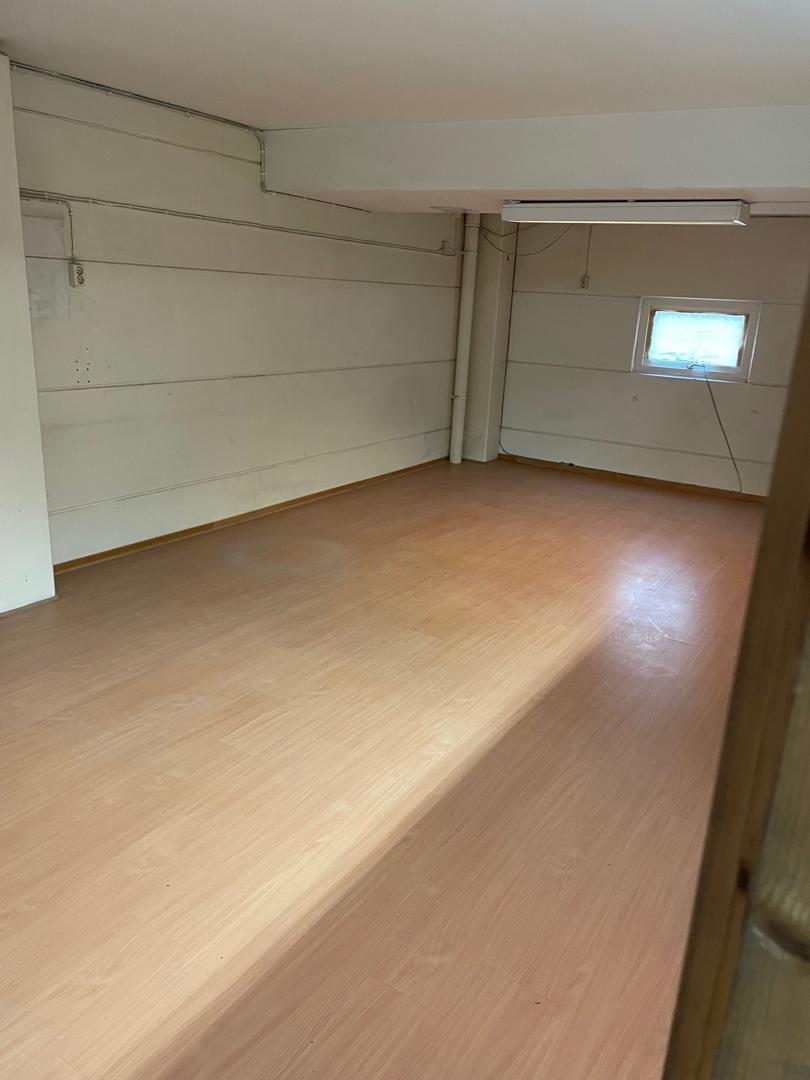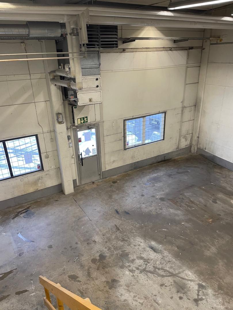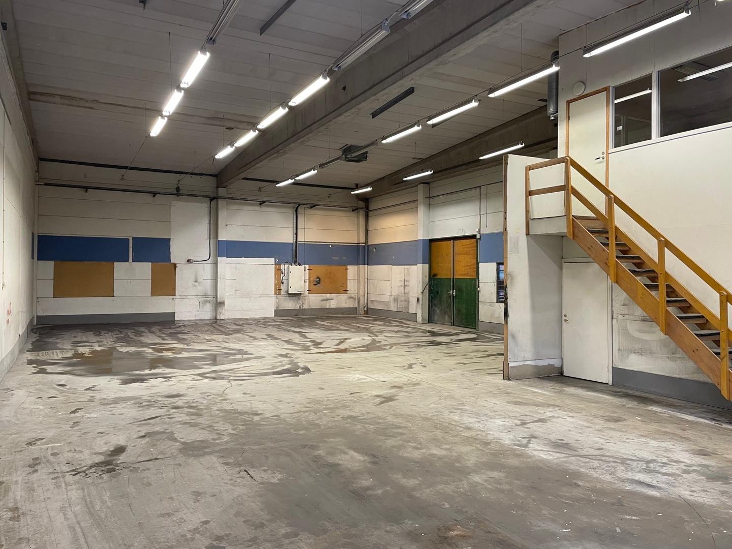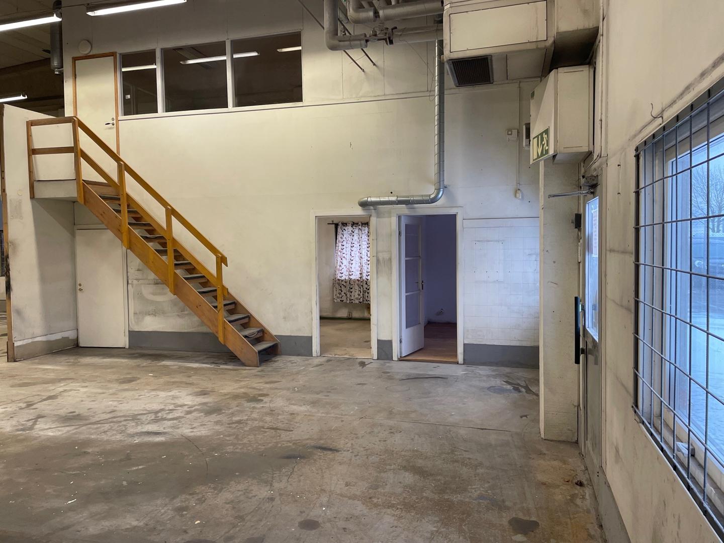 Stor öppen lageryta i bottenplan. Mindre rum med pentry och kontor. Planlösning bifogad.
