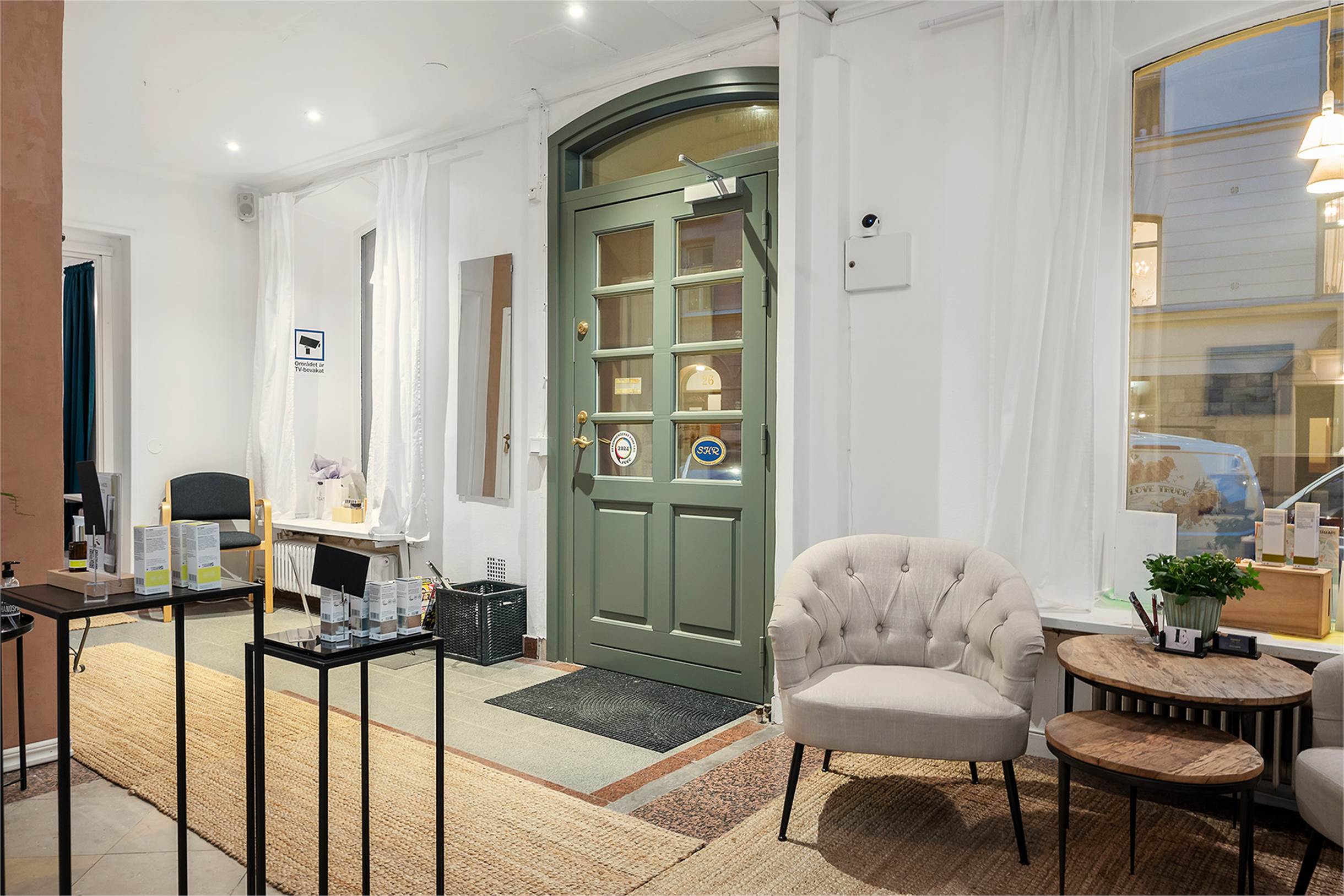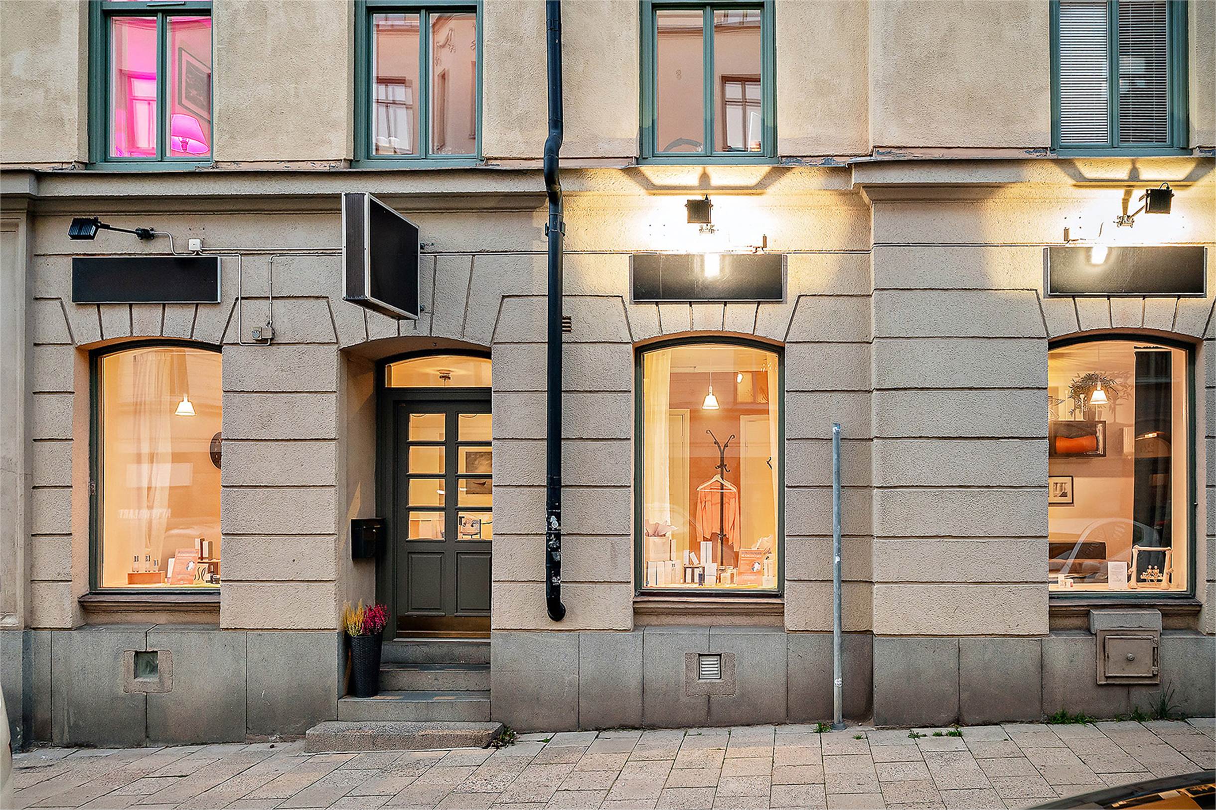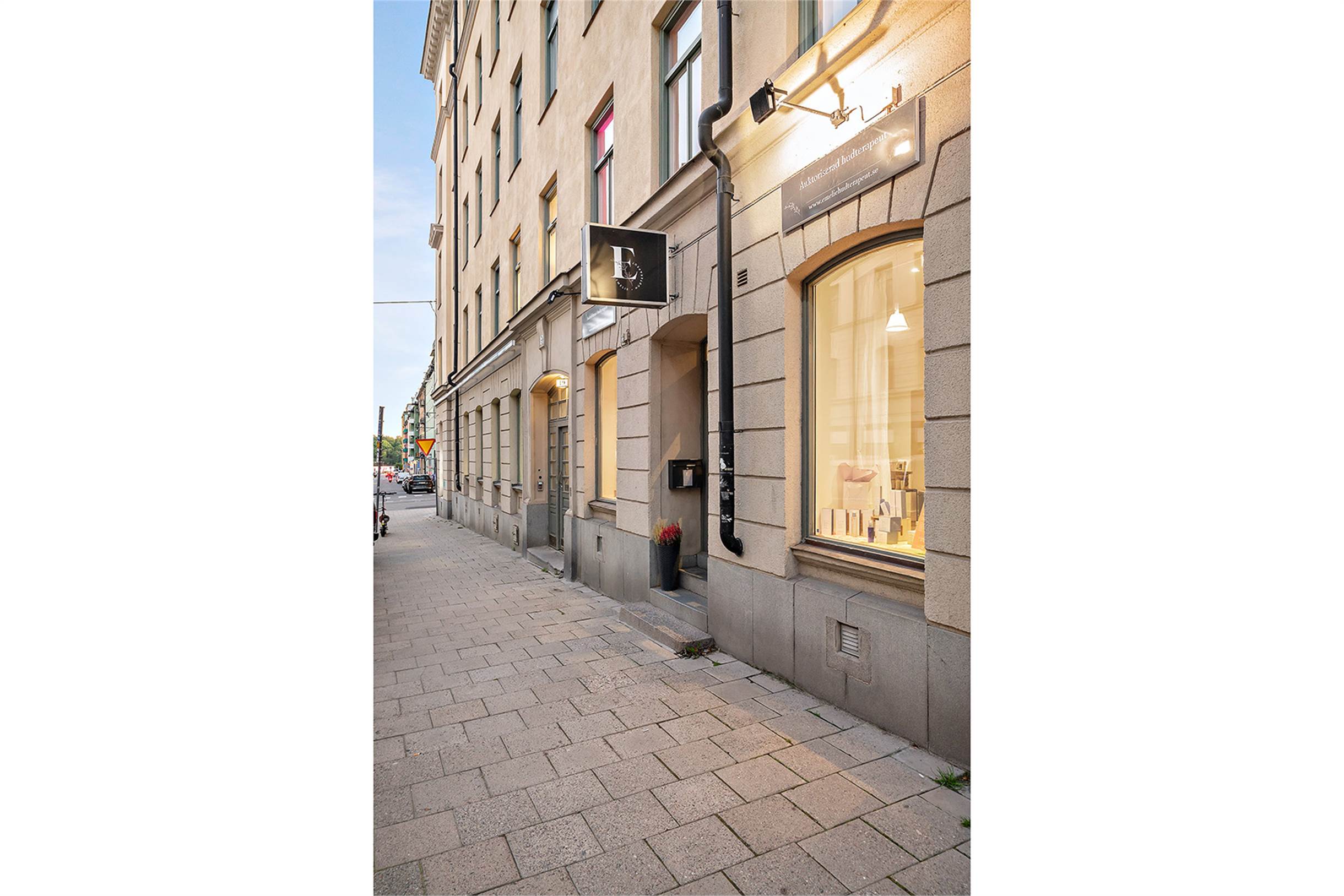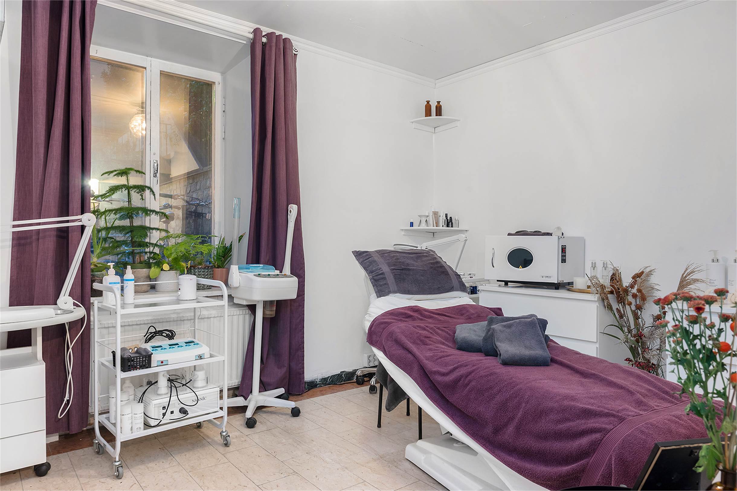 Lokalen utgörs av en rymlig butiksyta med plats för väntande kunder, reception samt försäljning av produkter. Utöver detta finns även tre rymliga behandlingsrum där ett har fönster mot gatan och ett mot innergården. Pentry med diskmaskin och kylskåp, städförråd och toalett. En trappa ned finns ett rum om cirka 20 kvm som kan användas som kontor eller lager. Lokalen har stora fina fönster ut mot gatan med skyltplats på fasaden.