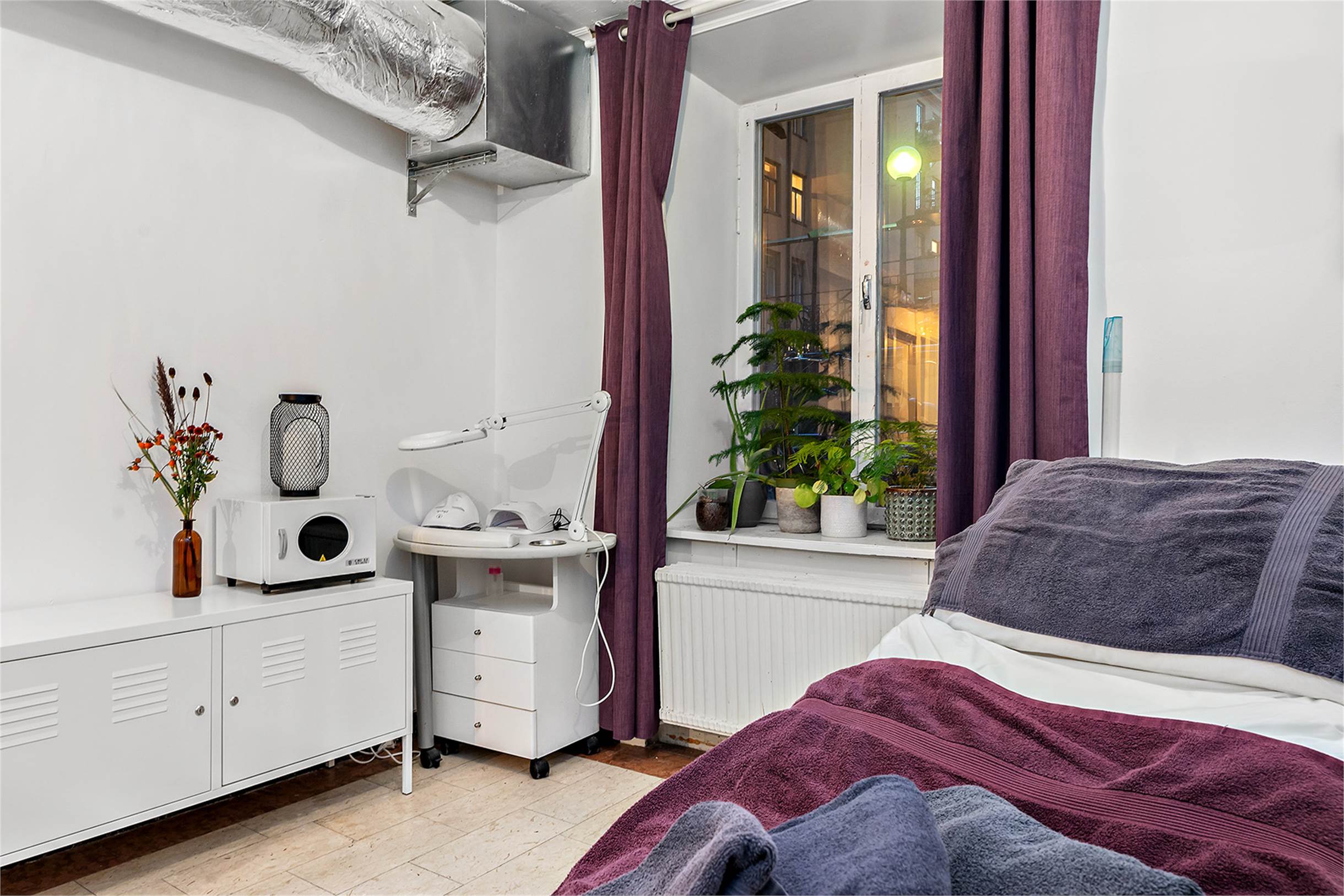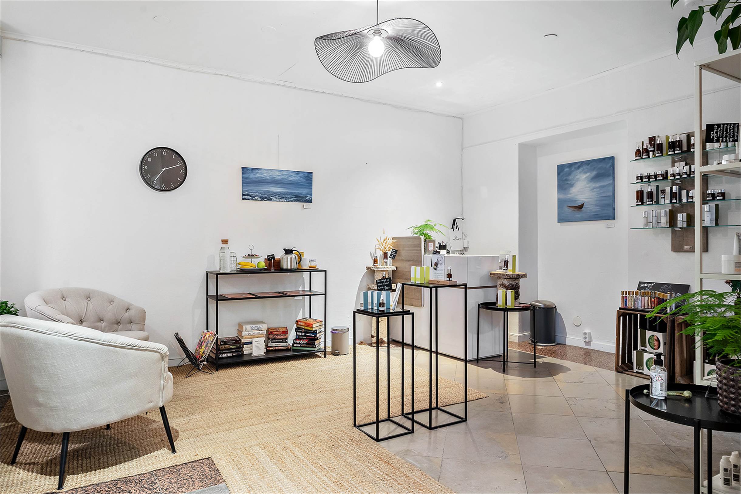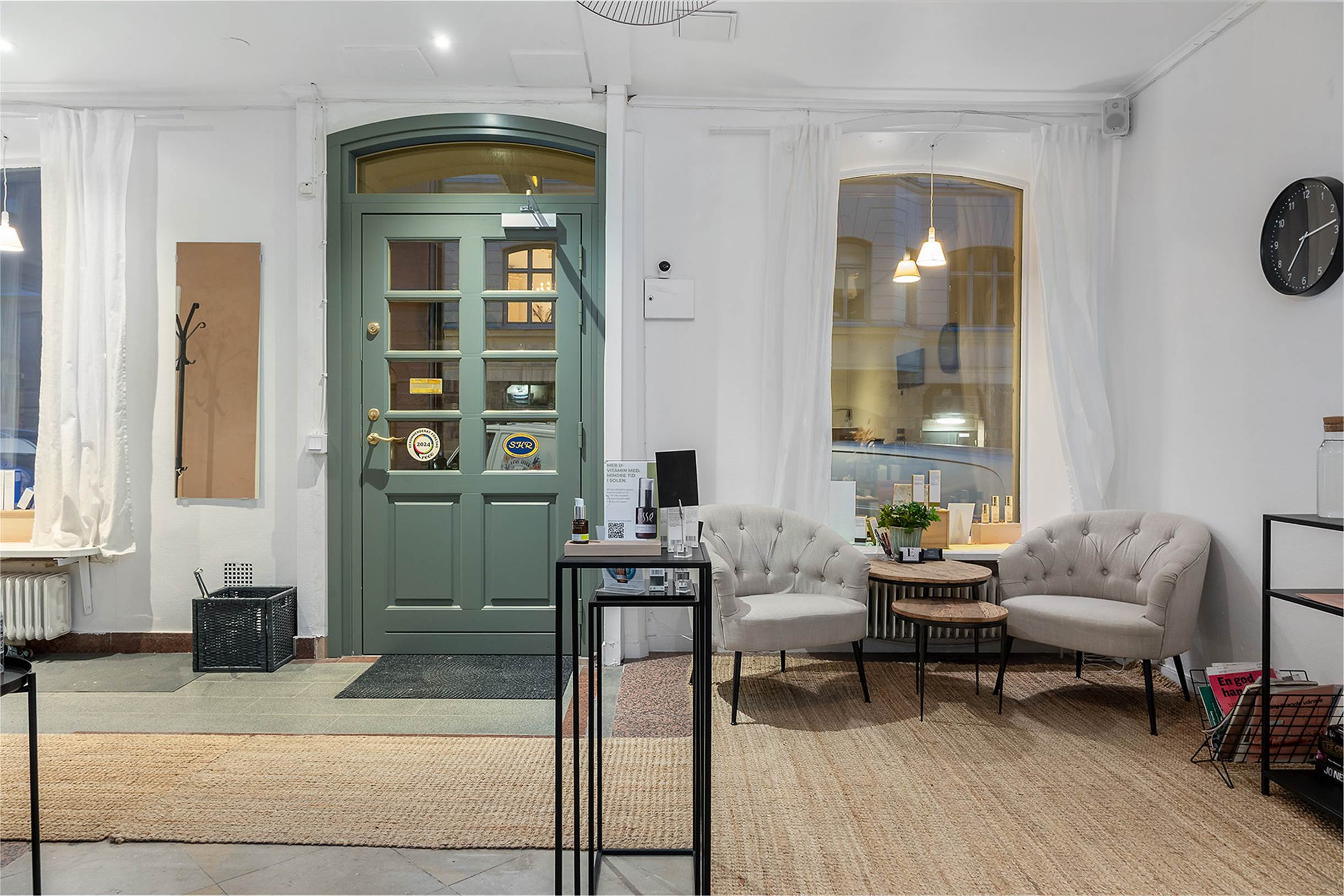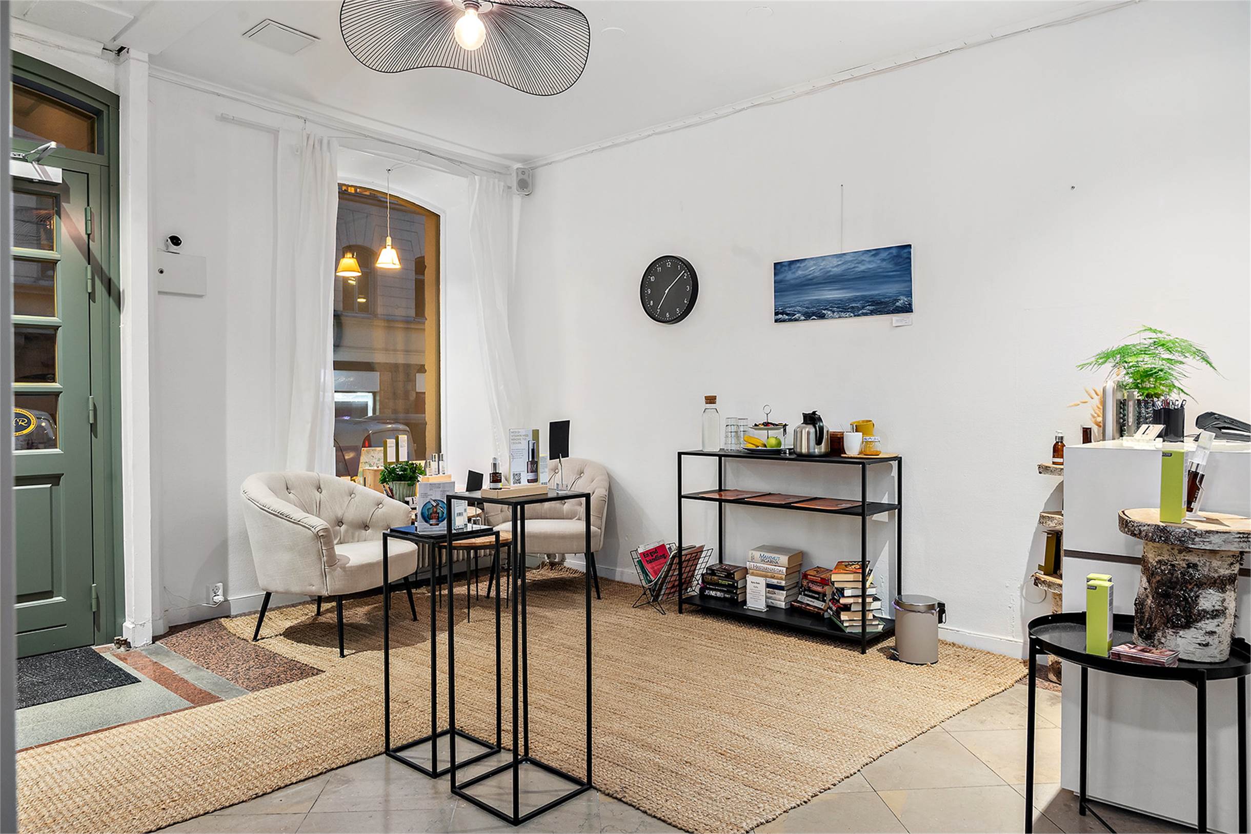 Lokalen utgörs av en rymlig butiksyta med plats för väntande kunder, reception samt försäljning av produkter. Utöver detta finns även tre rymliga behandlingsrum där ett har fönster mot gatan och ett mot innergården. Pentry med diskmaskin och kylskåp, städförråd och toalett. En trappa ned finns ett rum om cirka 20 kvm som kan användas som kontor eller lager. Lokalen har stora fina fönster ut mot gatan med skyltplats på fasaden.