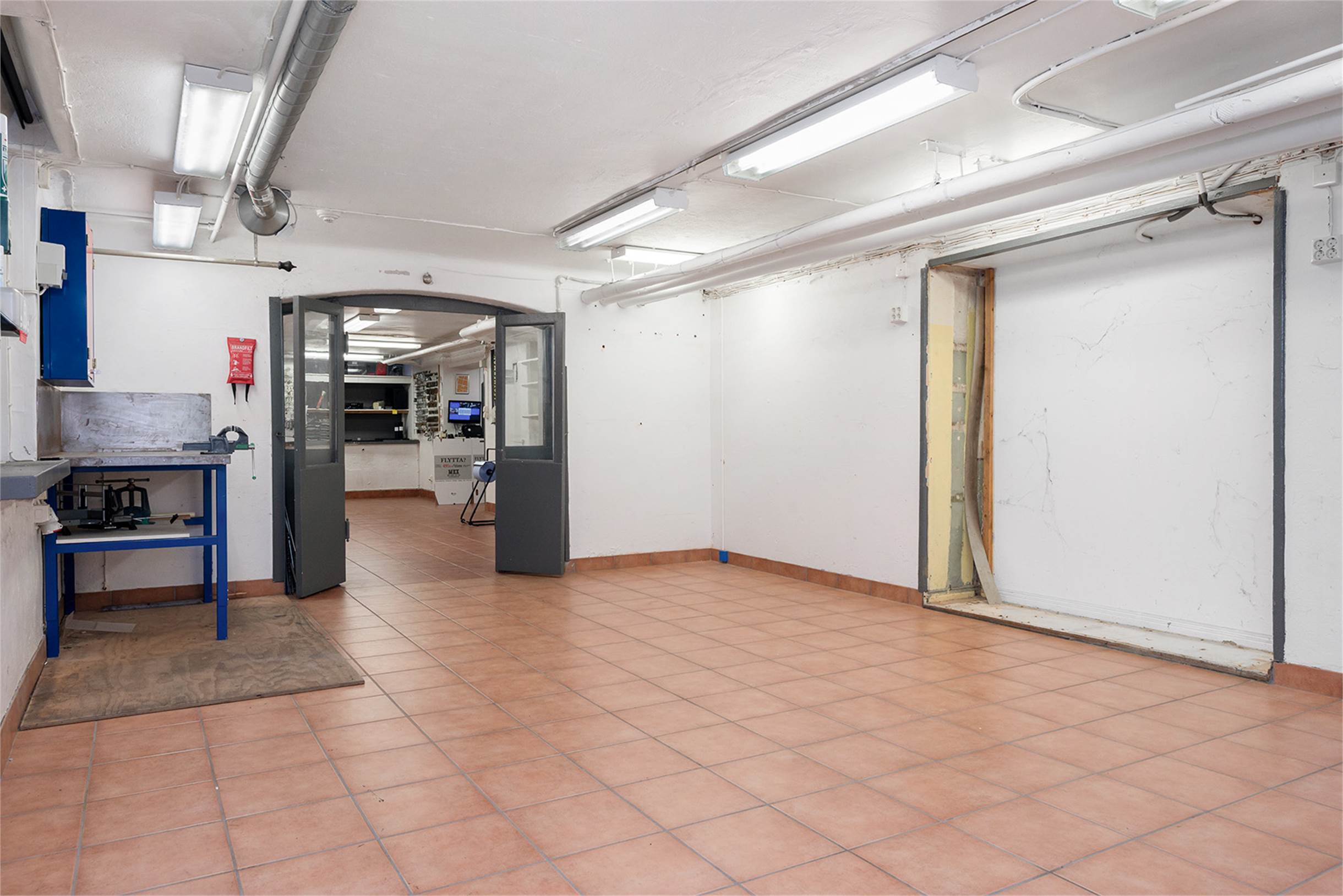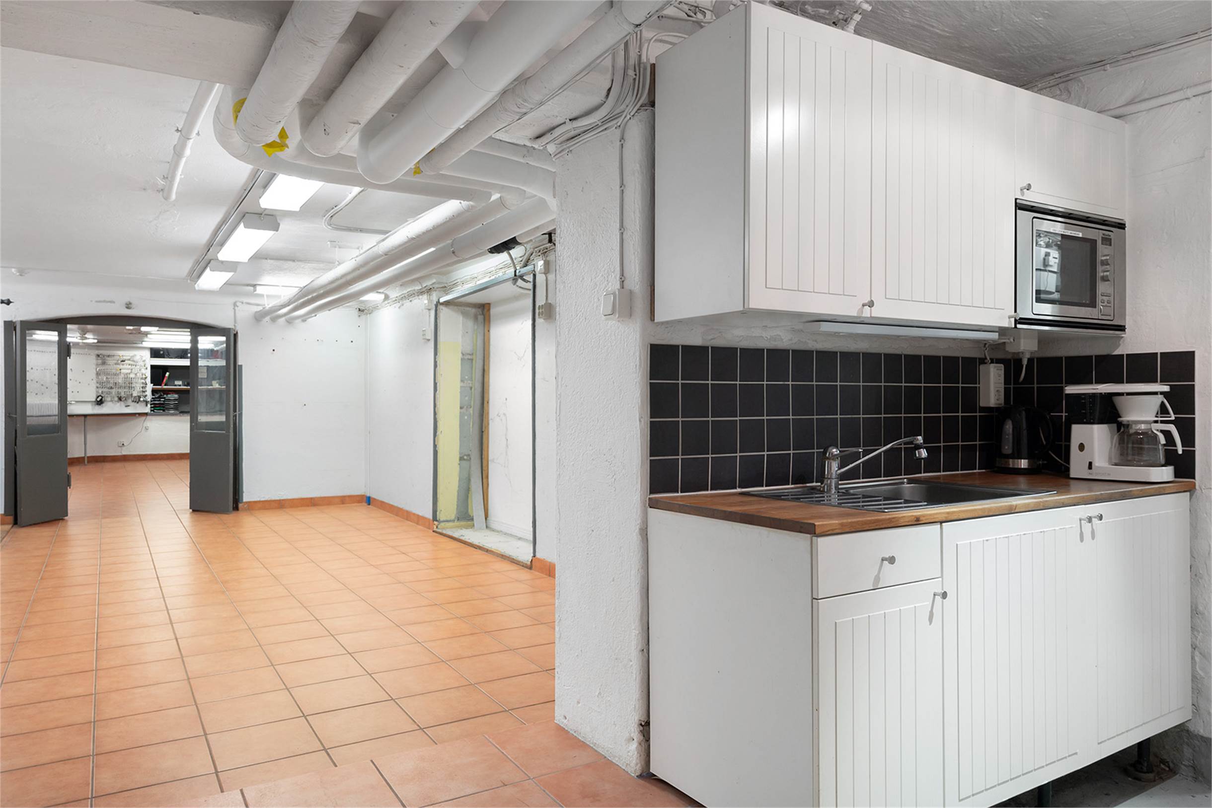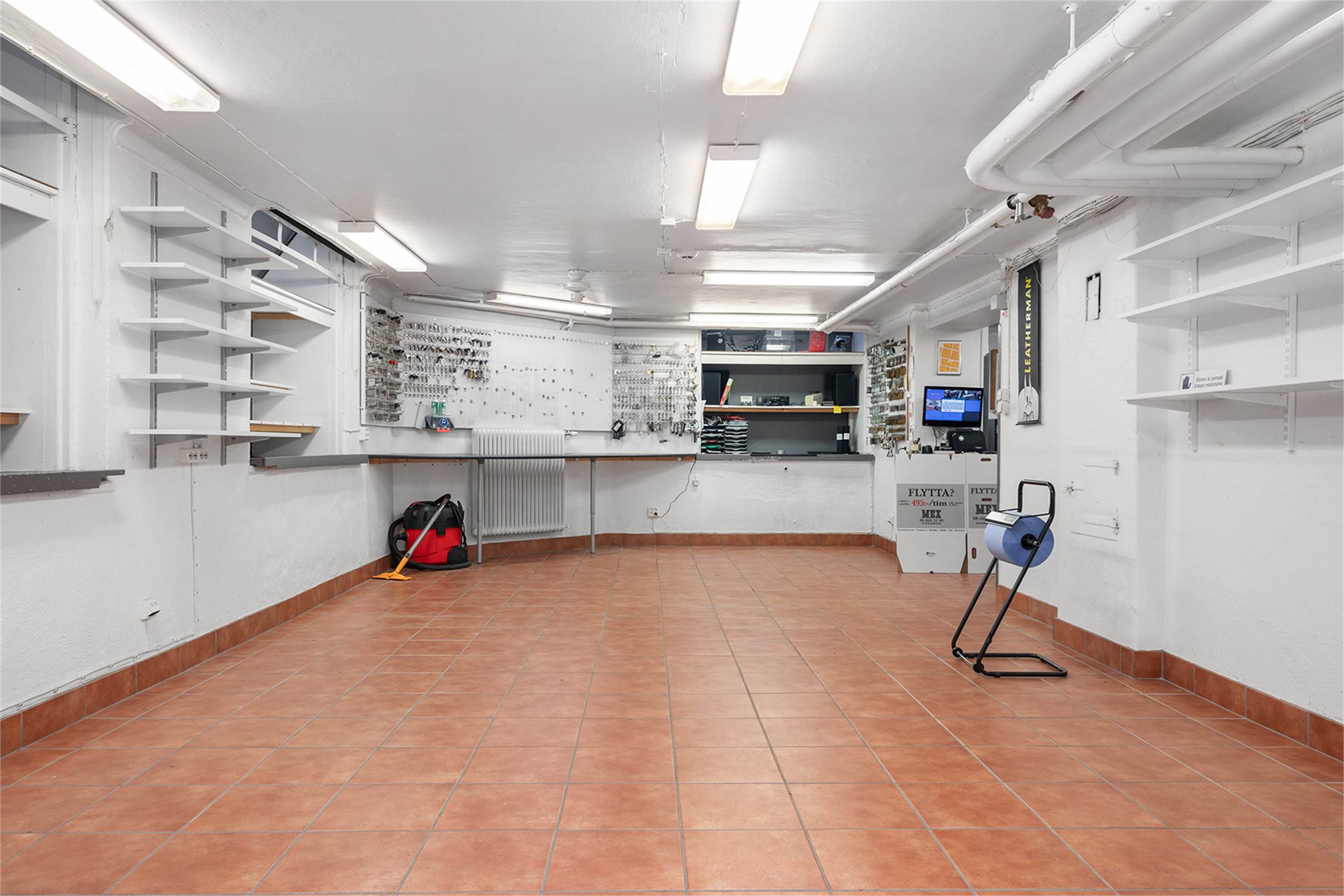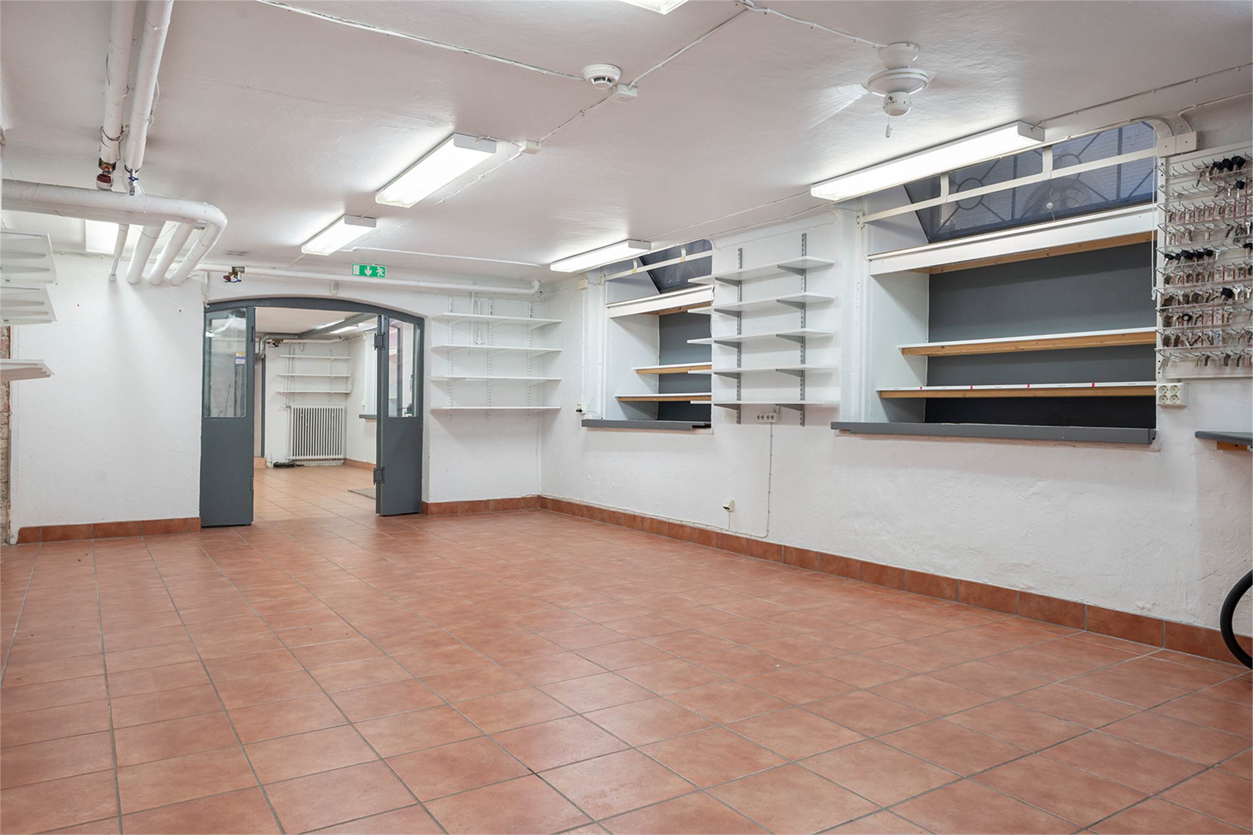 Butiken utgörs av två rum där den ena delen passar som både butik och kontor. Här finns goda exponeringsytor och plats för kassa och även en toalett i anslutning till butiken. En trappa leder ner i lokalens rymliga källare där man kommer ned till ett rum som kan nyttjas som matplats eller konferensrum. Vidare in i lokalen finns två stora rum som idag använts som verkstad och lager. Längre in i källaren finns ett lager som har duschkabin och tvättmaskin samt toalett, pentry och ett rymligt kontor. Pentryt är utrustat med kyl och frys, micro och diskho.