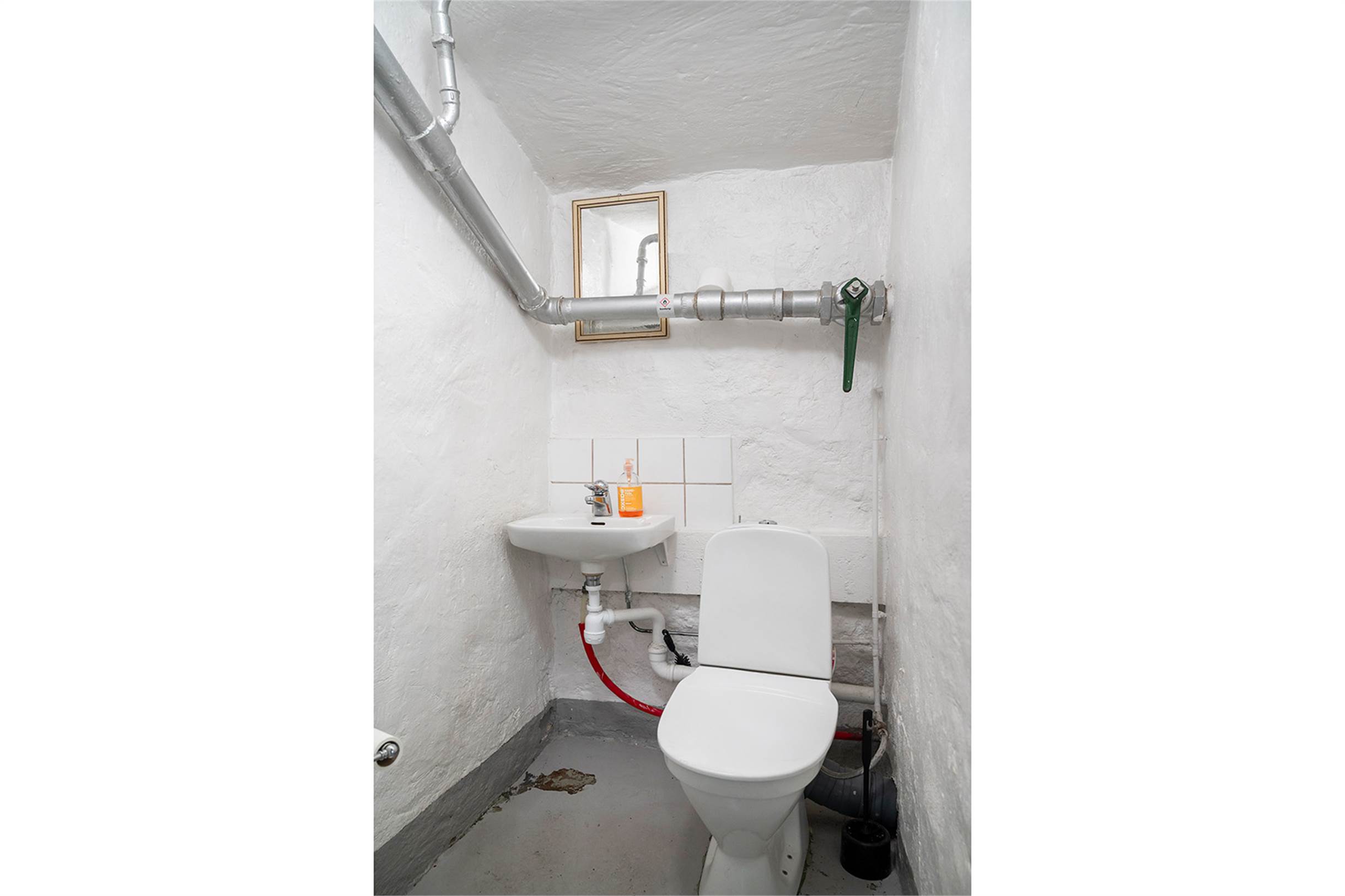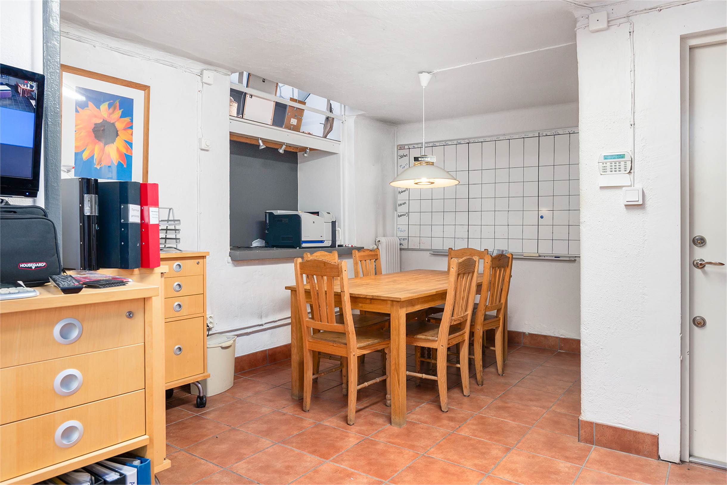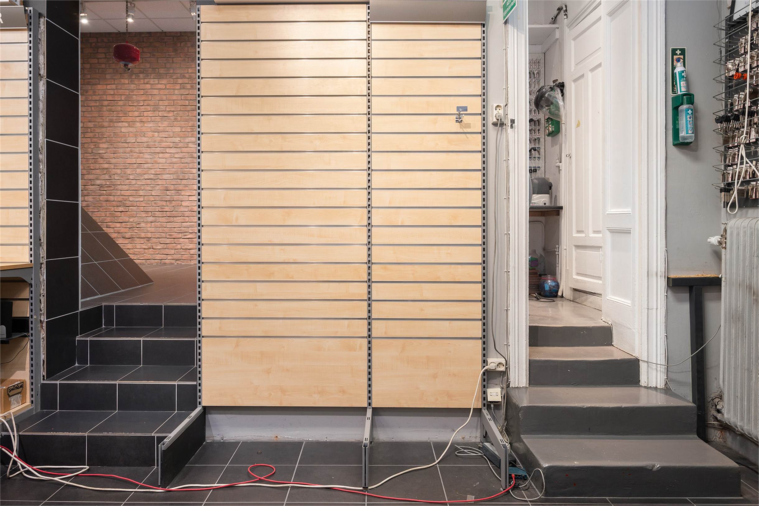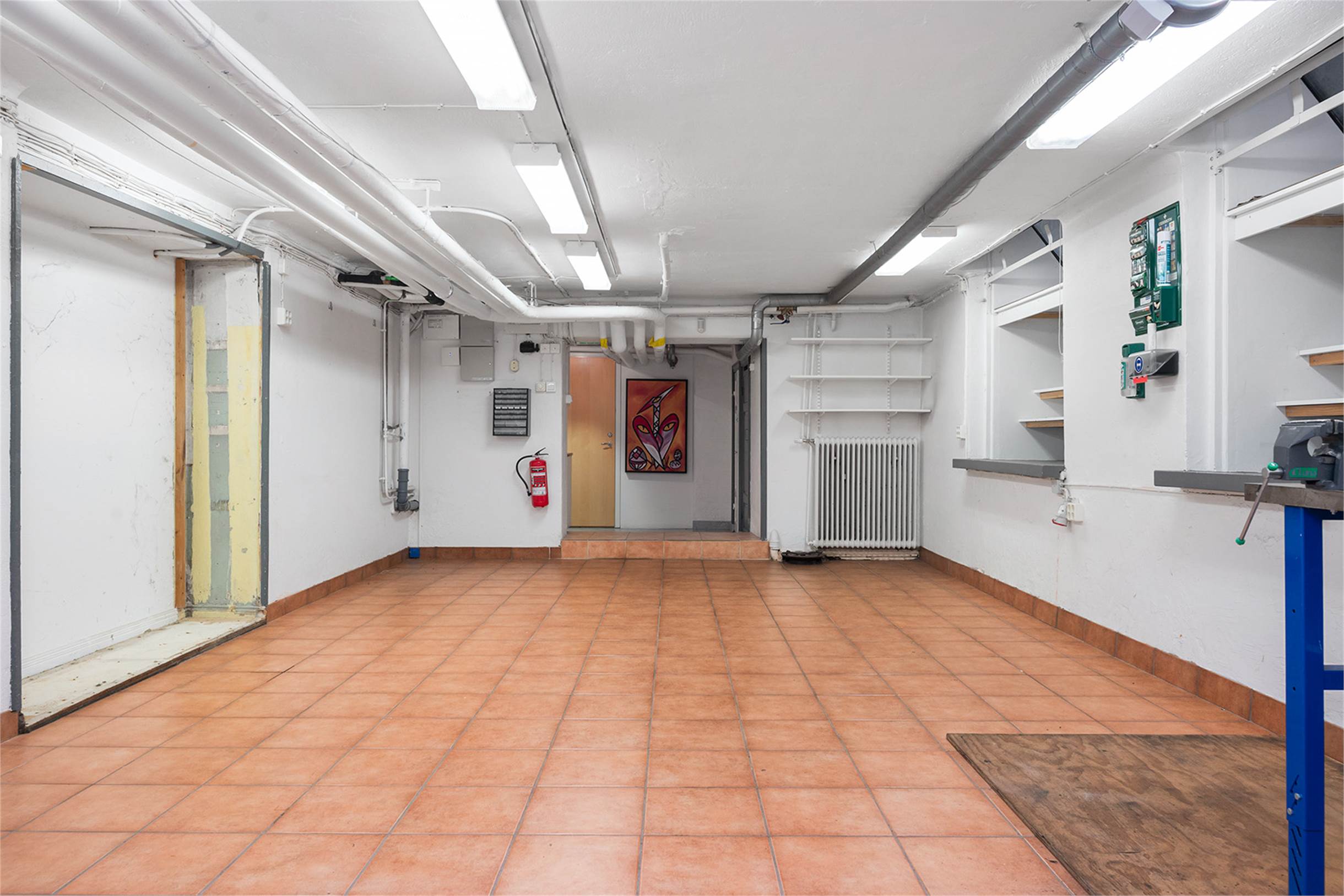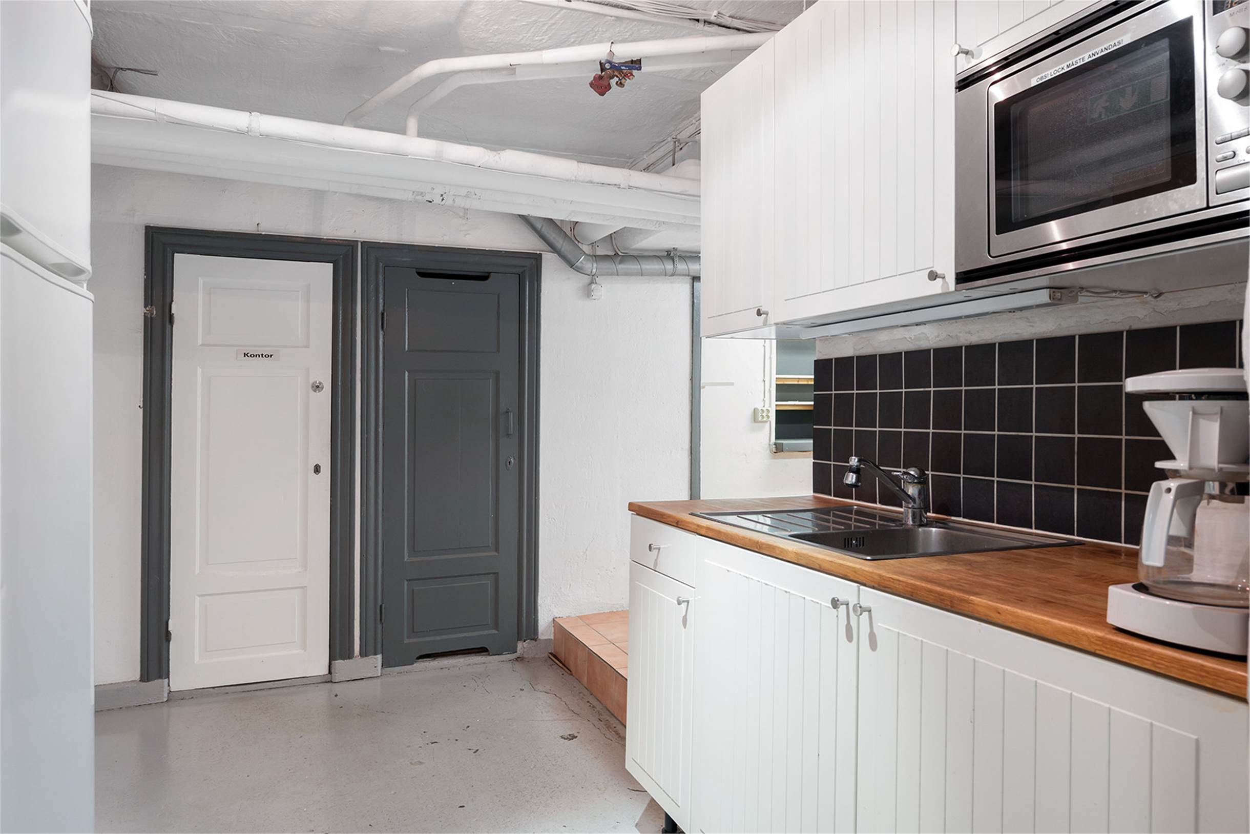 Butiken utgörs av två rum där den ena delen passar som både butik och kontor. Här finns goda exponeringsytor och plats för kassa och även en toalett i anslutning till butiken. En trappa leder ner i lokalens rymliga källare där man kommer ned till ett rum som kan nyttjas som matplats eller konferensrum. Vidare in i lokalen finns två stora rum som idag använts som verkstad och lager. Längre in i källaren finns ett lager som har duschkabin och tvättmaskin samt toalett, pentry och ett rymligt kontor. Pentryt är utrustat med kyl och frys, micro och diskho.
