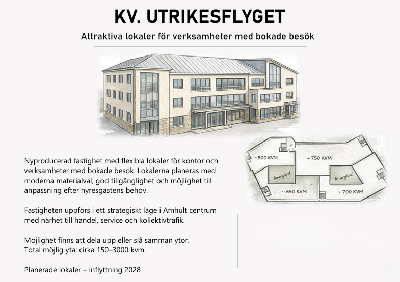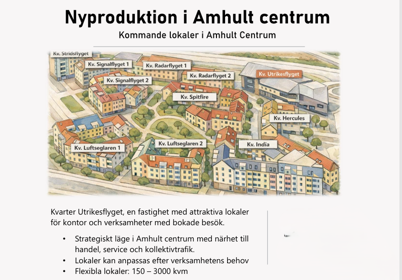 Fastigheten är belägen i Amhult centrum – ett växande område med närhet till handel, service och bostäder. Här skapas en modern stadsdel med god tillgång till det mesta som behövs i vardagen.
