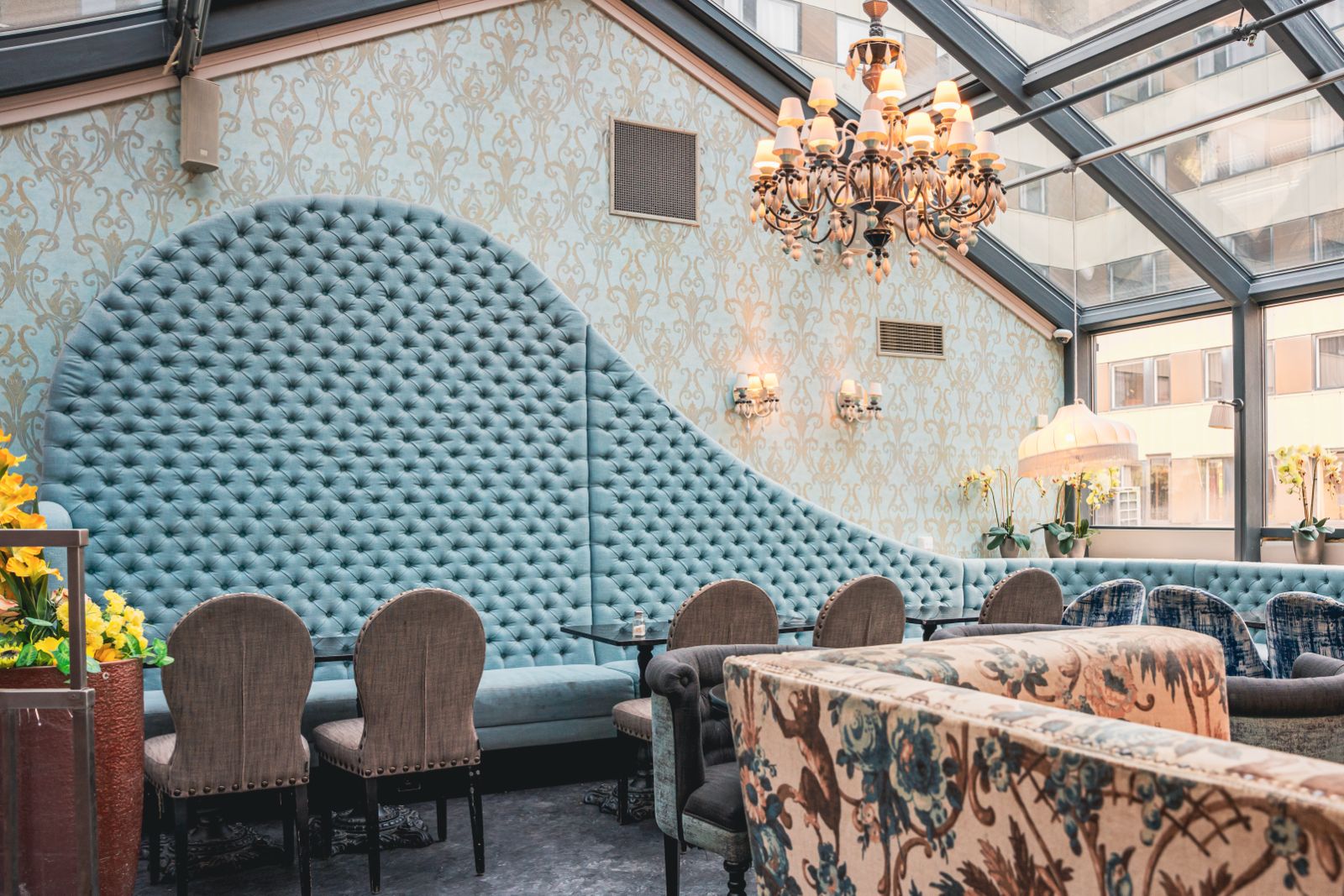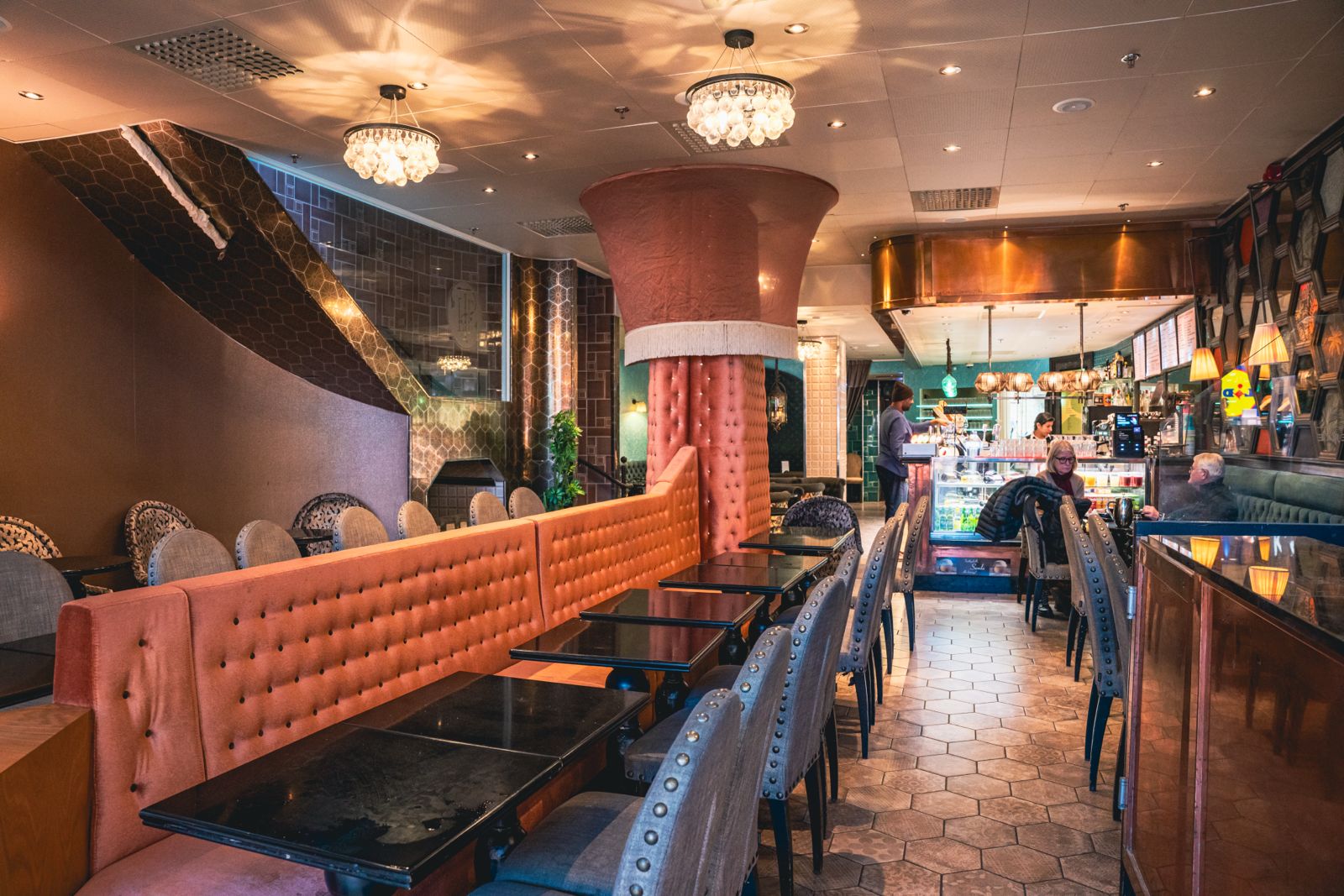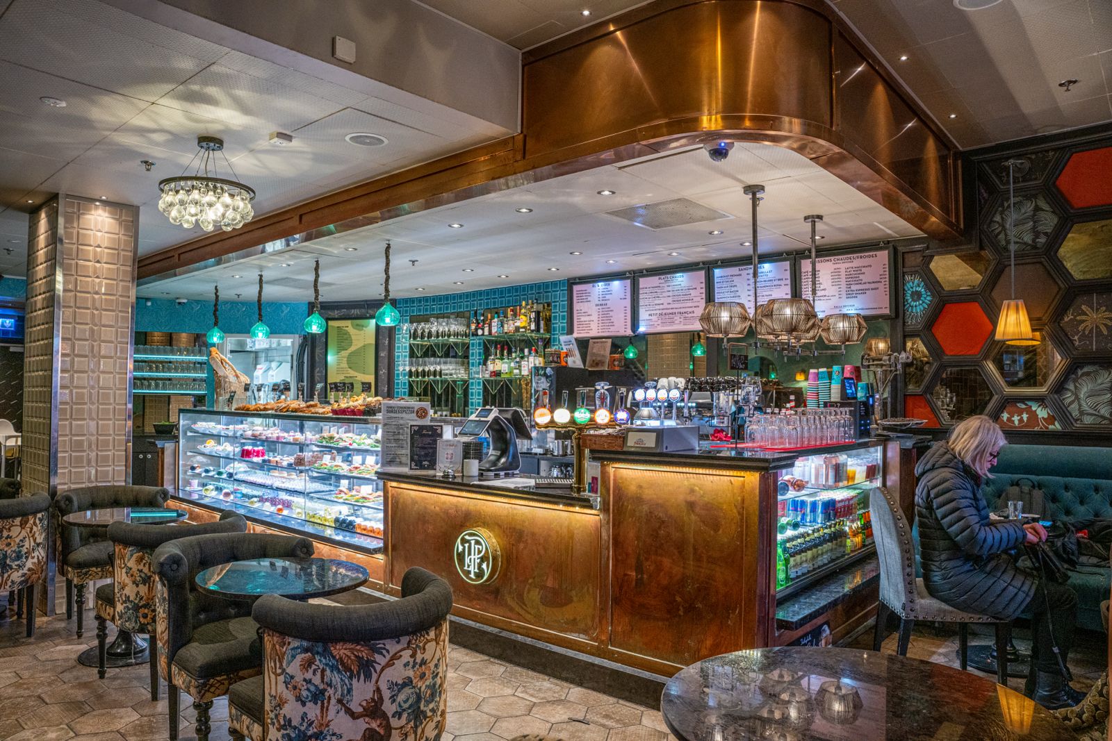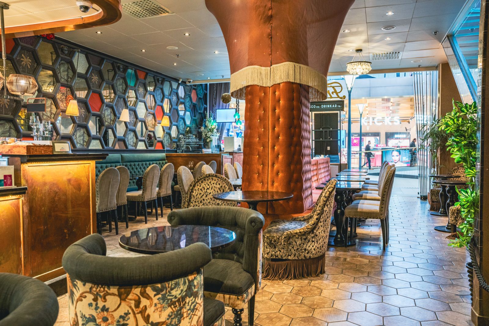 Caféet/Restaurangen erbjuder en elegant och inbjudande miljö med fransk inspiration, generösa sittplatser både för snabba besök och längre stunder, samt en stilfull inredning som skapar en premiumkänsla.