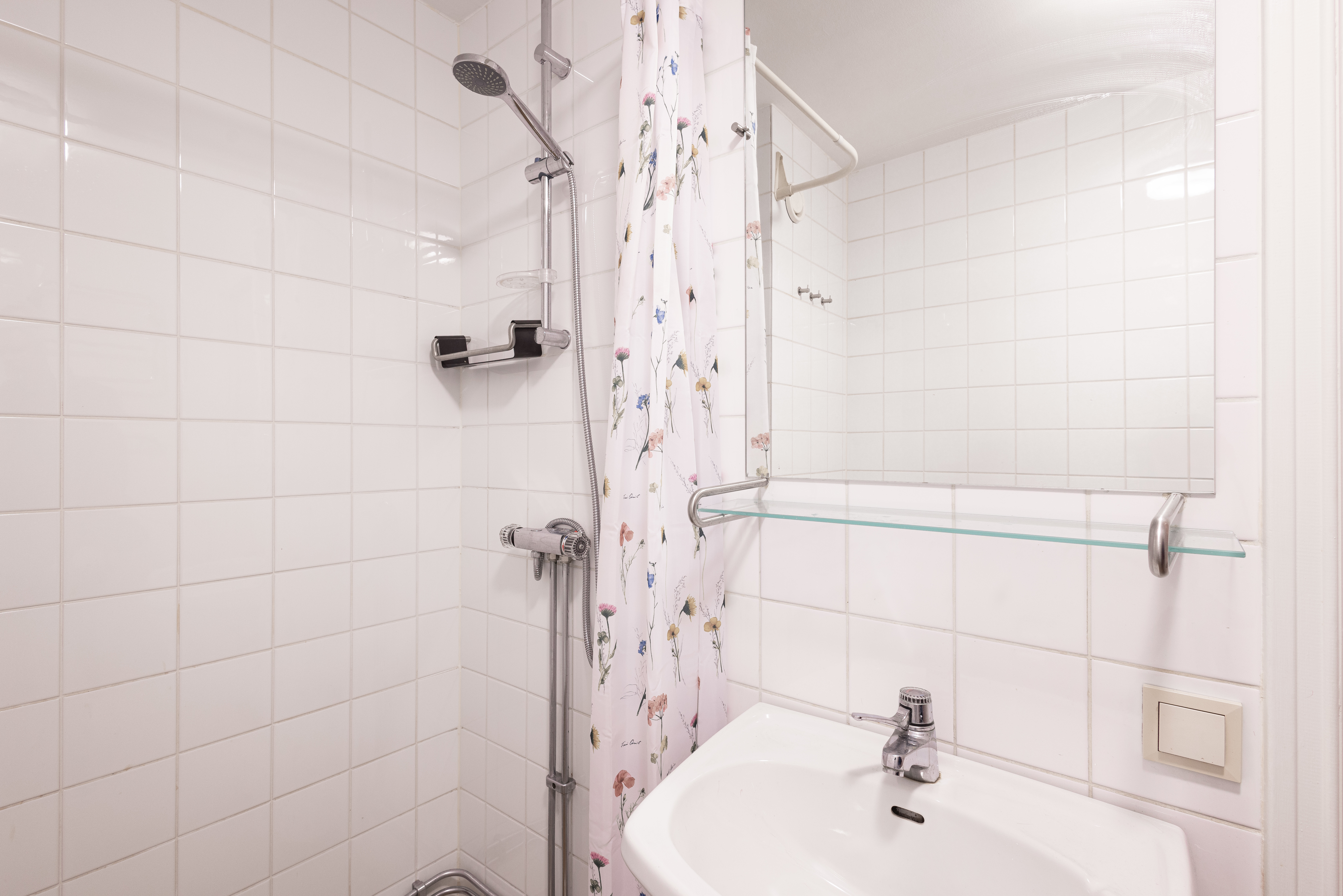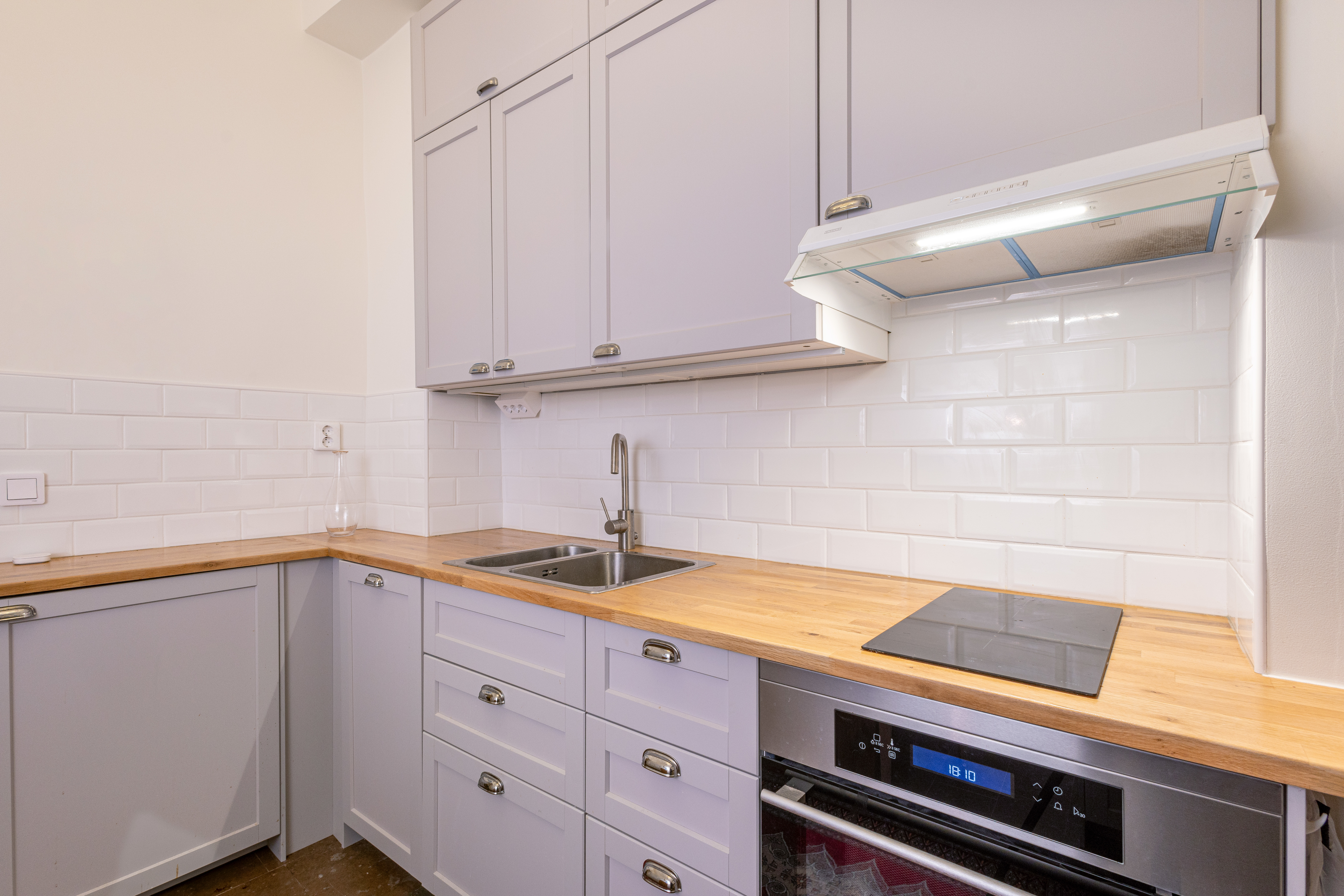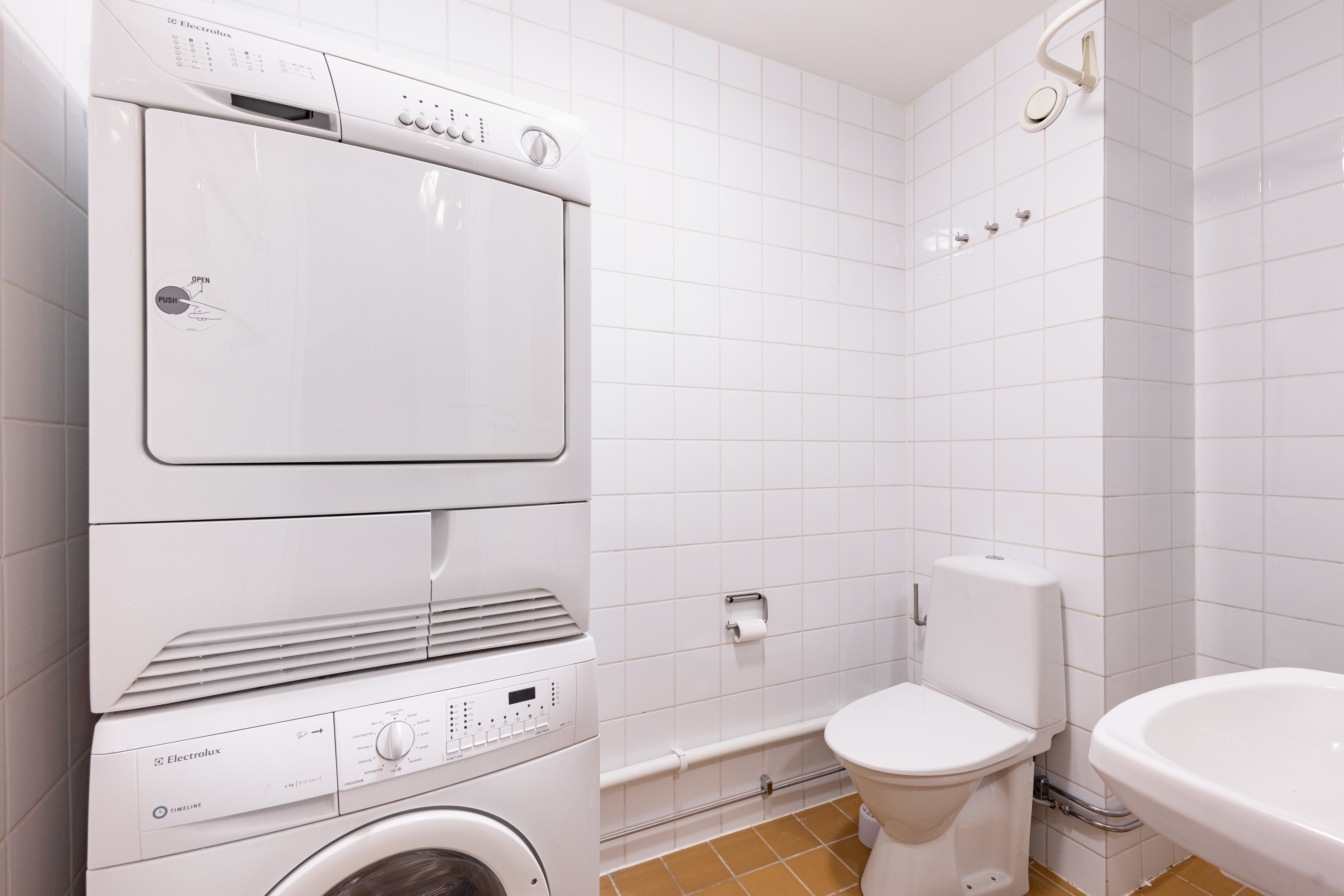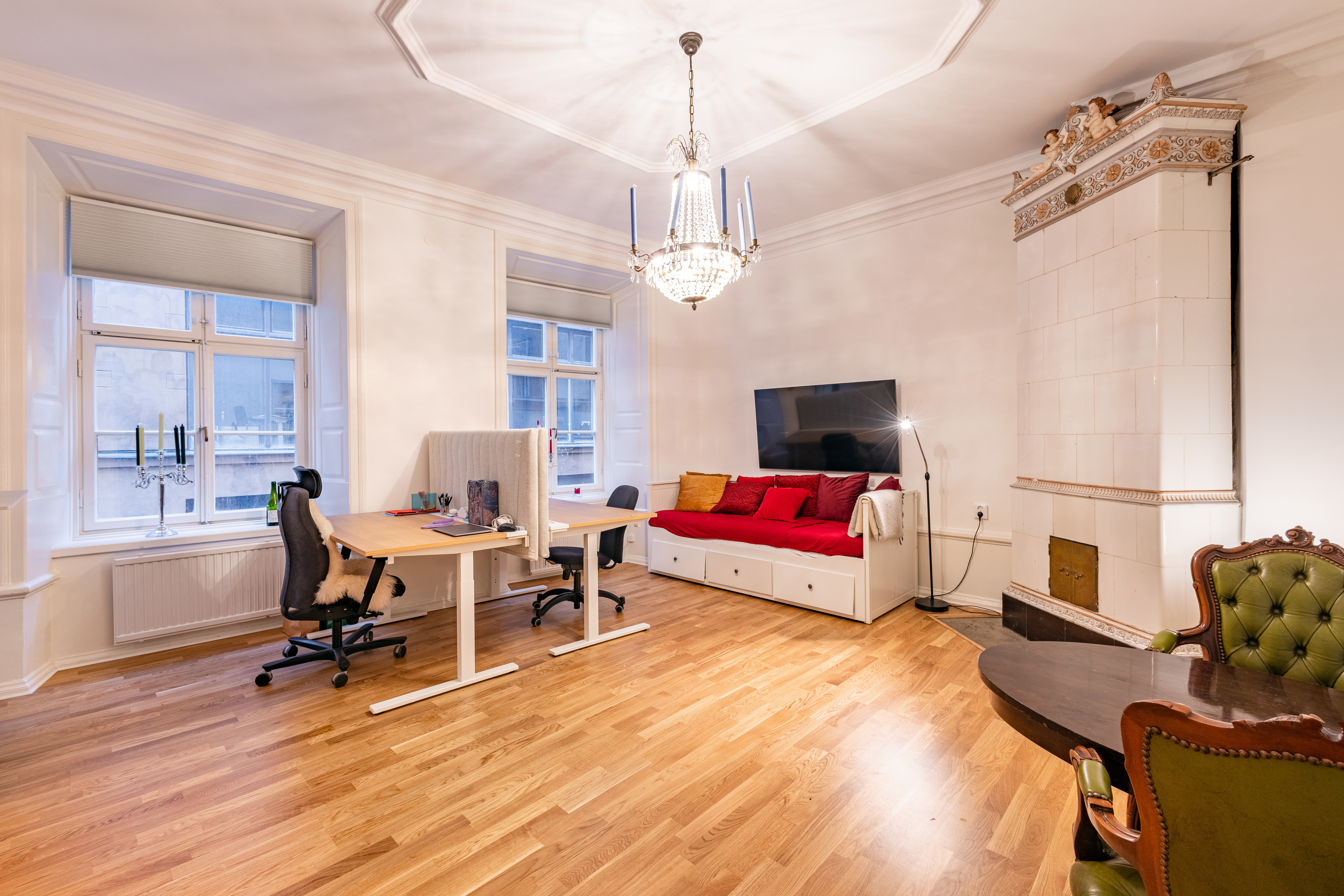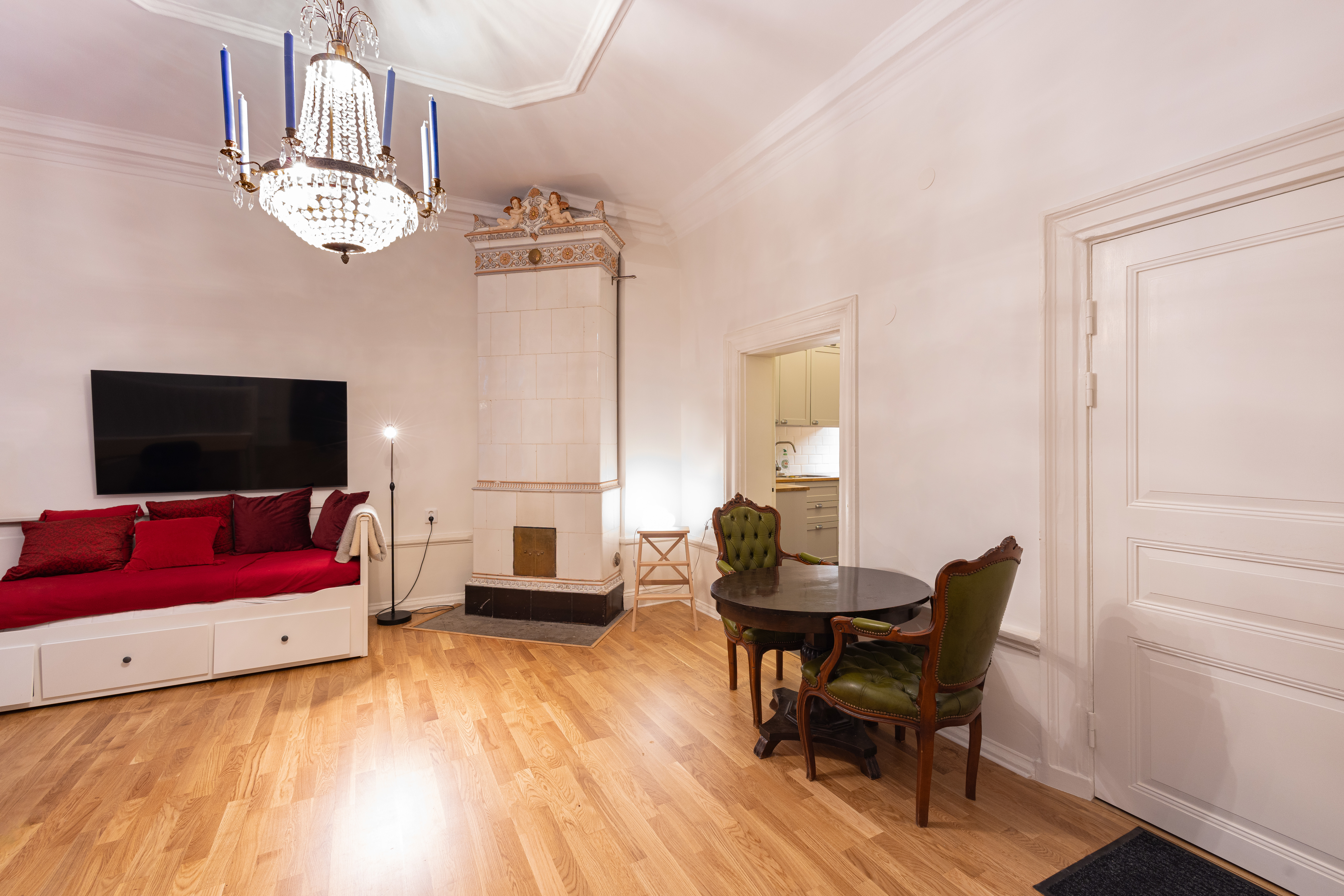 Köket är fullt utrustat och nyrenoverat, det stora rummet rymmer både arbetsplatser och umgängesyta, och den klassiska kakelugnen ger karaktär utan att ta över. Till vänster ligger sovrummet med ett stort badrum, dusch samt tvätt- och torkmöjligheter.