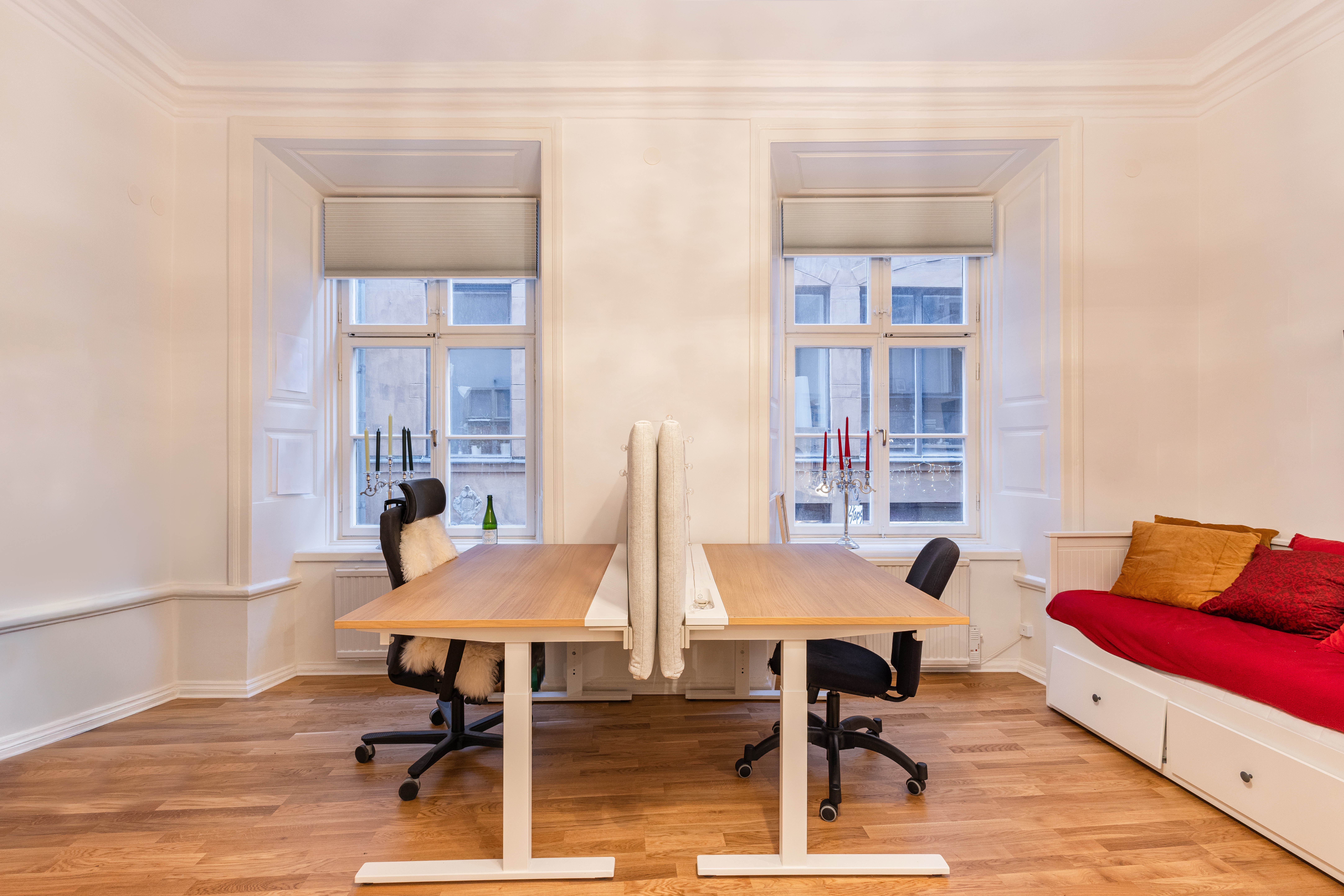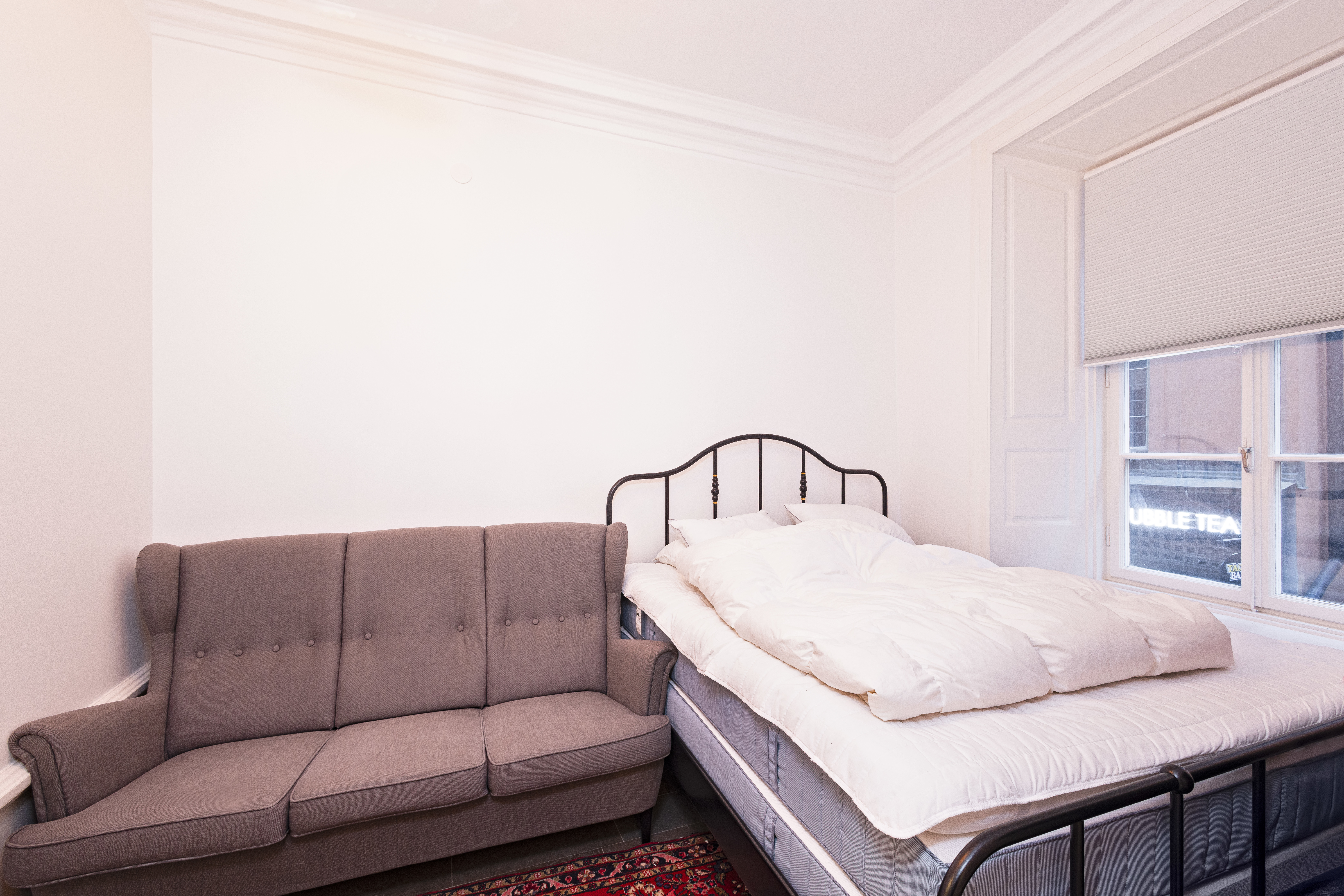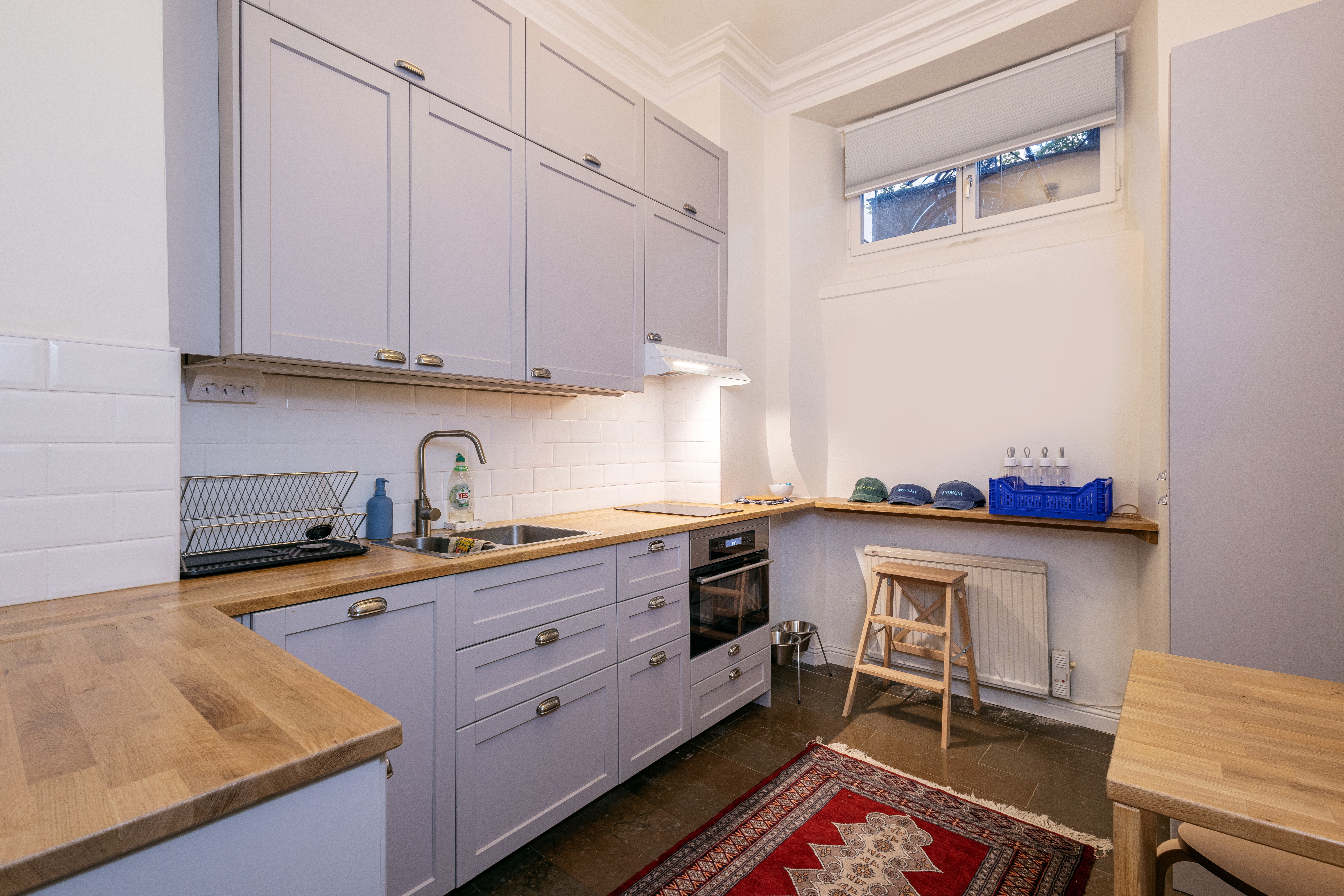 Lokalen är redan renoverad och inredd som en lägenhet med alla bekvämligheter du kan önska. Entré från gatan leder ner en trappa, men redan när du kliver in förstår du att detta inte är en källare, två rum i fil med stora fönster mot Västerlånggatan fylls av naturligt ljus och ger en oväntad rymd.
