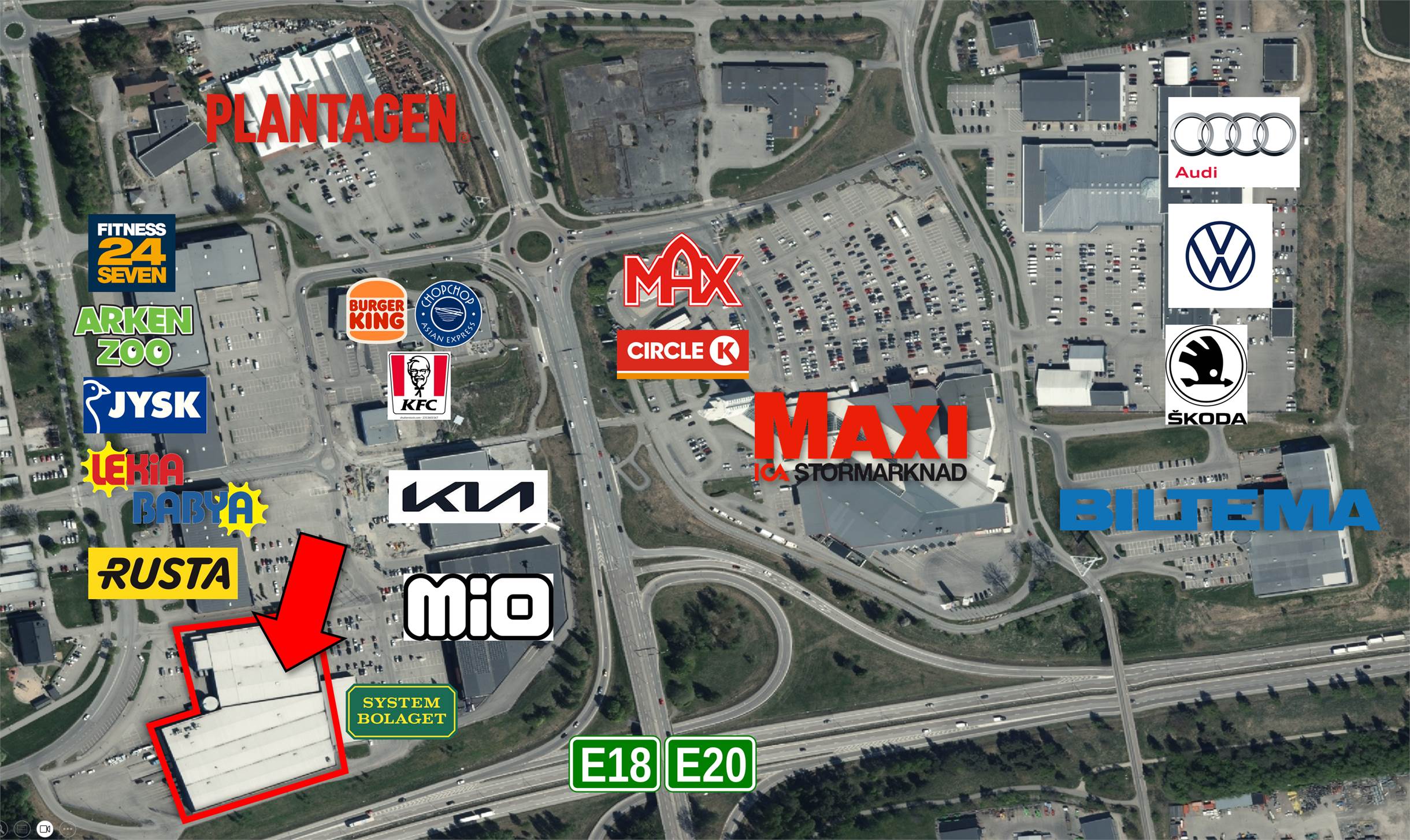 Fastigheten är redan hem åt Systembolaget och området är rikt på etablerade butiker såsom Rusta, MIO, Jysk, Lekia, ArkenZoo, Fitness 24/7, ChopChop, Burger King, KIA och Plantagen.I den östra delen av handelsområdet finns ytterligare stora företag som ICA Maxi, Max, Biltema, Volkswagen, Audi, Skoda med flera.