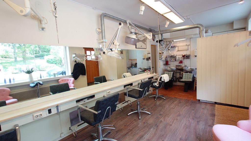 Lokalen är utrustad med 4 frisörstolar samt 2 schamponeringar, vilket skapar goda förutsättningar för både en mindre verksamhet eller ett växande team. Planlösningen är effektiv och trivsam, och med rätt omsorg kan salongen utvecklas till en mycket attraktiv arbetsplats och kundmiljö.