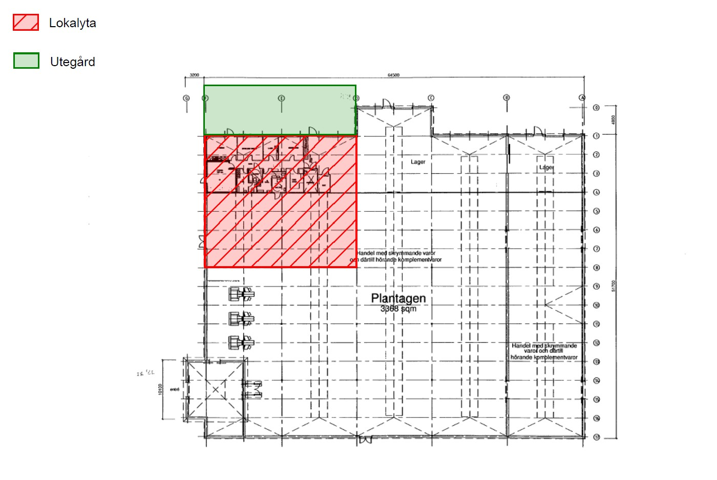 Lokalen har en minsta yta om ca 400 kvm och en maximal yta om ca 570 kvm. Lokalen har egen entré med tillhörande utegård.