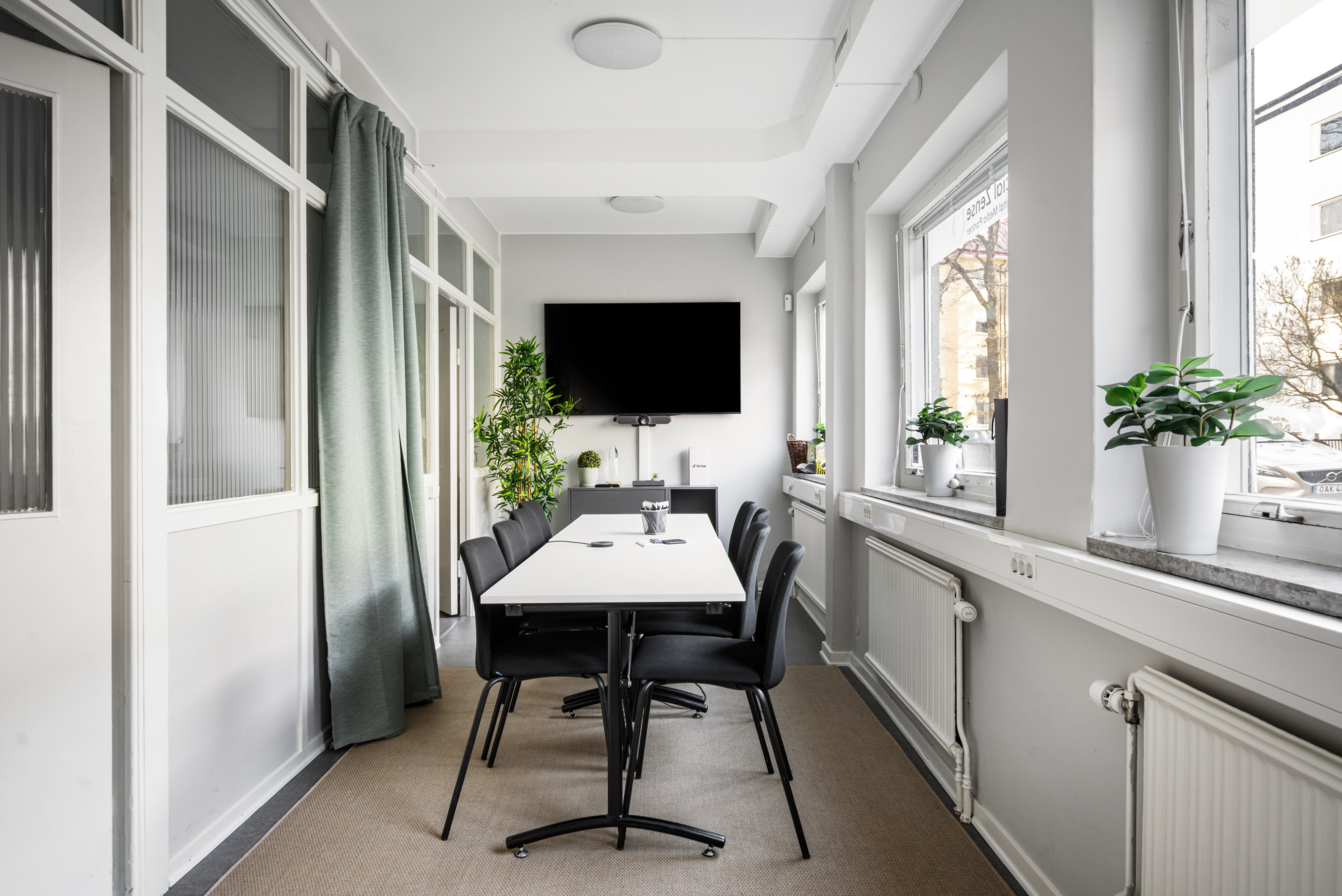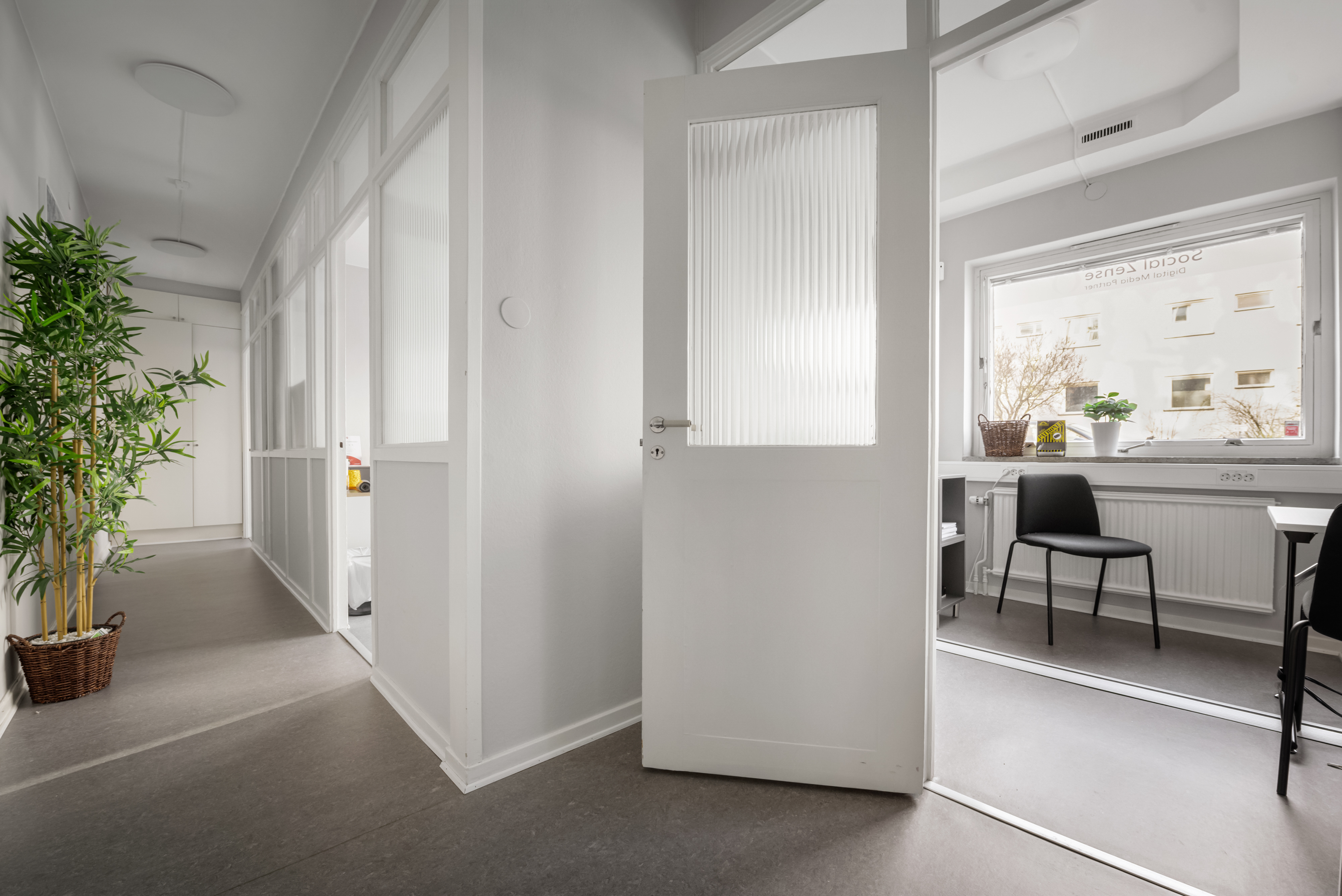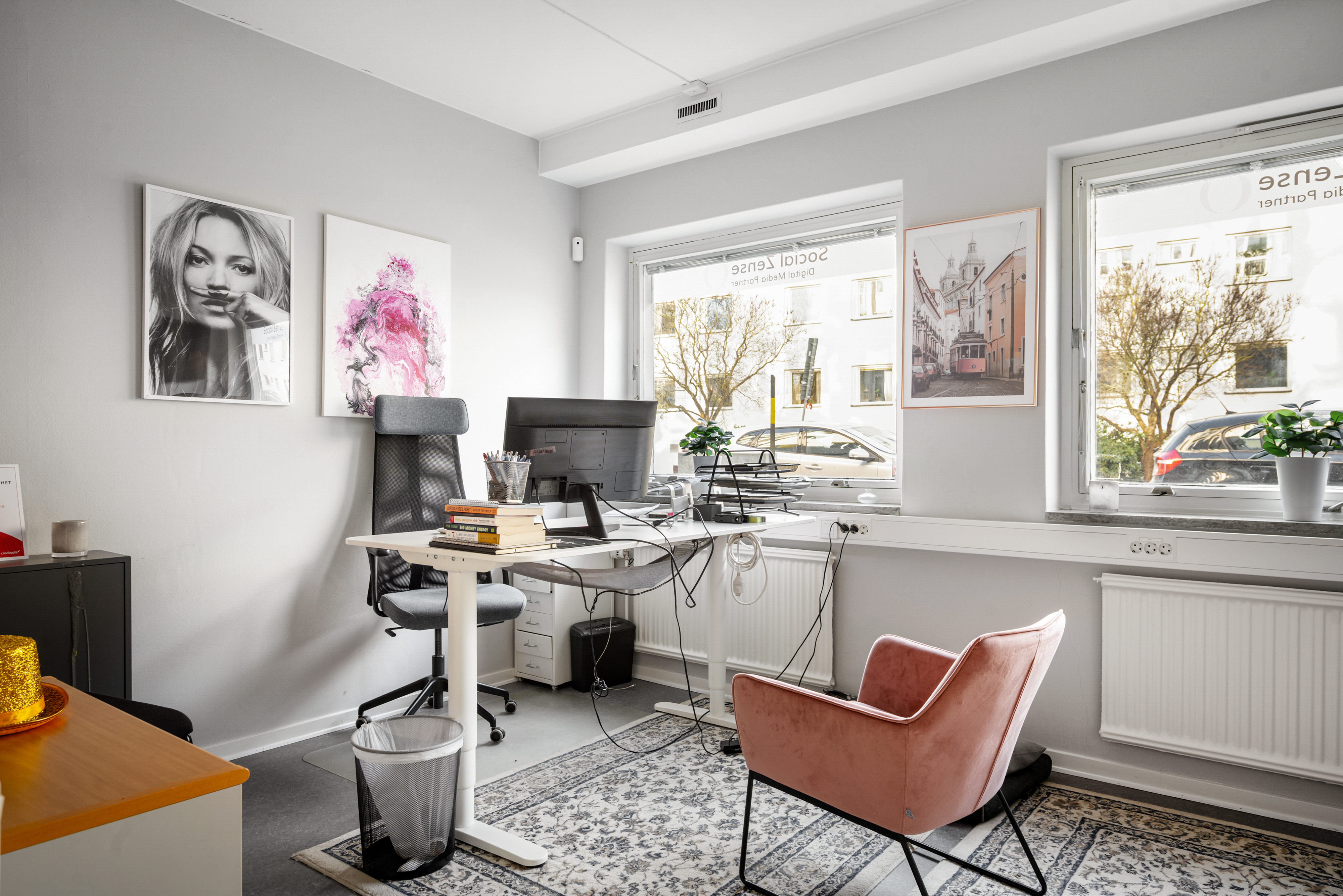 Flera av rummen har stora fönster mot gatan, medan andra vetter mot den lugna gården – samtliga med gott ljusinsläpp som skapar en ljus och behaglig arbetsmiljö.