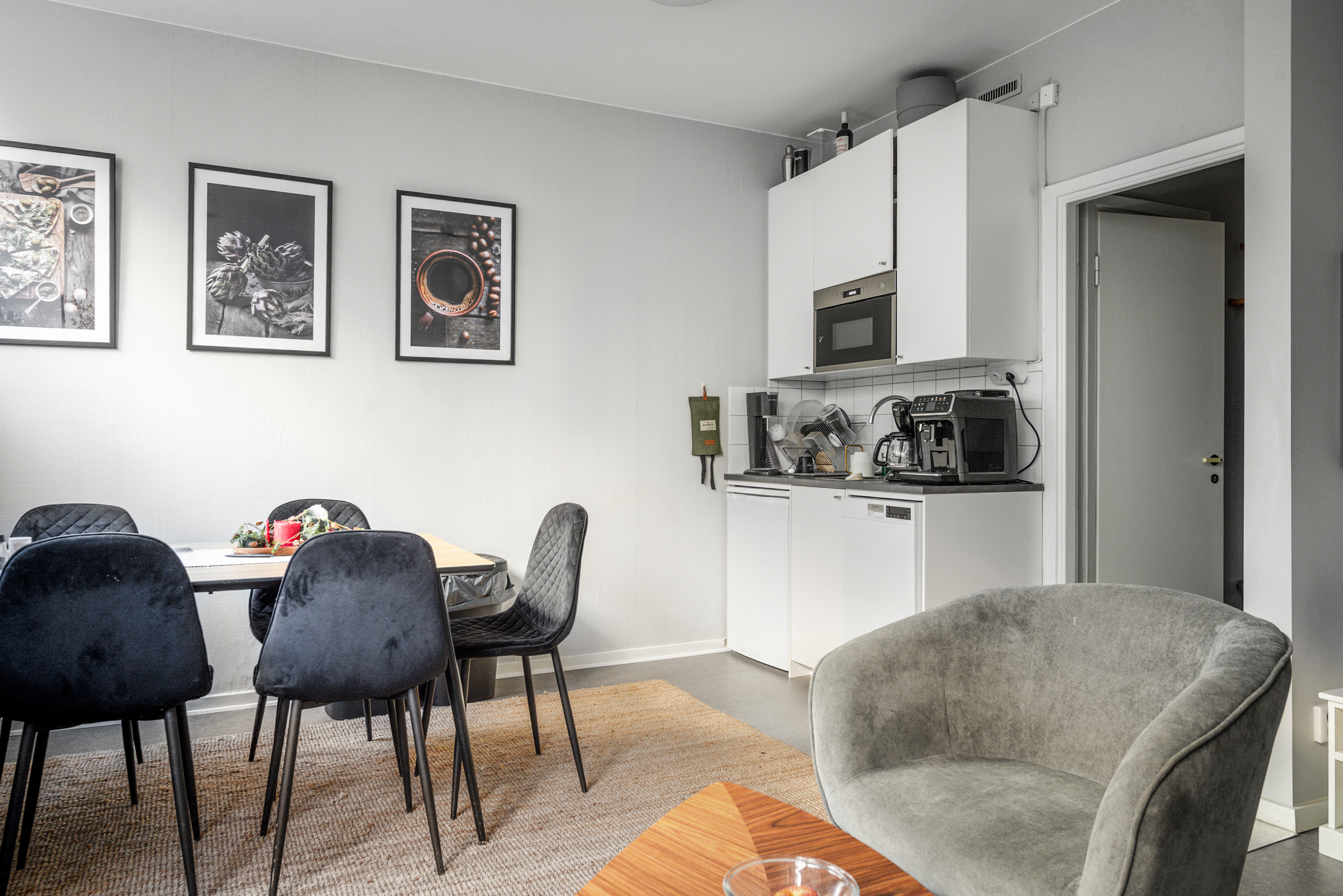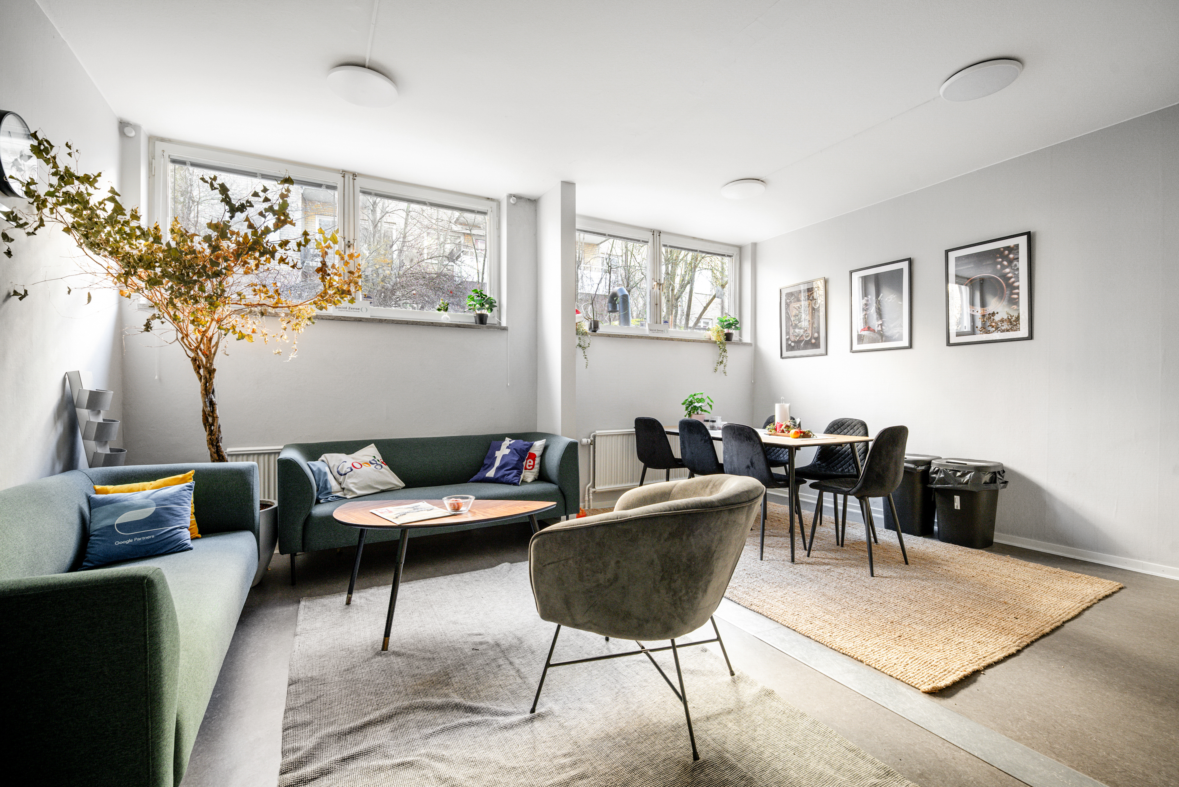 Kontoret har ett trivsamt kök med generös matplats och en inbjudande loungeyta, perfekt för pauser, informella möten eller gemensamma luncher.