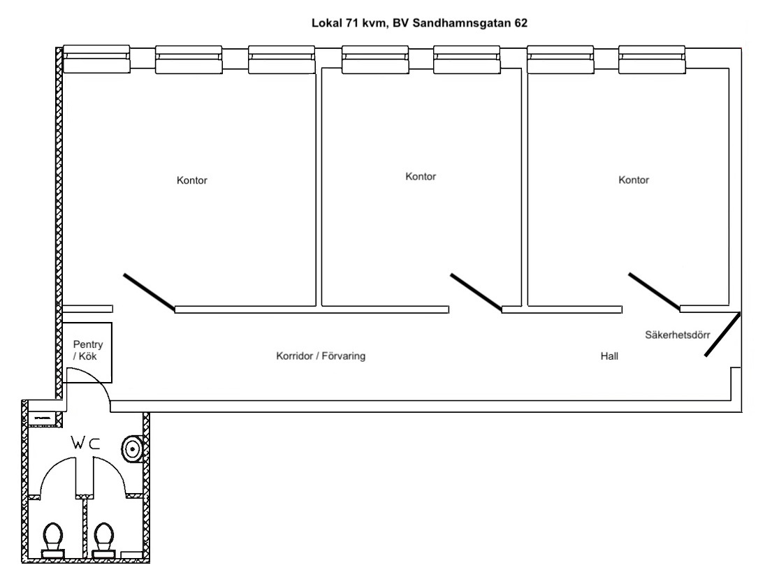 När du stiger in i lokalen möts du av en välkomnande entré. Övrig lokalarea utgörs av två wc, tre ljusa kontorsrum i bra storlekar samt ett socialt pentry placerat i korridorsytan längt in lokalen.
