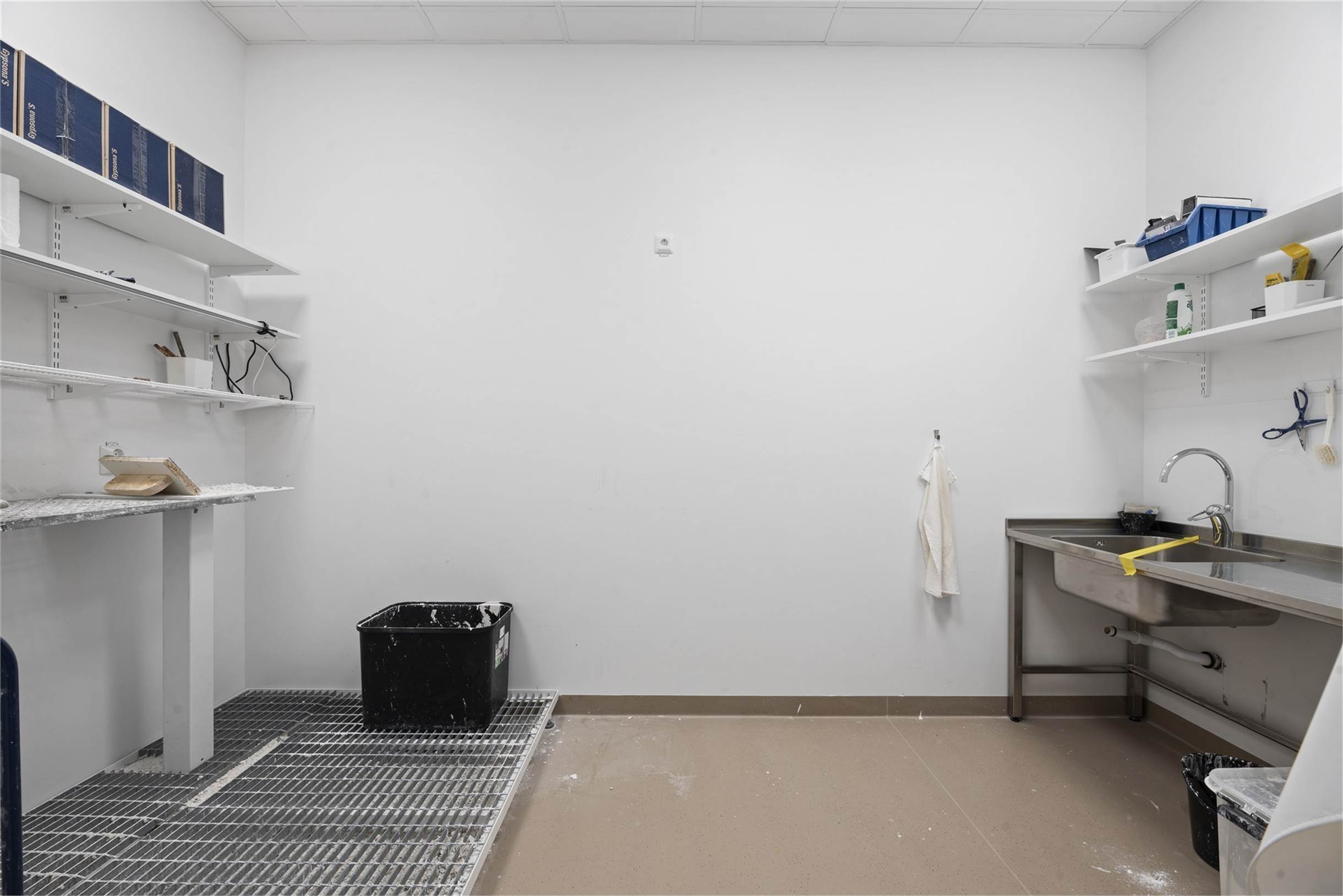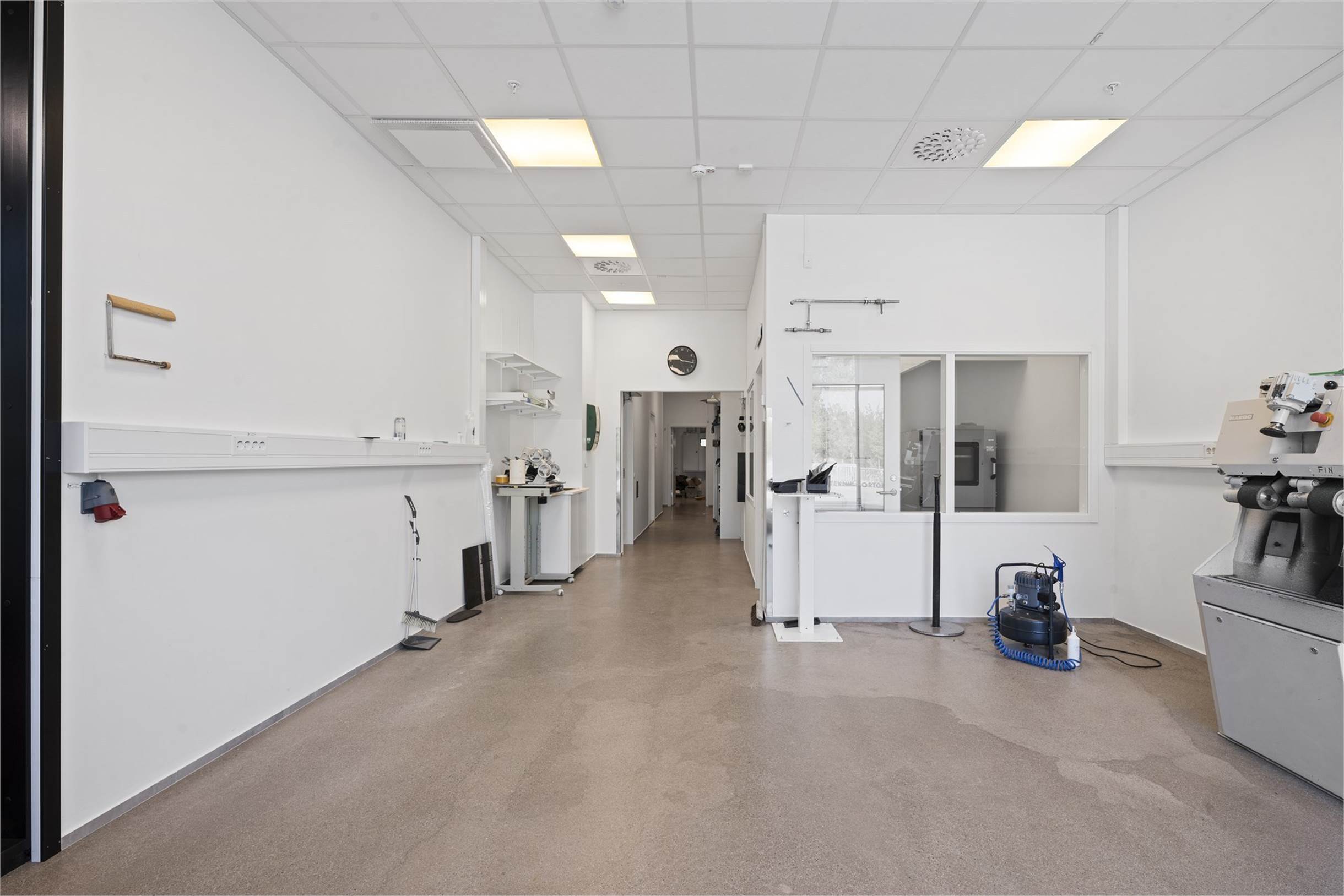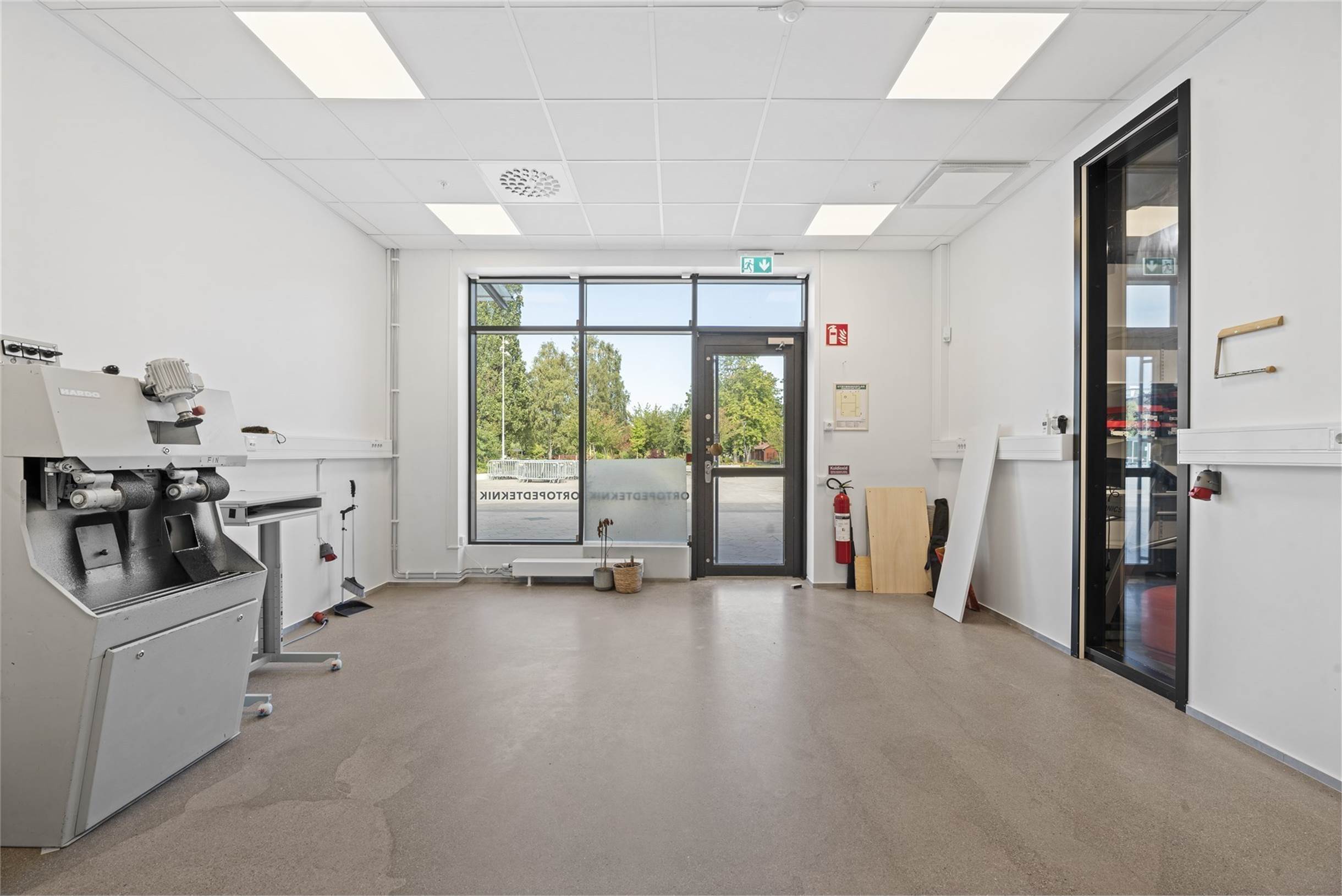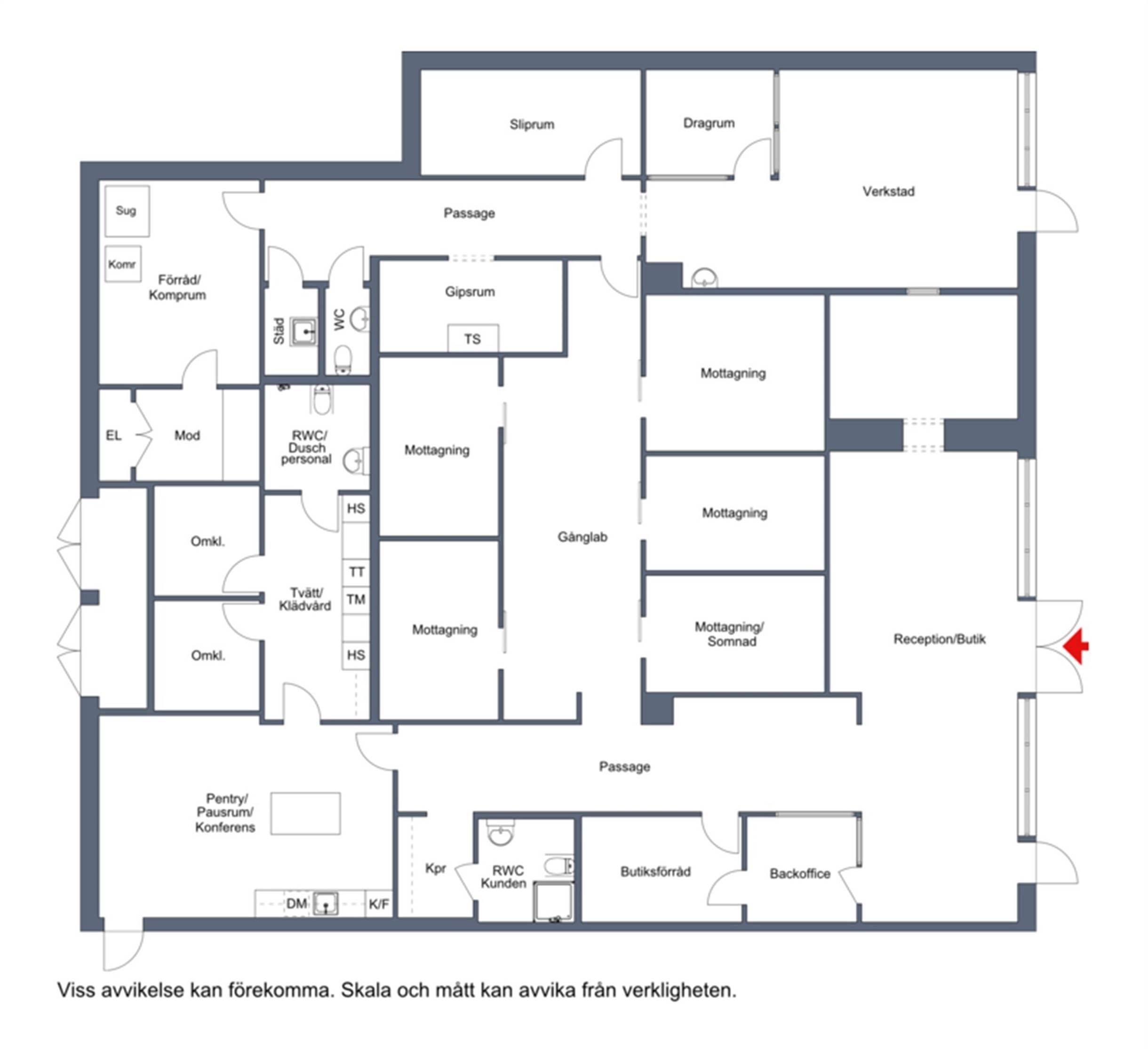Lokalen har två ingångar, båda ingångarna vetter ut mot stadsparken. I den främre delen finns en rymlig butiks del, här finns det även utrymme för förvaring i form av platsbyggda garderober samt ett förråd. Vidare finns ett rymligt modernt kök, 2 RWC, tvättstuga samt 4 kontorsrum. Vidare finns en verkstads del med egen ingång, här finns det flera rum såsom torkrum, sliprum etc.