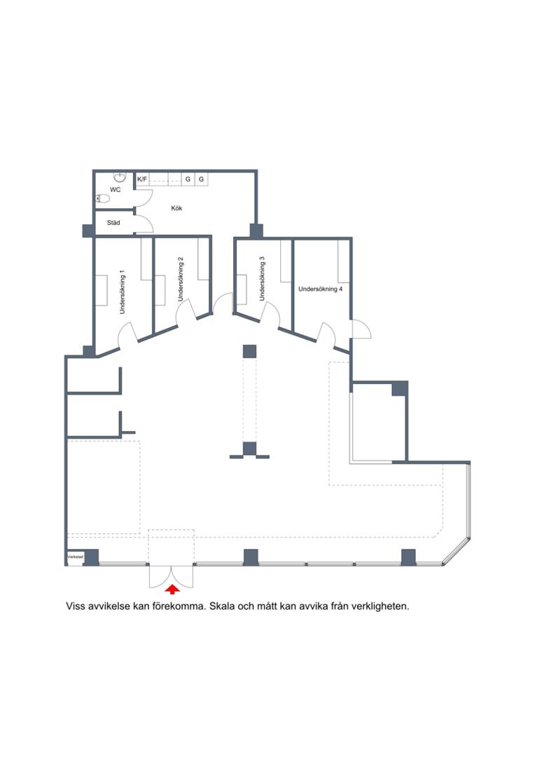 Lokalen välkomnar med en stor och öppen yta i direkt anslutning till entrén. Vidare in i lokalen finns avdelade rum med glaspartier som lämpar sig väl för kontorsplatser, möten eller samtalsrum. Den öppna planlösningen gör det enkelt att anpassa ytorna efter verksamhetens behov.