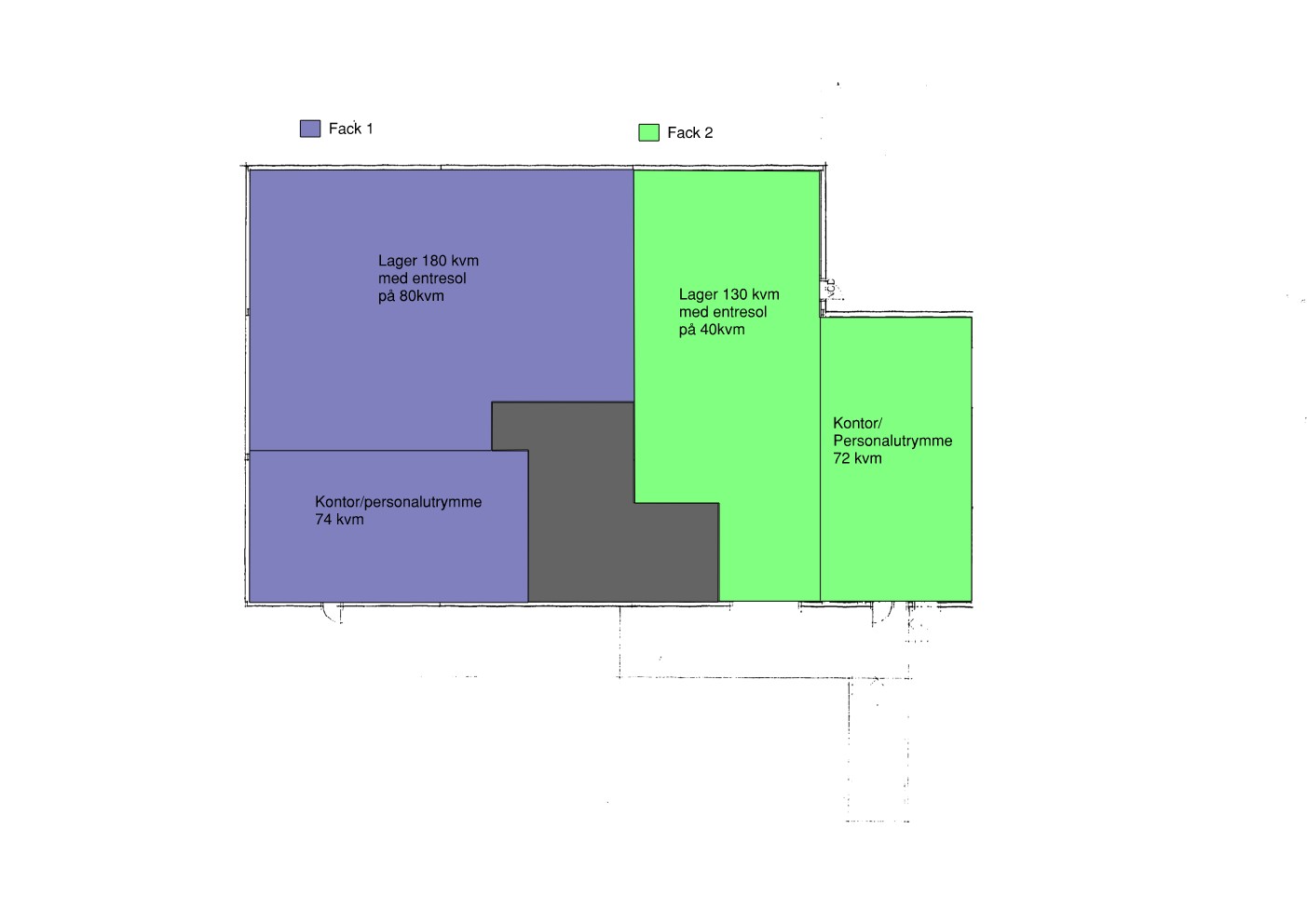 Fack 1 – Lager, kontor och personalutrymmen (180kvm lager, 80kvm entresol, 74 kvm kontor).