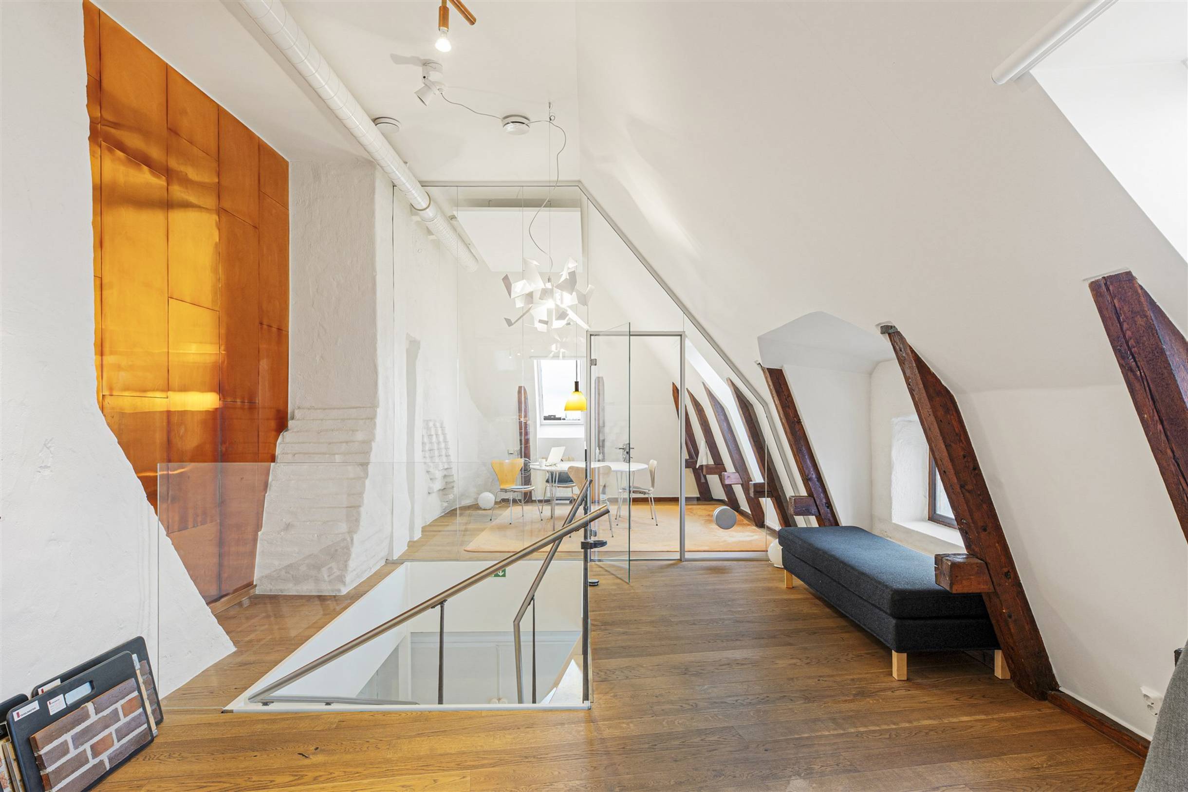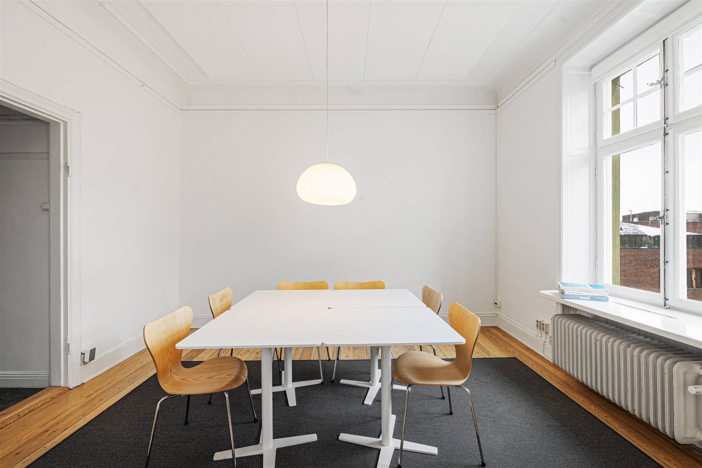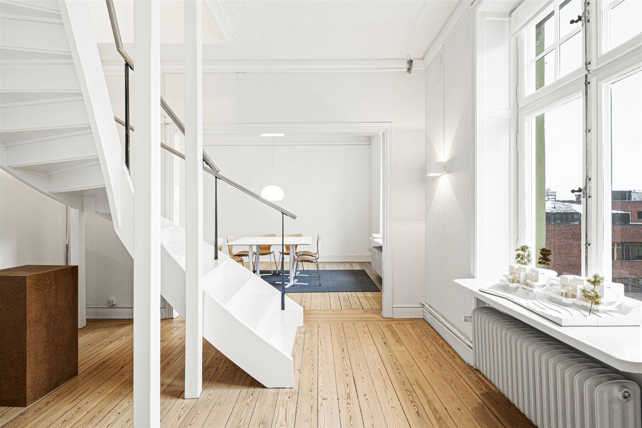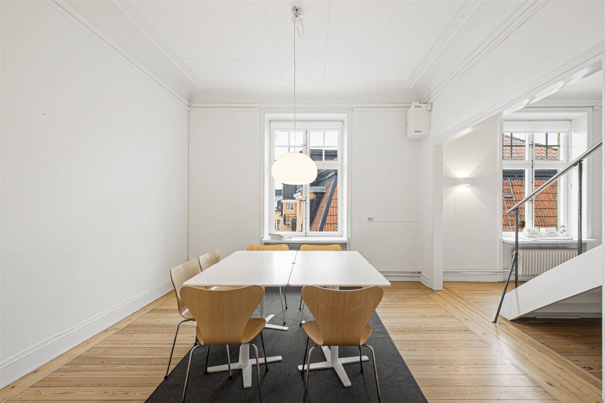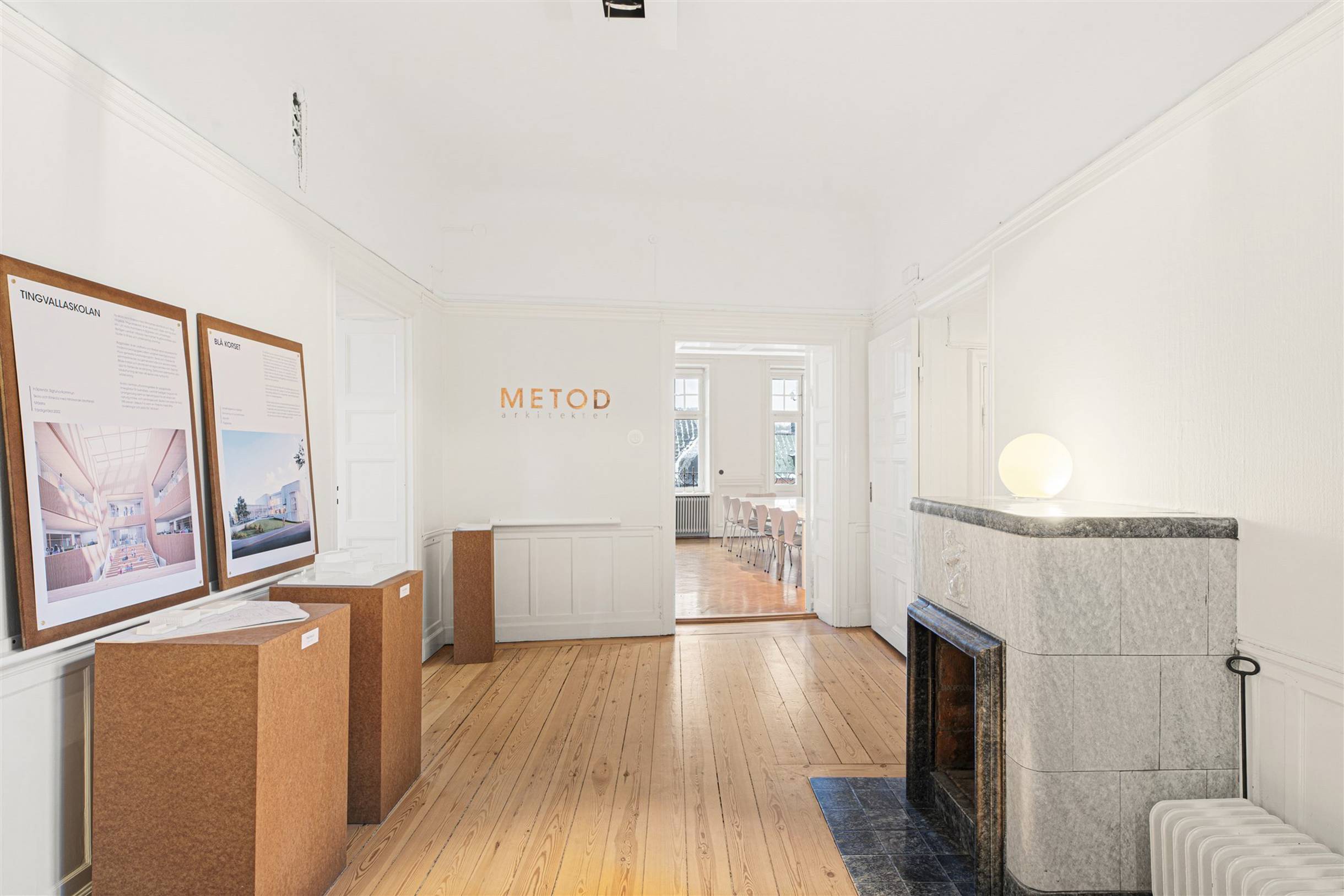 Kontorsytorna återfinns på fjärde våningen och möjlighet finns att hyra upp till åtta kontorsplatser fördelade på två kontorsrum (se gul markering i planritning för hyresledig yta). Ytskikten är genomgående ljusa och stora fönster som erbjuder generöst naturligt ljusinsläpp i kombination med en väl tilltagen takhöjd skapar en känsla av rymd. Kontoret delas med Metod Arkitekter och tillgång finns till gemensamt kök, matsal, konferensrum och wc. Våningsplan fyra nås med hiss.