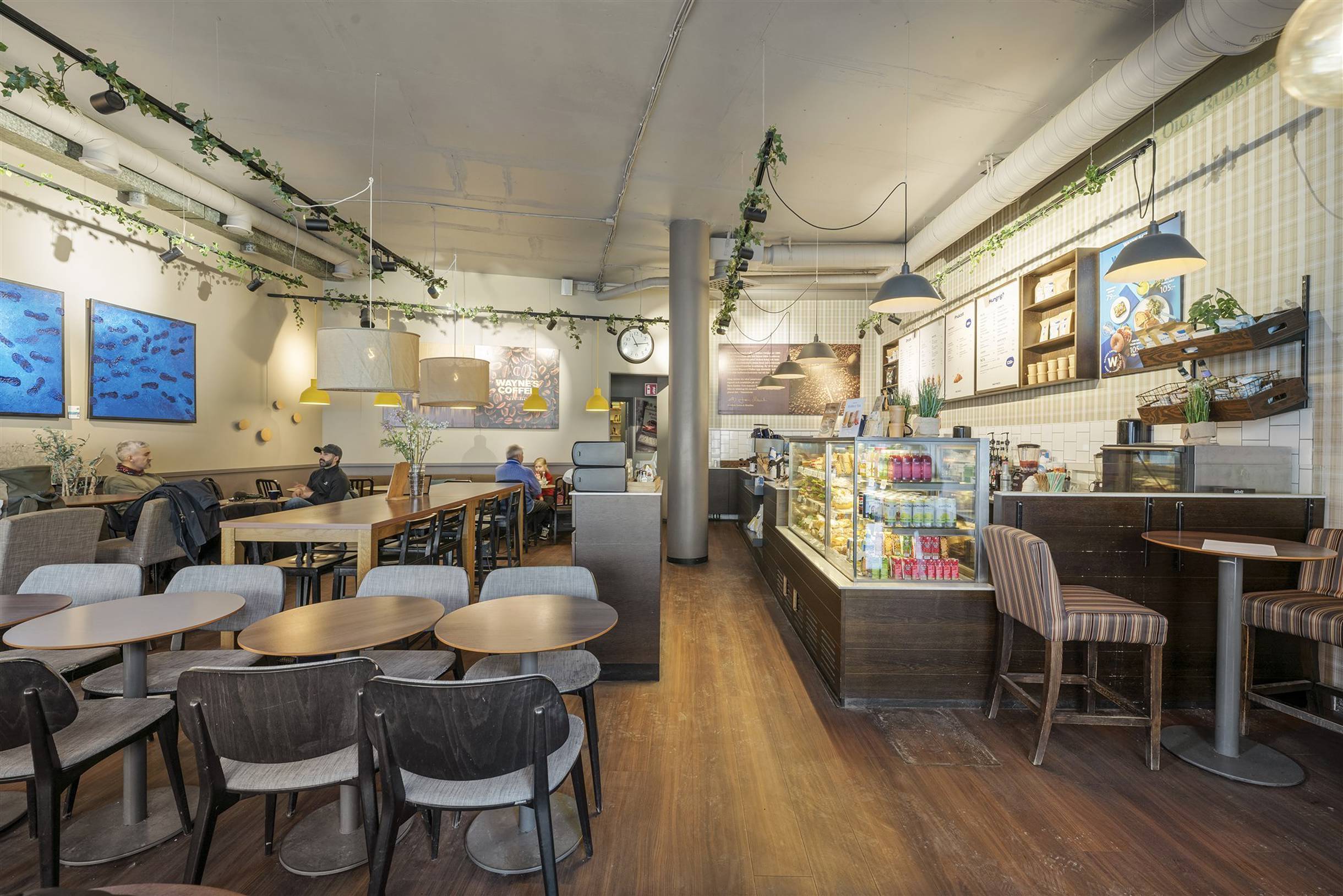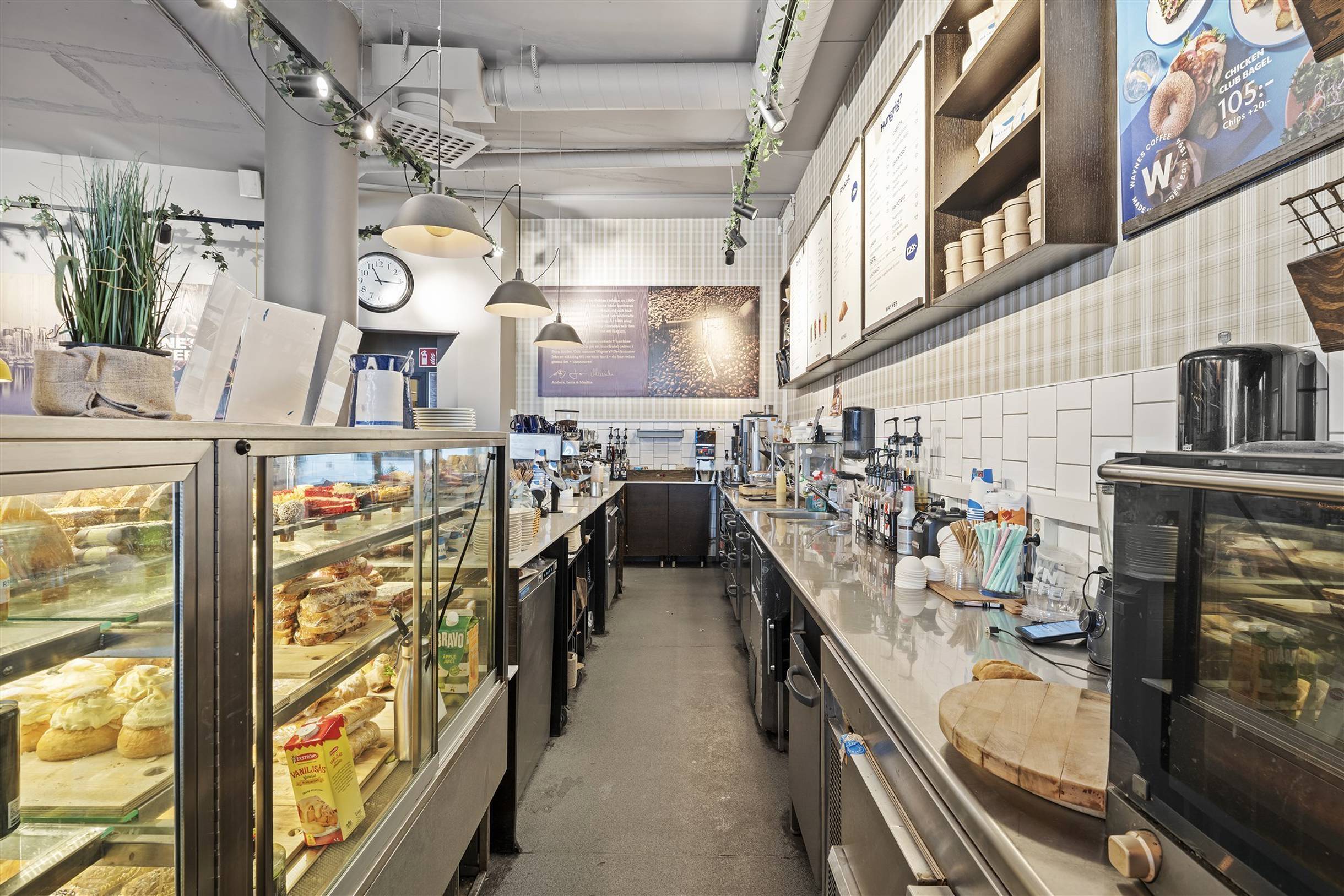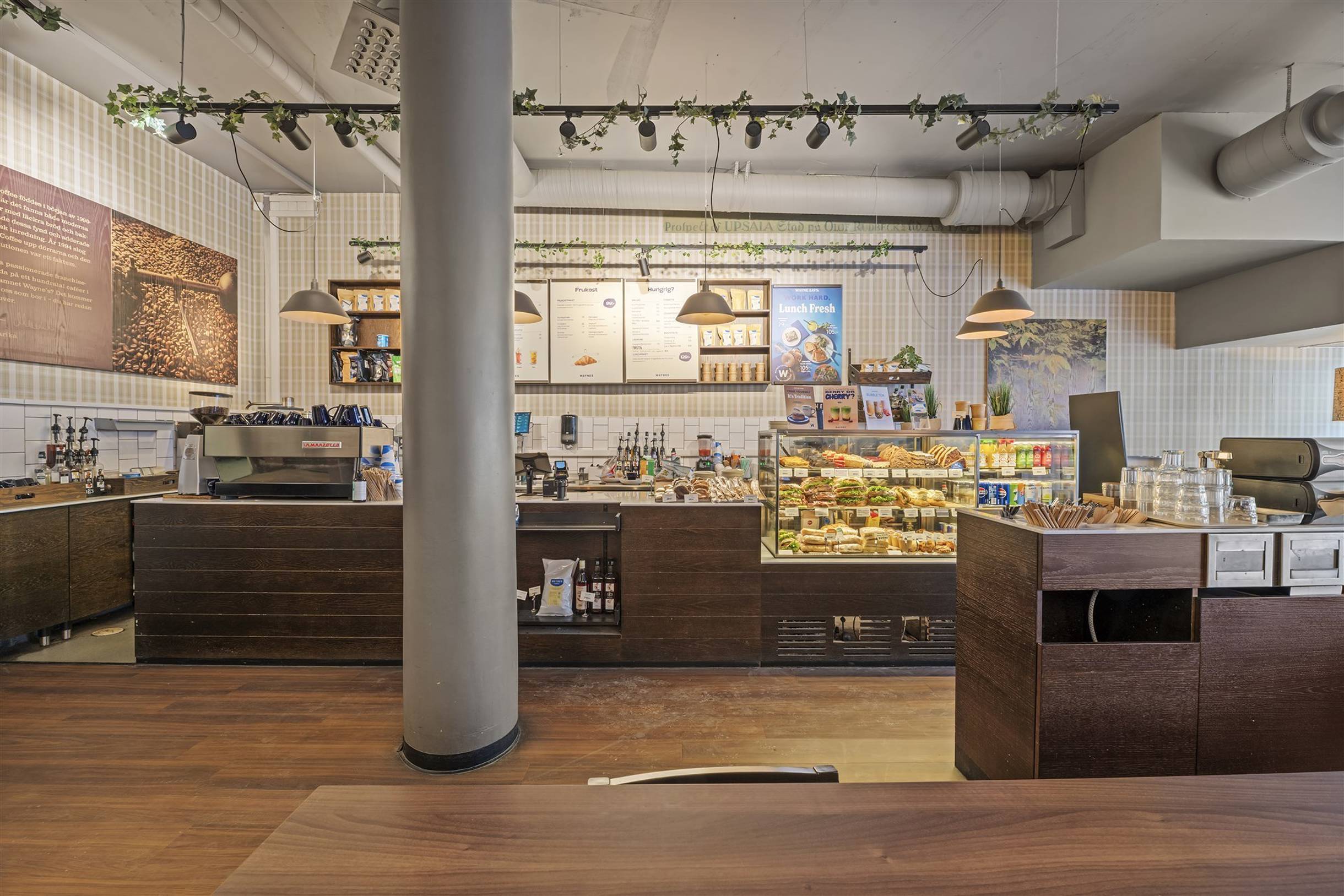 Trivsam och inbjudande cafélokal med öppen planlösning. När du kliver in i lokalen möts du av en stor och öppen cafélokal, här erbjuds det plats för 40-50 sittande gäster. I direkt anslutning till entrén återfinns kassan med bra utrymme för arbetsyta, kylmontrar och kaffe maskin. Vidare in i lokalen finns gott om förvaring med plats för disk samt prepp kök, det finns även personal toalett med tillhörande omklädningsrum. I lokalen finns det även en kundtoalett.