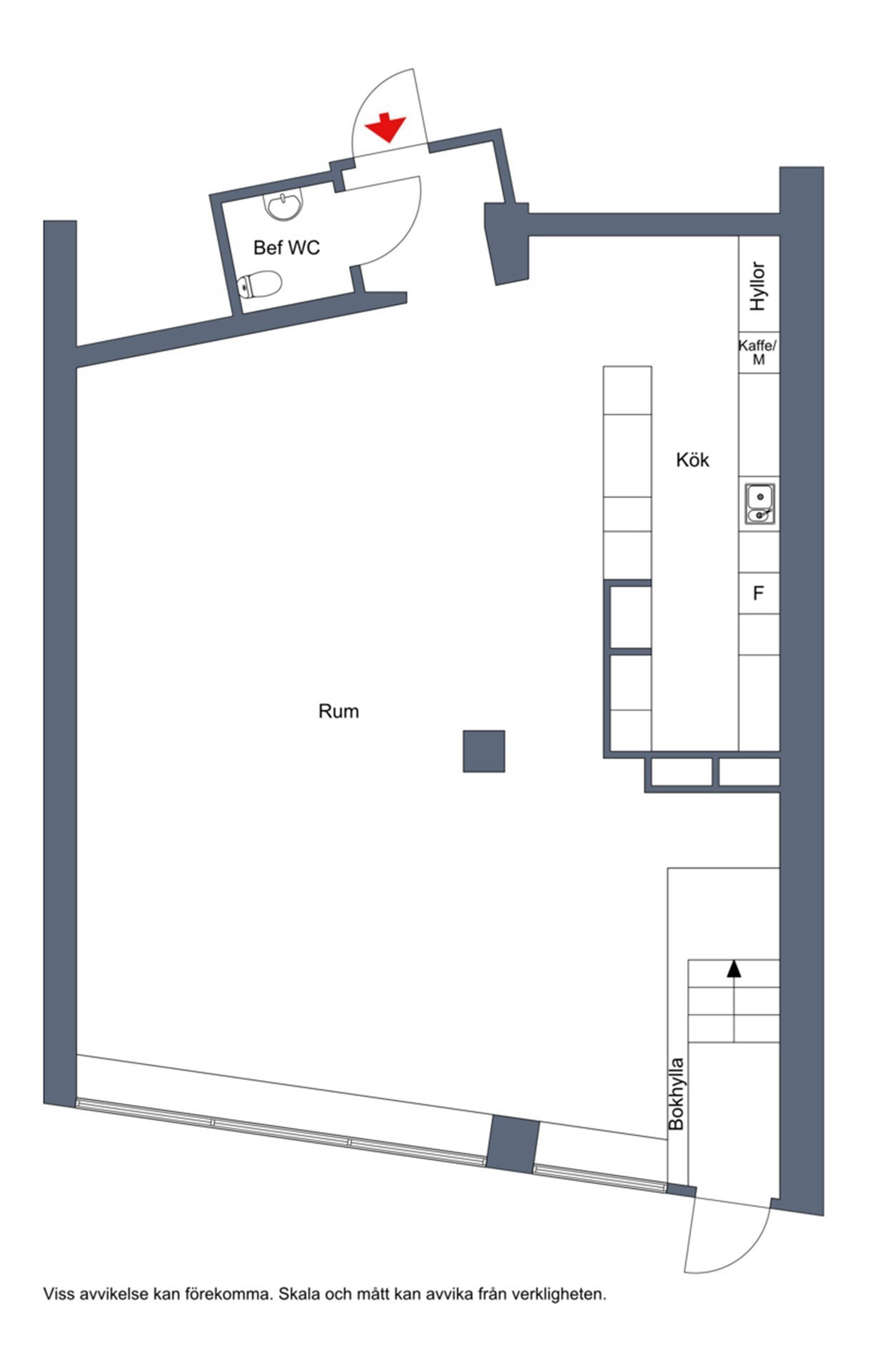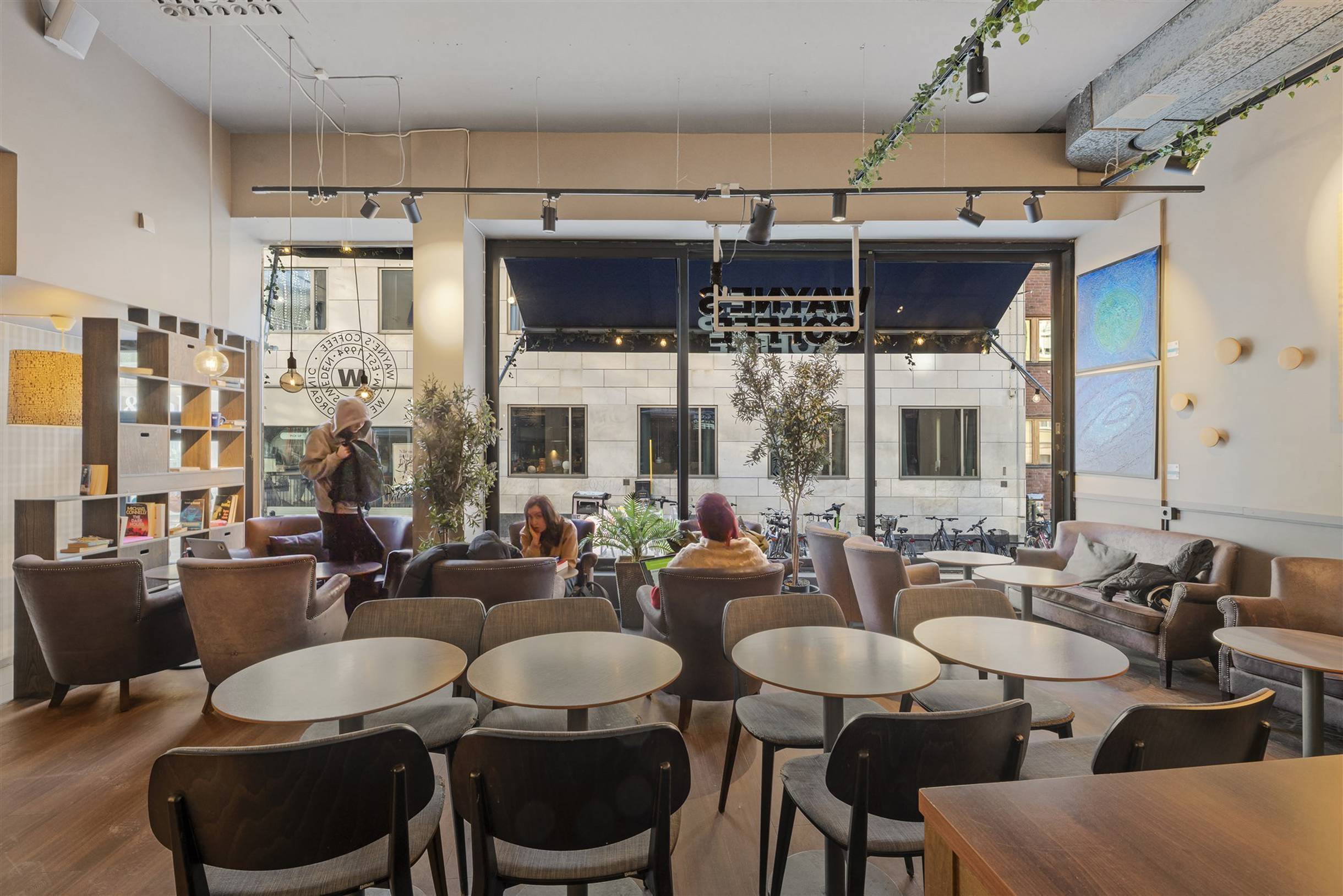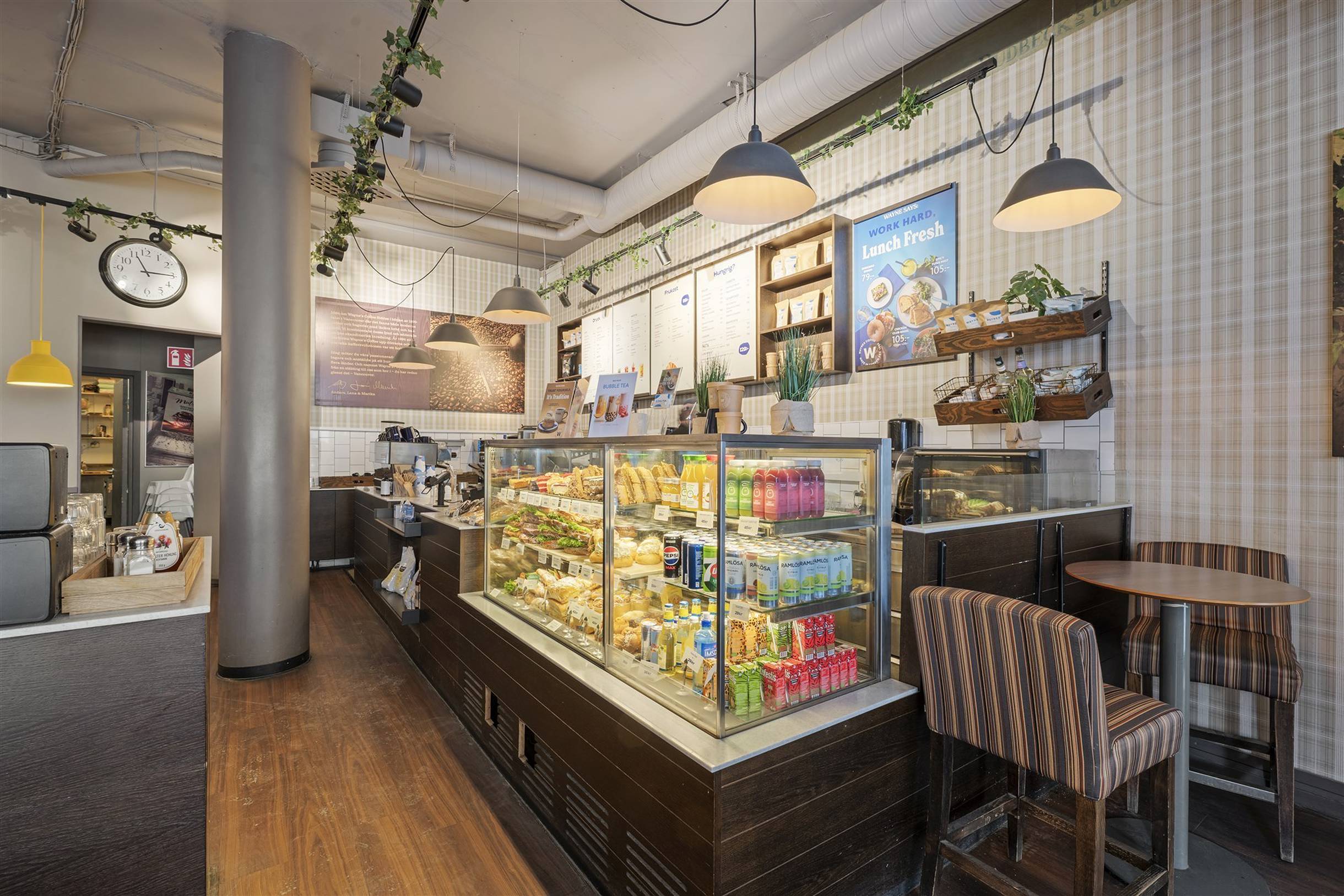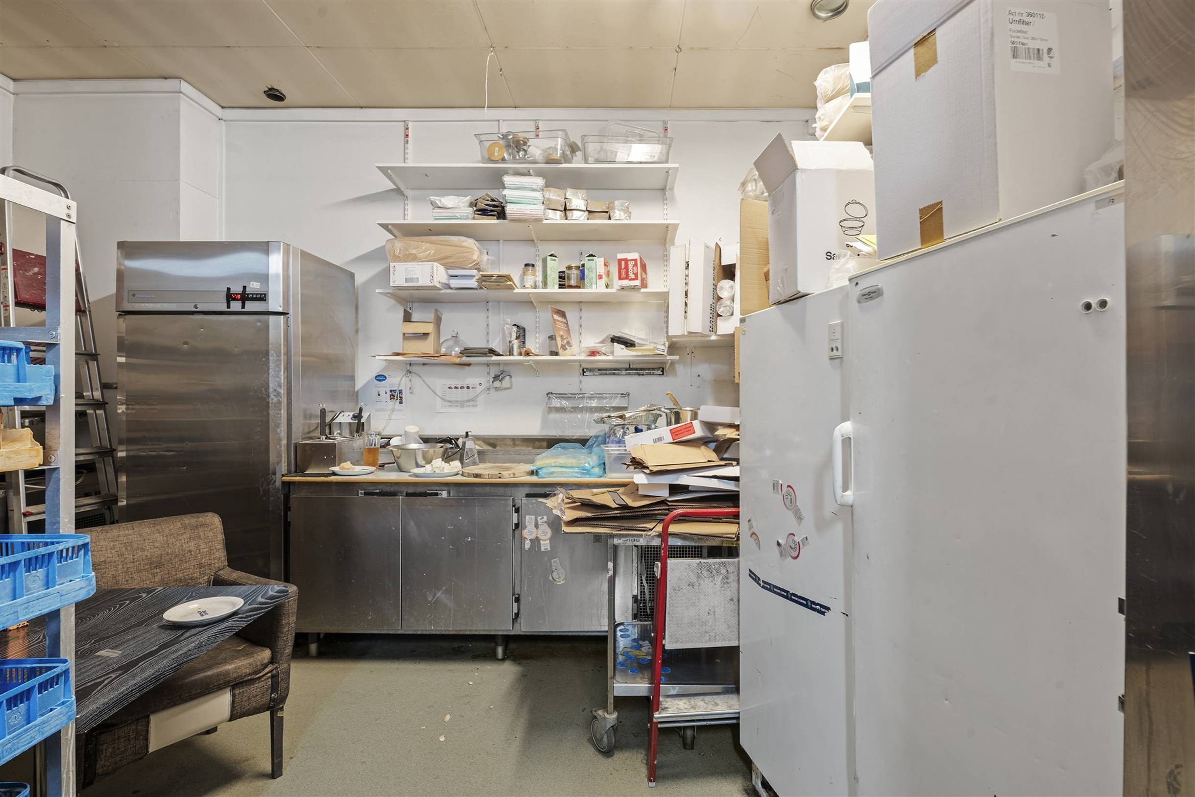 Trivsam och inbjudande cafélokal med öppen planlösning. När du kliver in i lokalen möts du av en stor och öppen cafélokal, här erbjuds det plats för 40-50 sittande gäster. I direkt anslutning till entrén återfinns kassan med bra utrymme för arbetsyta, kylmontrar och kaffe maskin. Vidare in i lokalen finns gott om förvaring med plats för disk samt prepp kök, det finns även personal toalett med tillhörande omklädningsrum. I lokalen finns det även en kundtoalett.