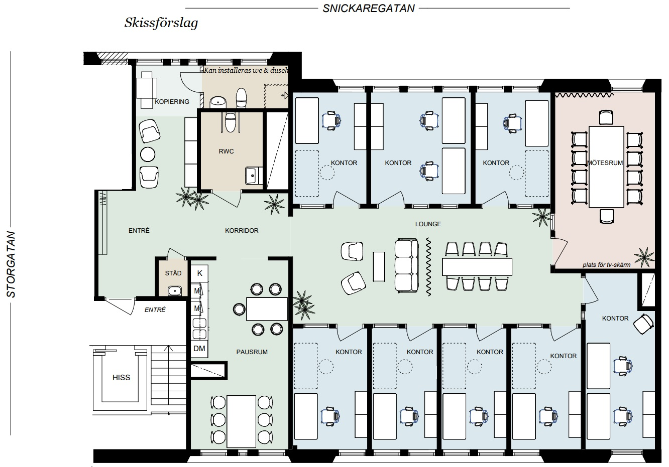 För möten finns ett rymligt konferensrum, och lokalen har dessutom ett öppet och trevligt pentry utrustat med diskmaskin, kyl/frys och mikrovågsugn. Toaletten är helkaklad och tillgänglighetsanpassad (RWC). En wc med dusch finns inritad i skissförslaget och kan byggas till efter önskemål.