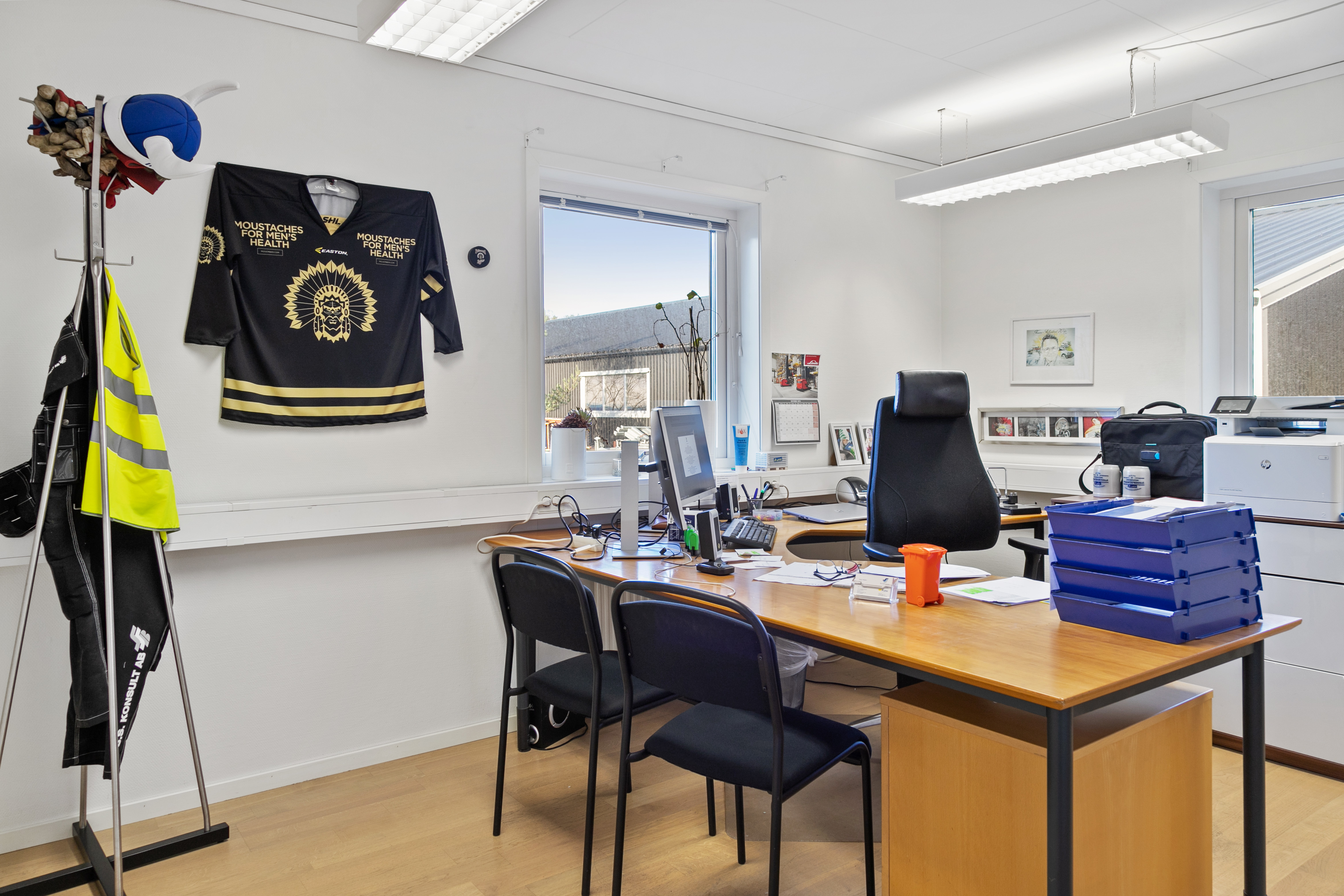 Kontorsdelen är i separat byggnad och innefattar ett kontorsrum samt ett stort lunchrum som kan användas som kontorsplatser om så önskas. Kontorsdelen mäter ca 140 kvm.