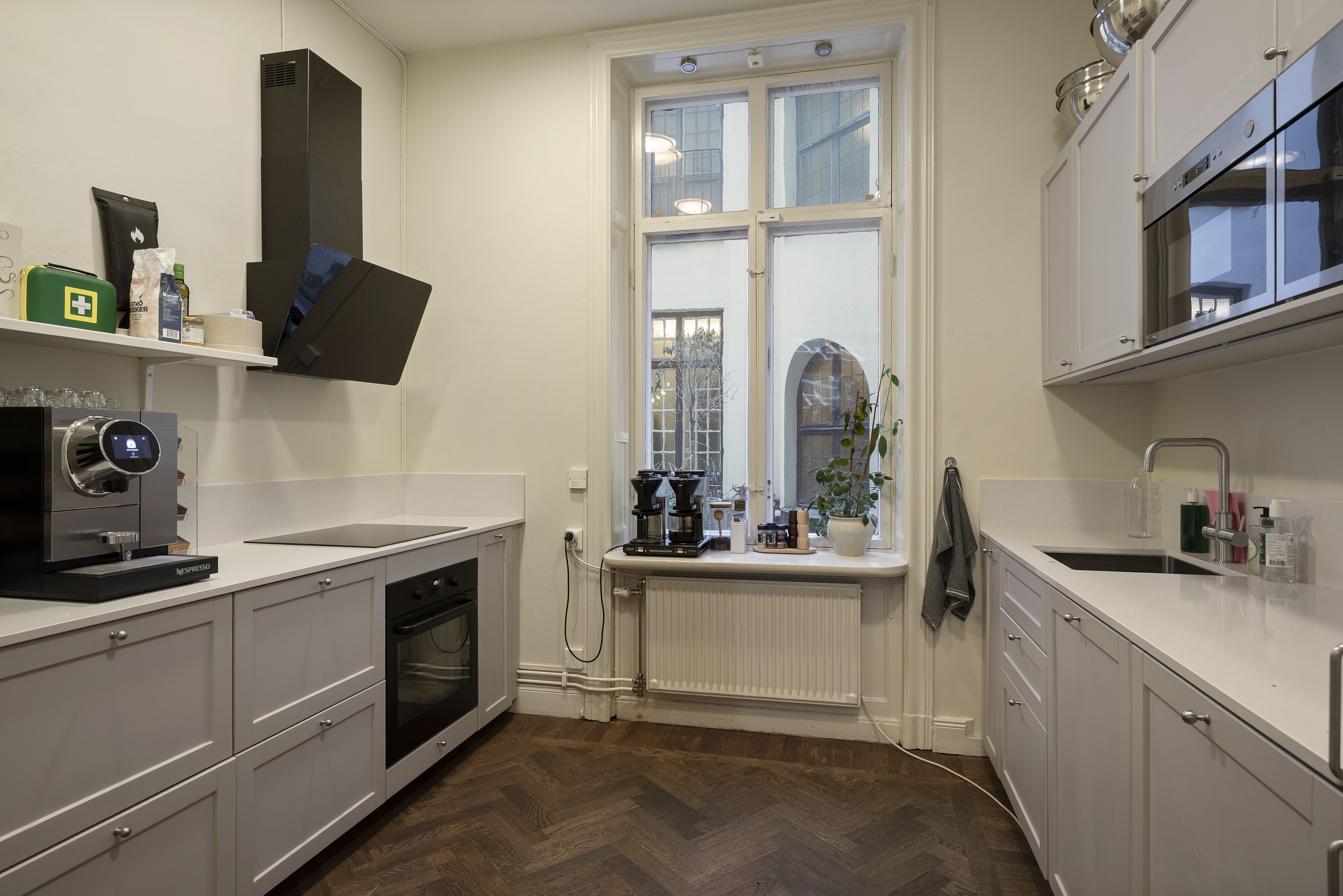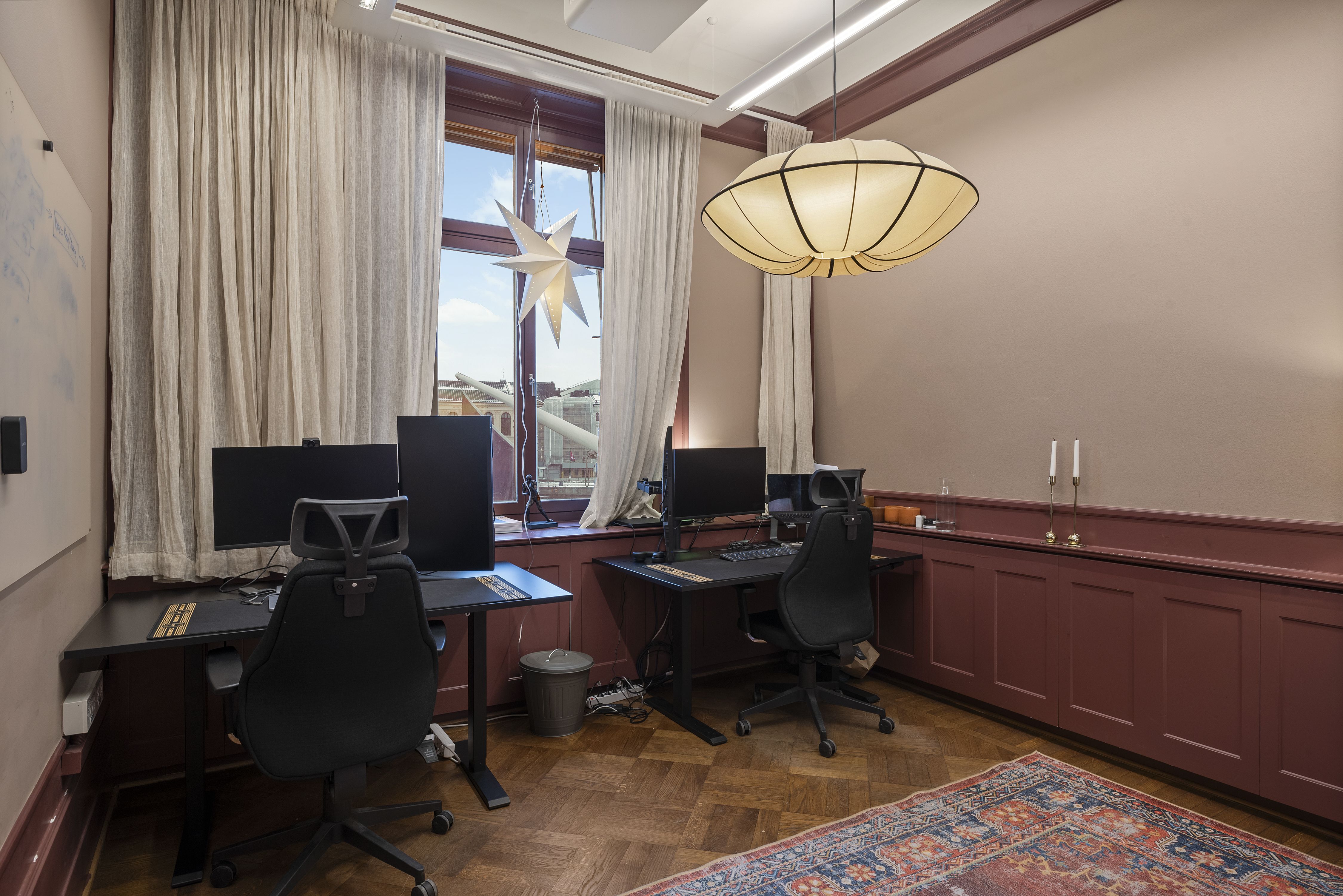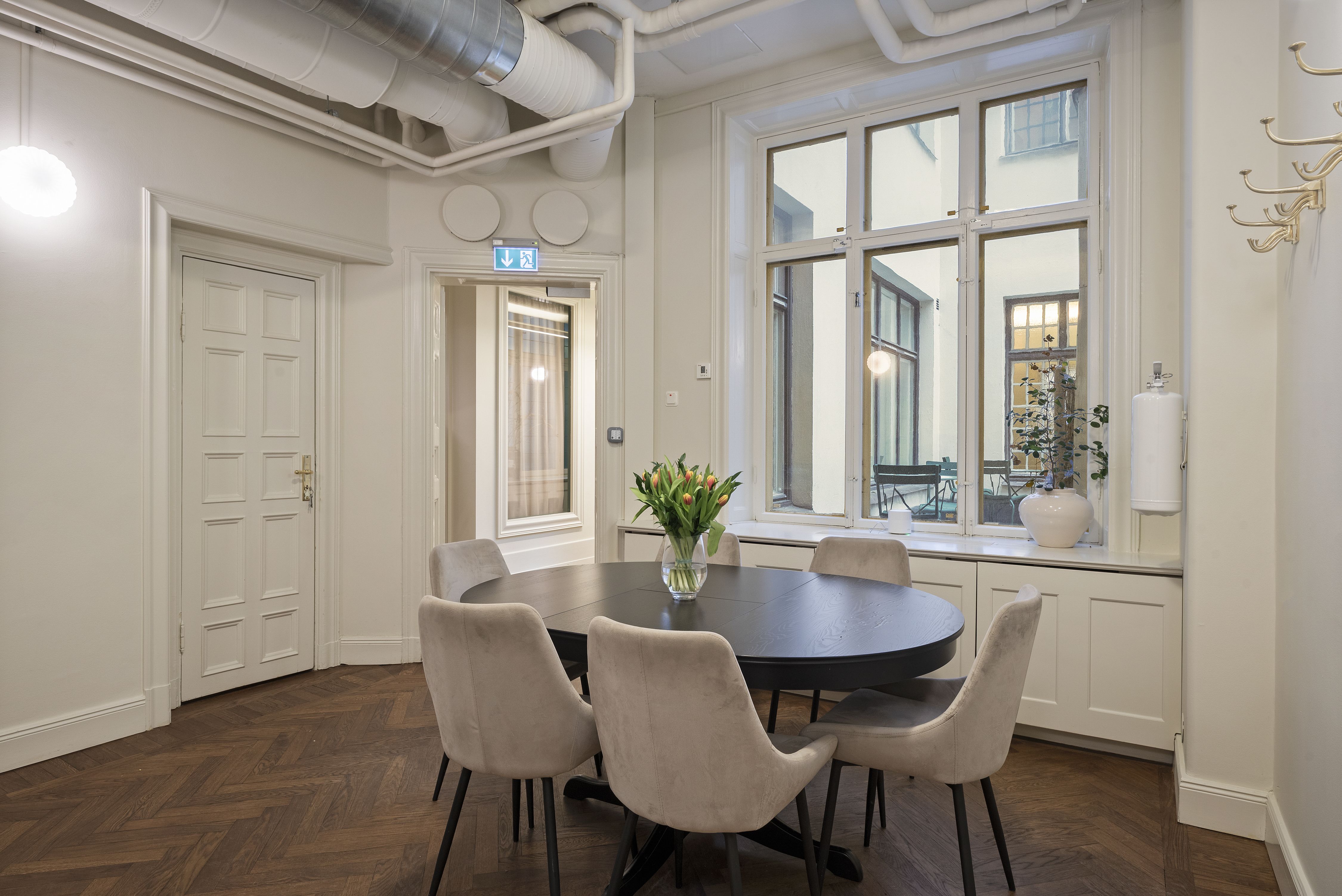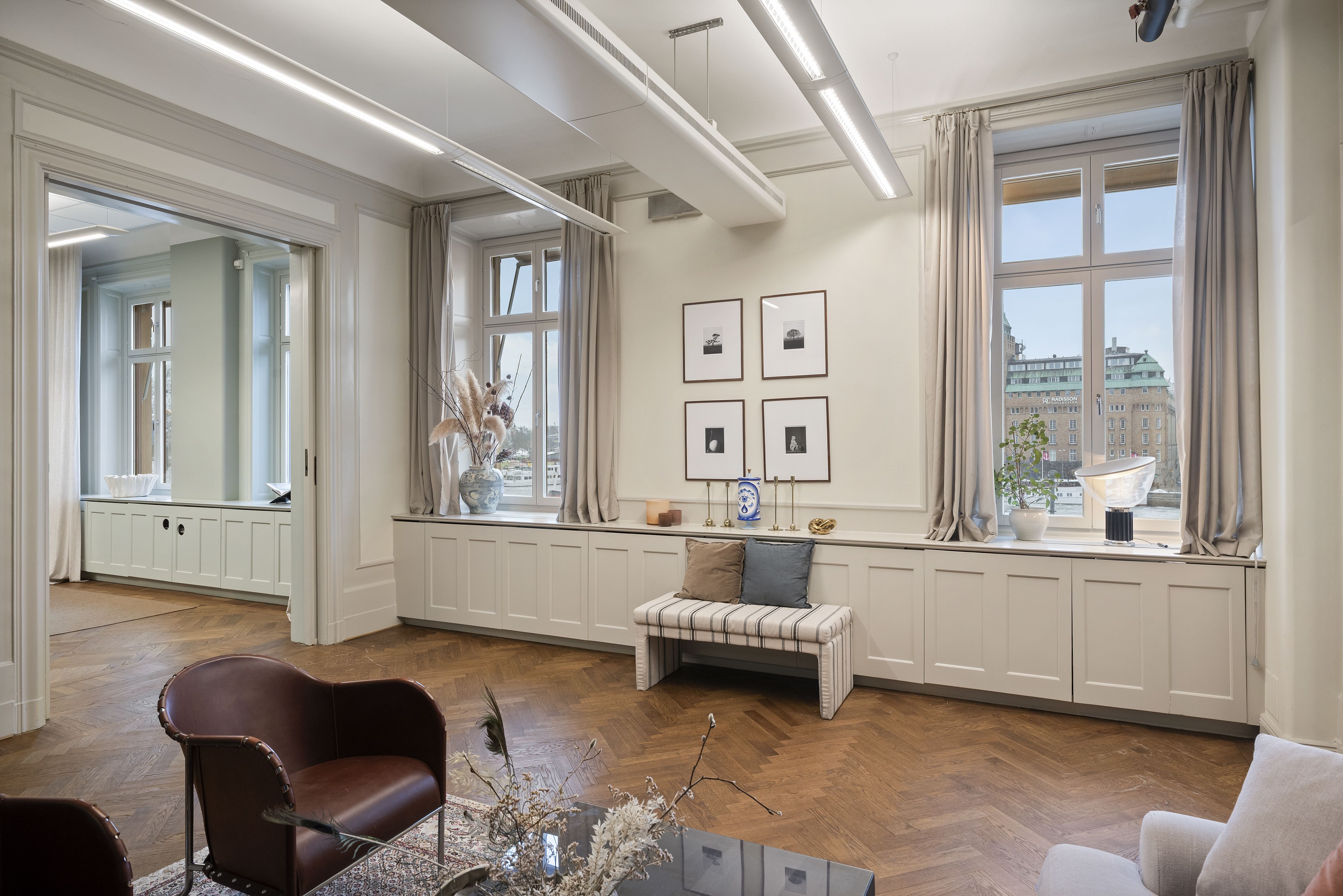 Välkommen till en lokal där detaljer är noga genomtänkt för att skapa en trivsam arbetsmiljö. Detta stilrena kontor på våning 2 präglas av en imponerande rymd med en takhöjd om ca 3,5 meter, vilket i kombination med de stora fönsterpartierna mot Nybroviken ger ett fantastiskt ljusinsläpp. Planlösningen är mycket välplanerad och erbjuder en perfekt balans mellan representativa mötesrum och effektiva arbetsytor.