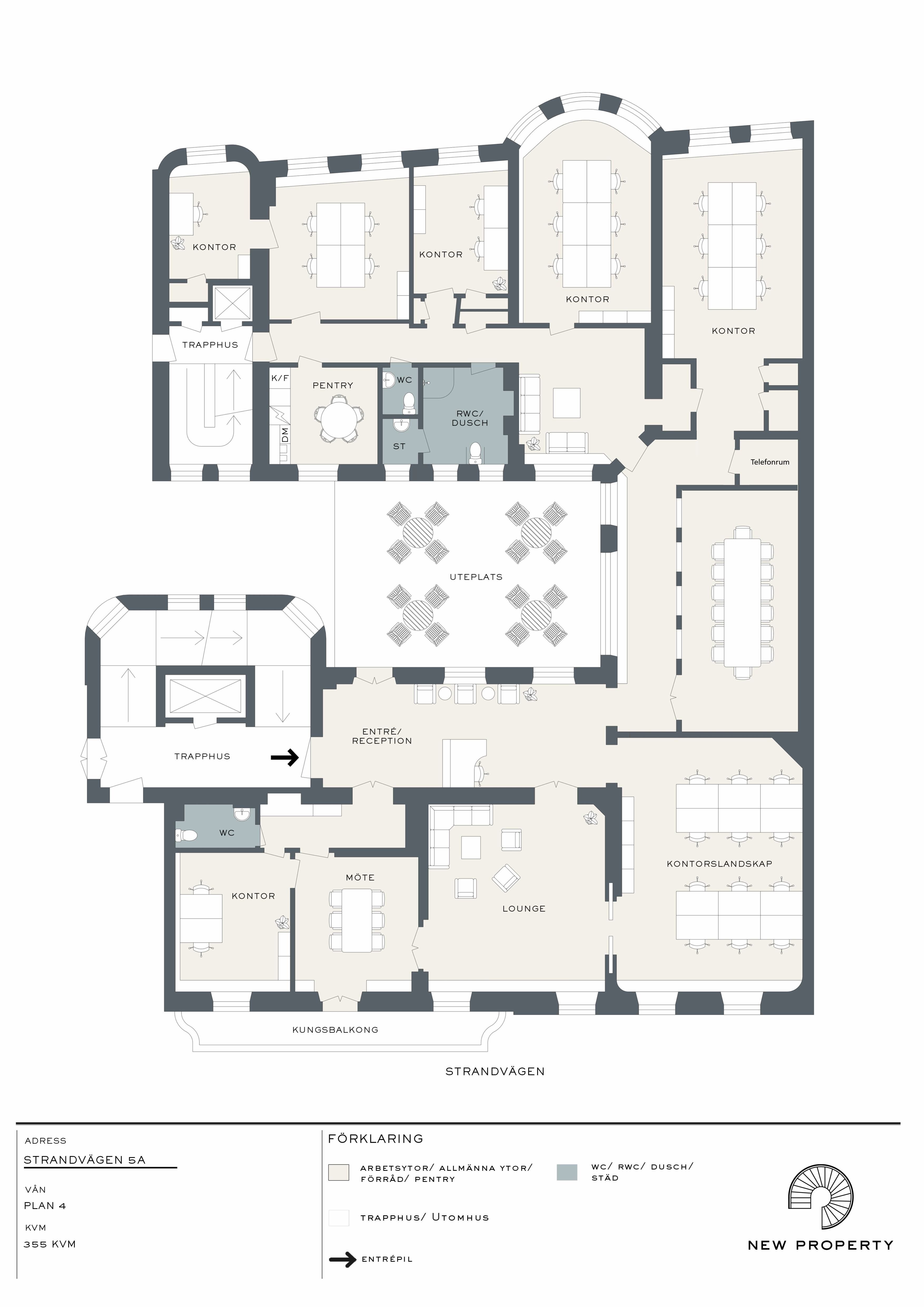 Att ha Strandvägen som bas innebär att ni befinner er i händelsernas centrum men med ett lugnt och exklusivt fokus. För affärsluncher och representation finns Stockholms bästa utbud av restauranger precis utanför dörren. Fastigheten erbjuder även en trivsam innergård för medarbetarna, en sällsynt oas mitt i city.
