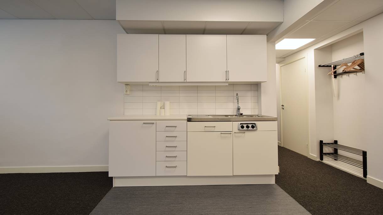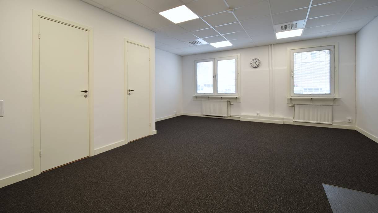 Vita väggar, bra belysning och trivsam textilmatta ger ett trivsamt intryck.