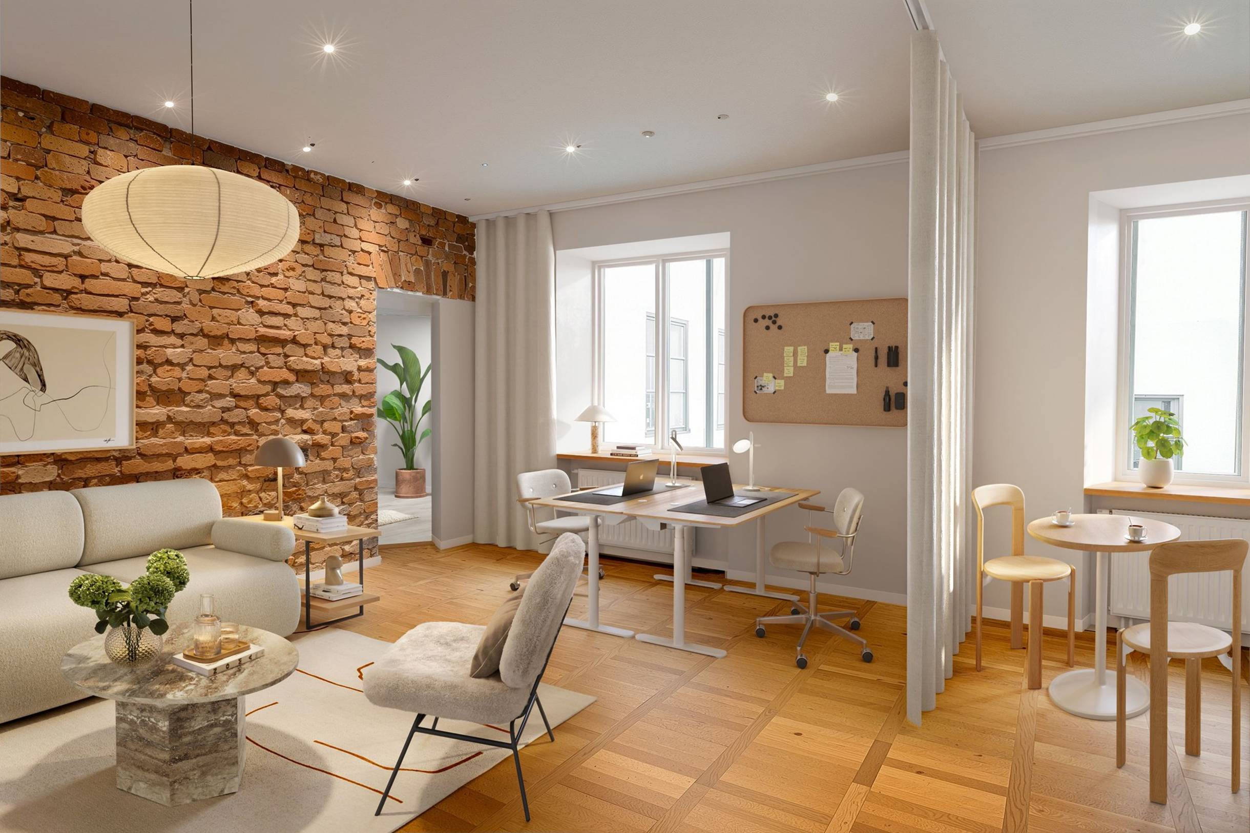 Kontorets charm förstärks av den framträdande tegelväggen, som ger lokalen karaktär och en genuin “hemma hos”-känsla. Det är en plats där man trivs, där det blir lätt att skapa en personlig prägel och där varje arbetsdag känns lite mer inspirerande.