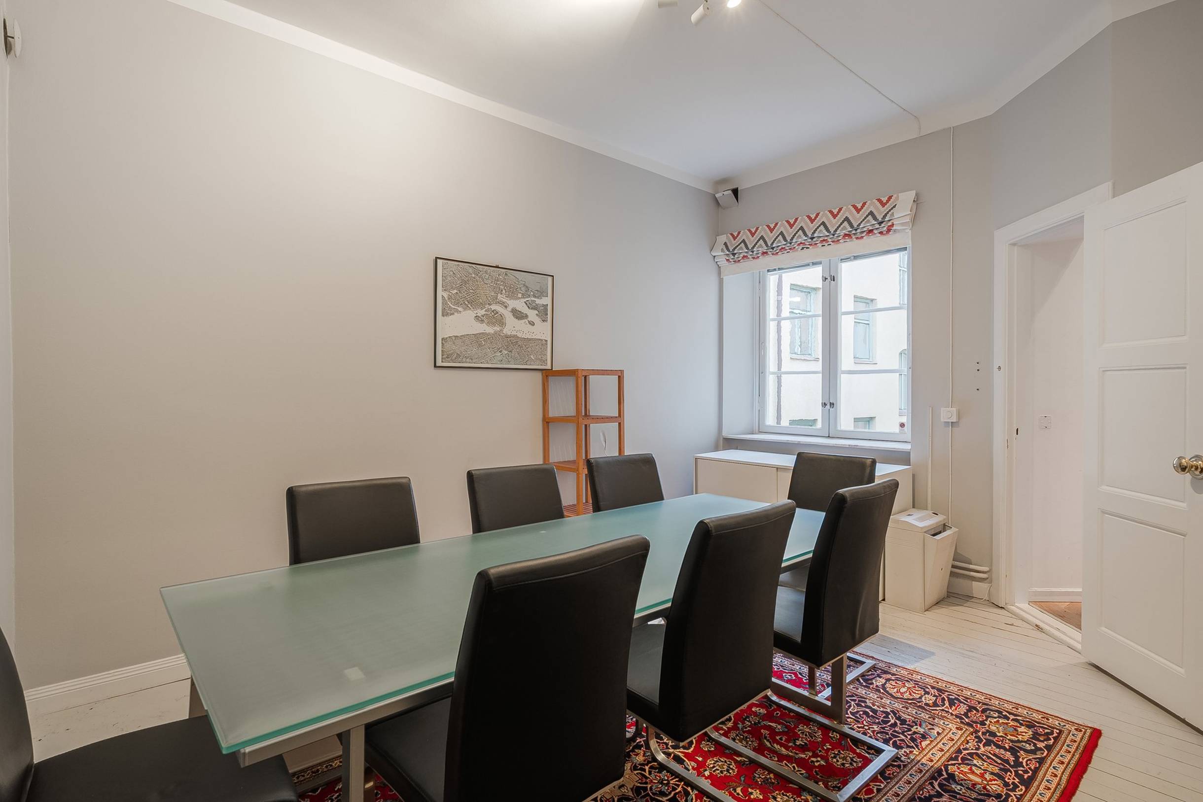 Lokalen är utformad för att skapa både fokus och samarbete, med en bekväm arbetsyta för cirka 4–5 personer samt ett rymligt mötesrum som lämpar sig utmärkt för kundmöten, workshops eller kreativa genomgångar.
