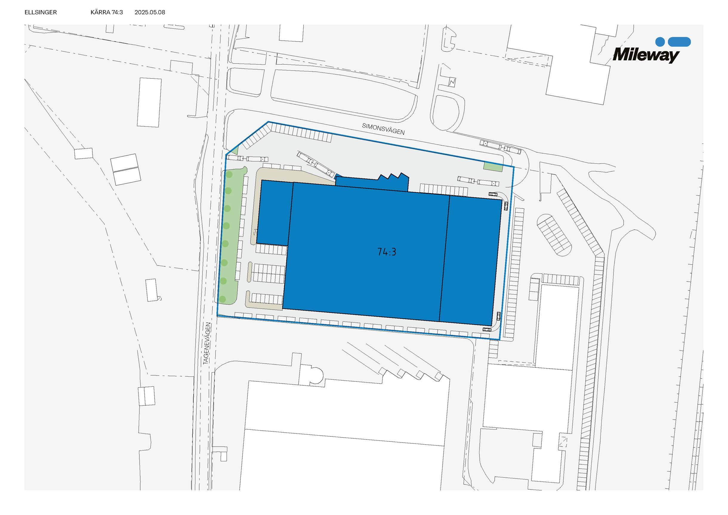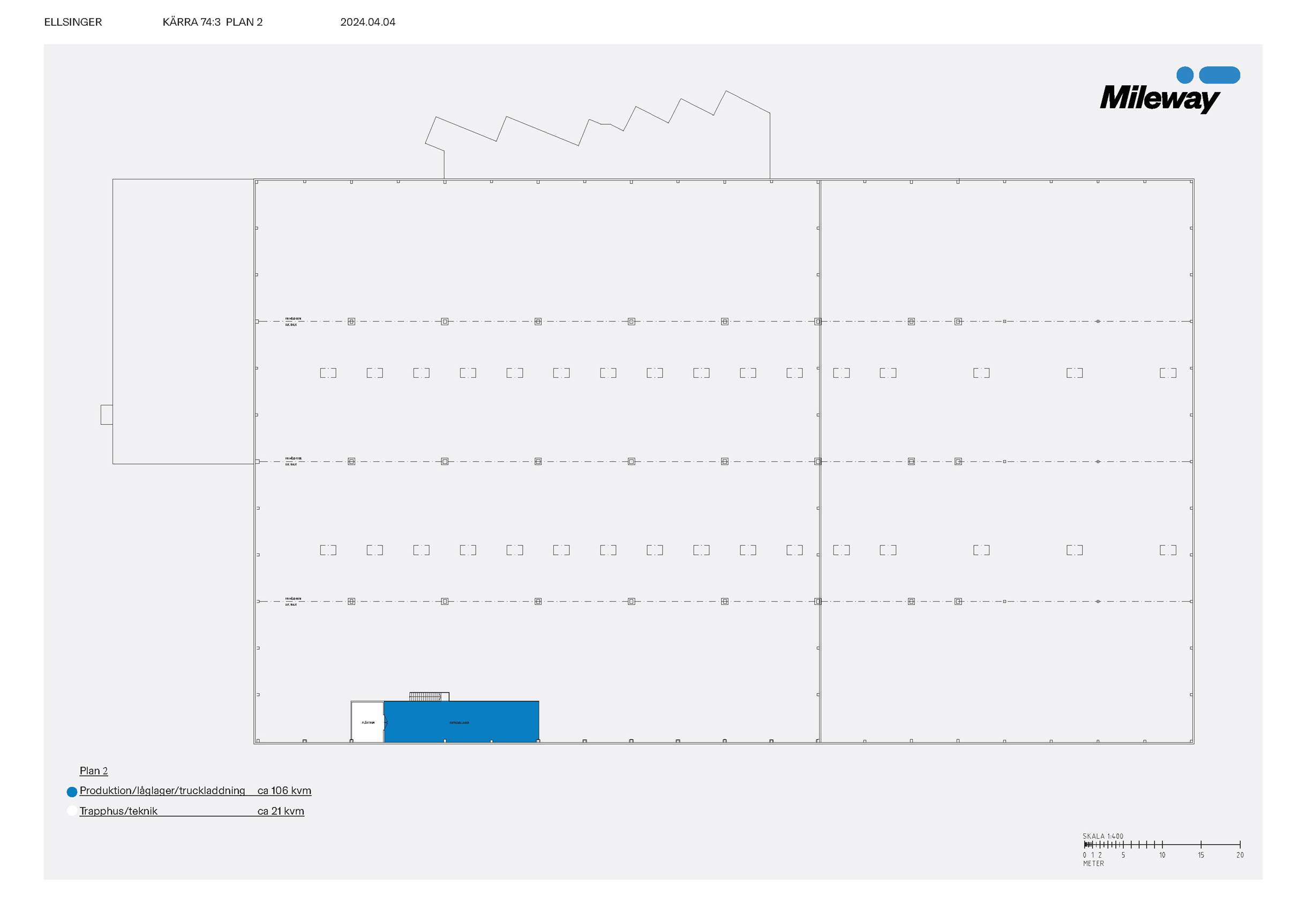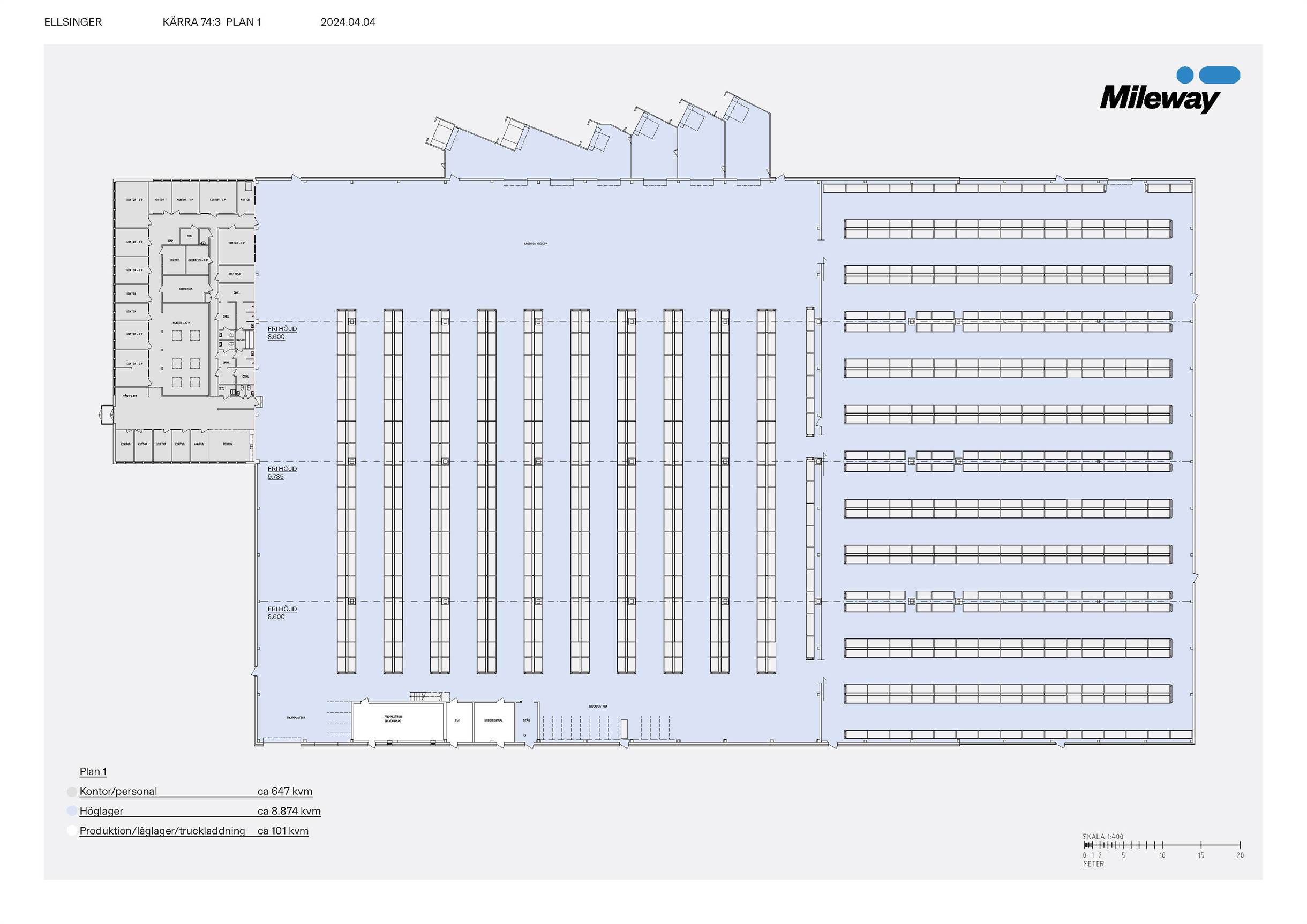 Fastigheten omfattar totalt ca 9 500 kvm, varav 8 850 kvm lager och ca 650 kvm kontor och personalutrymmen.