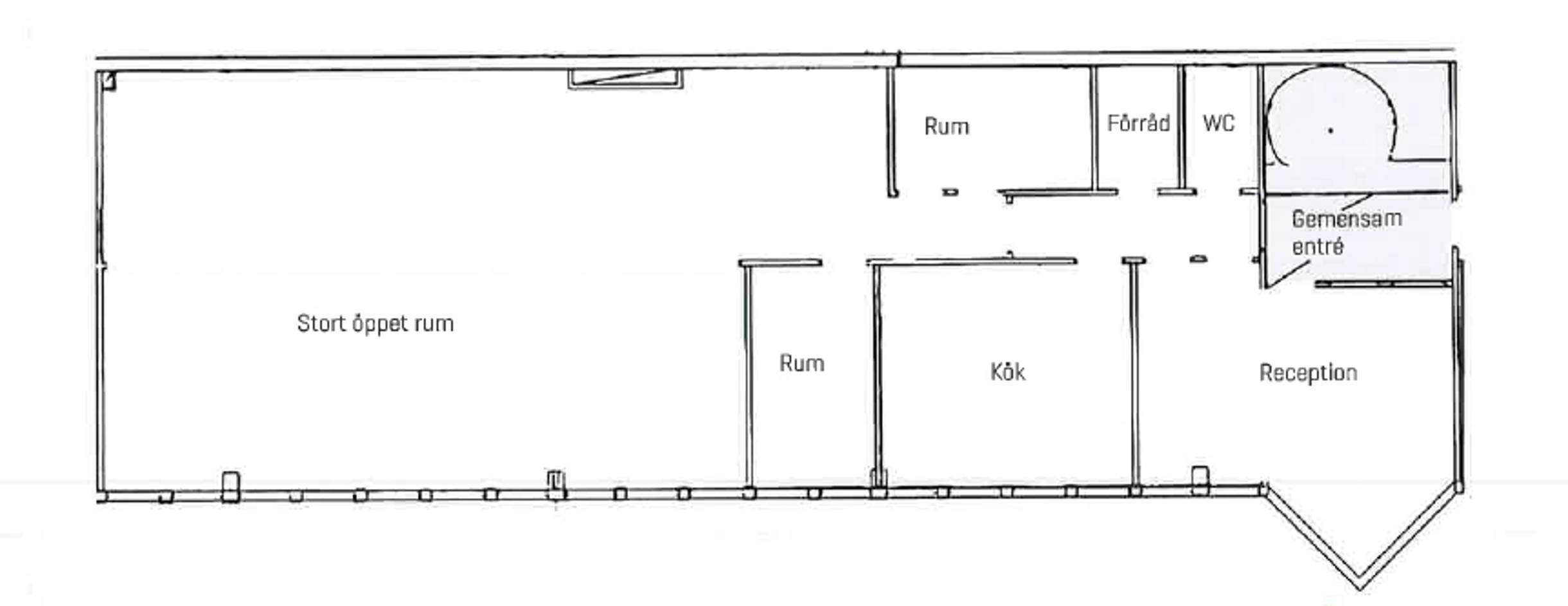 Här finns entré som idag används som reception samt kök med plats för flera sittplatser. Fastigheten erbjuder goda parkeringsmöjligheter, möjlighet till skyltning samt närhet till kollektivtrafik och service i området.