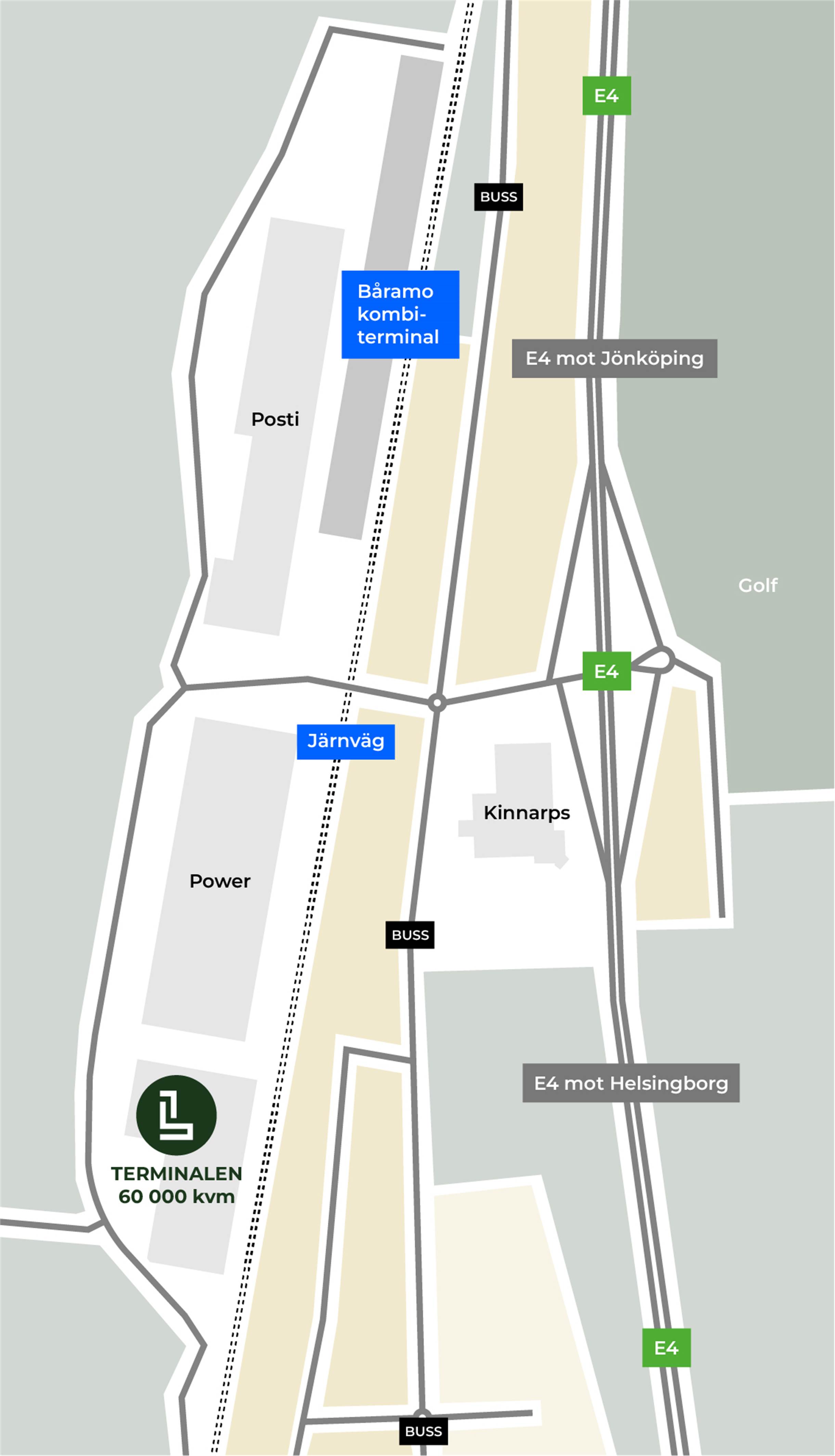 Endast 900 meter från Båramo Kombiterminal. Möjlighet till spåranslutning direkt in i fastigheten.