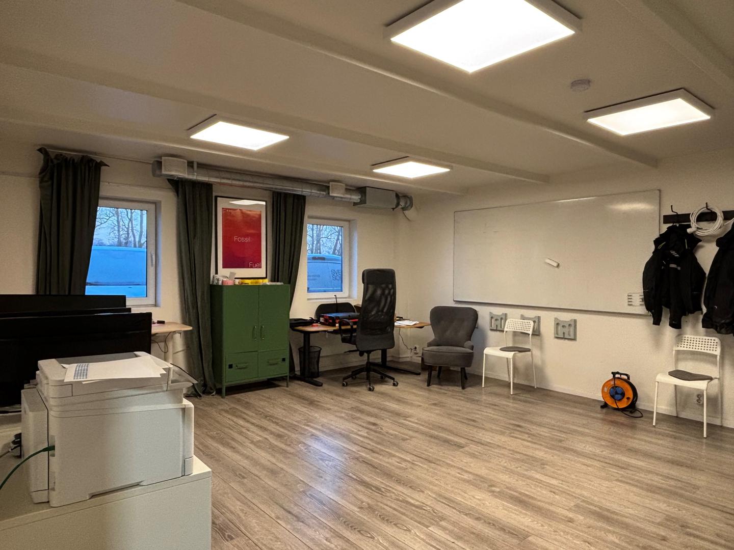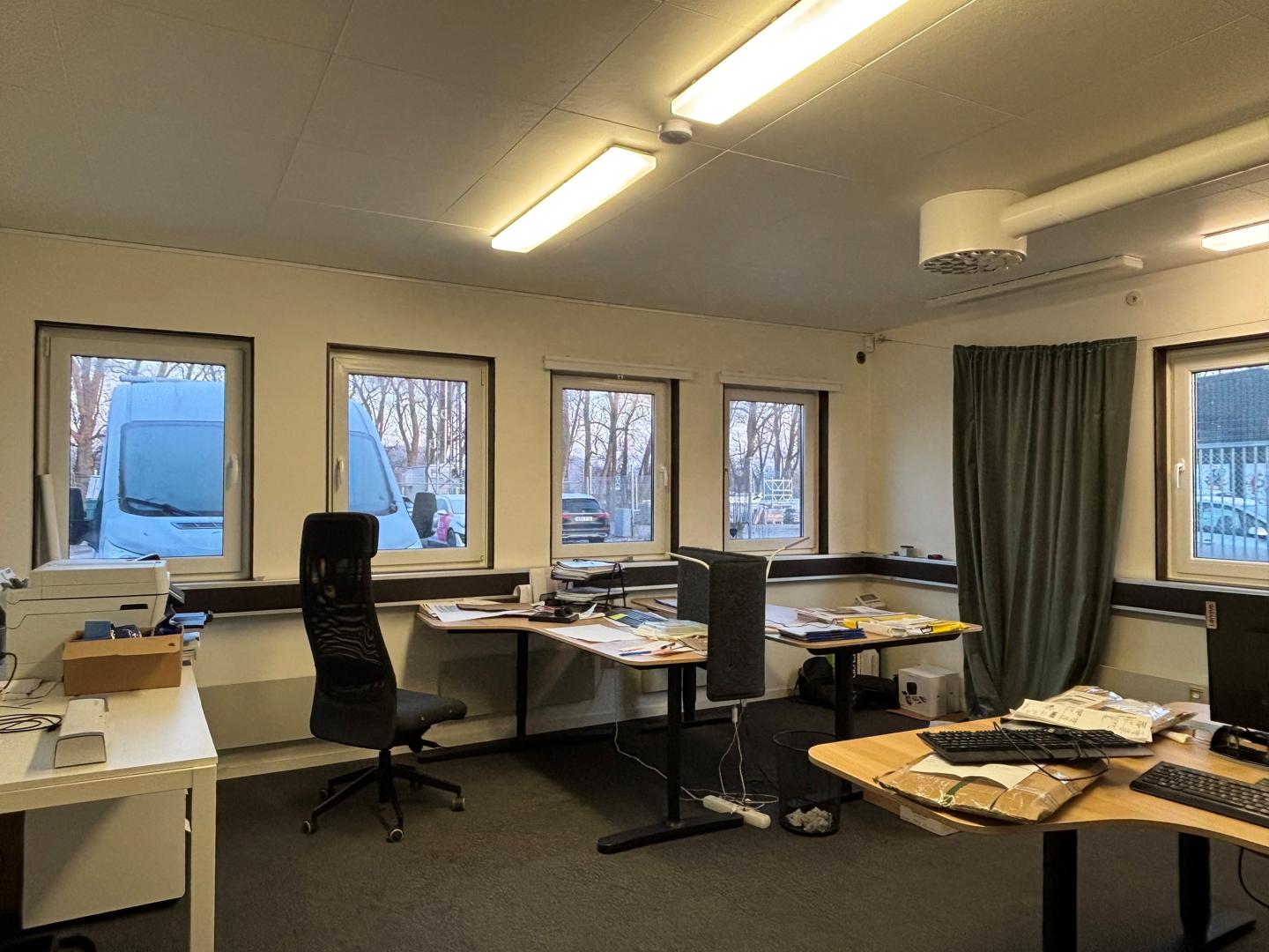 Kontorsdelen erbjuder två större kontorsrum samt två i mindre storlek. Ett mindre samtalsrum samt kök finns att tillgå. I kontorsdelen finns även ännu en toalett.