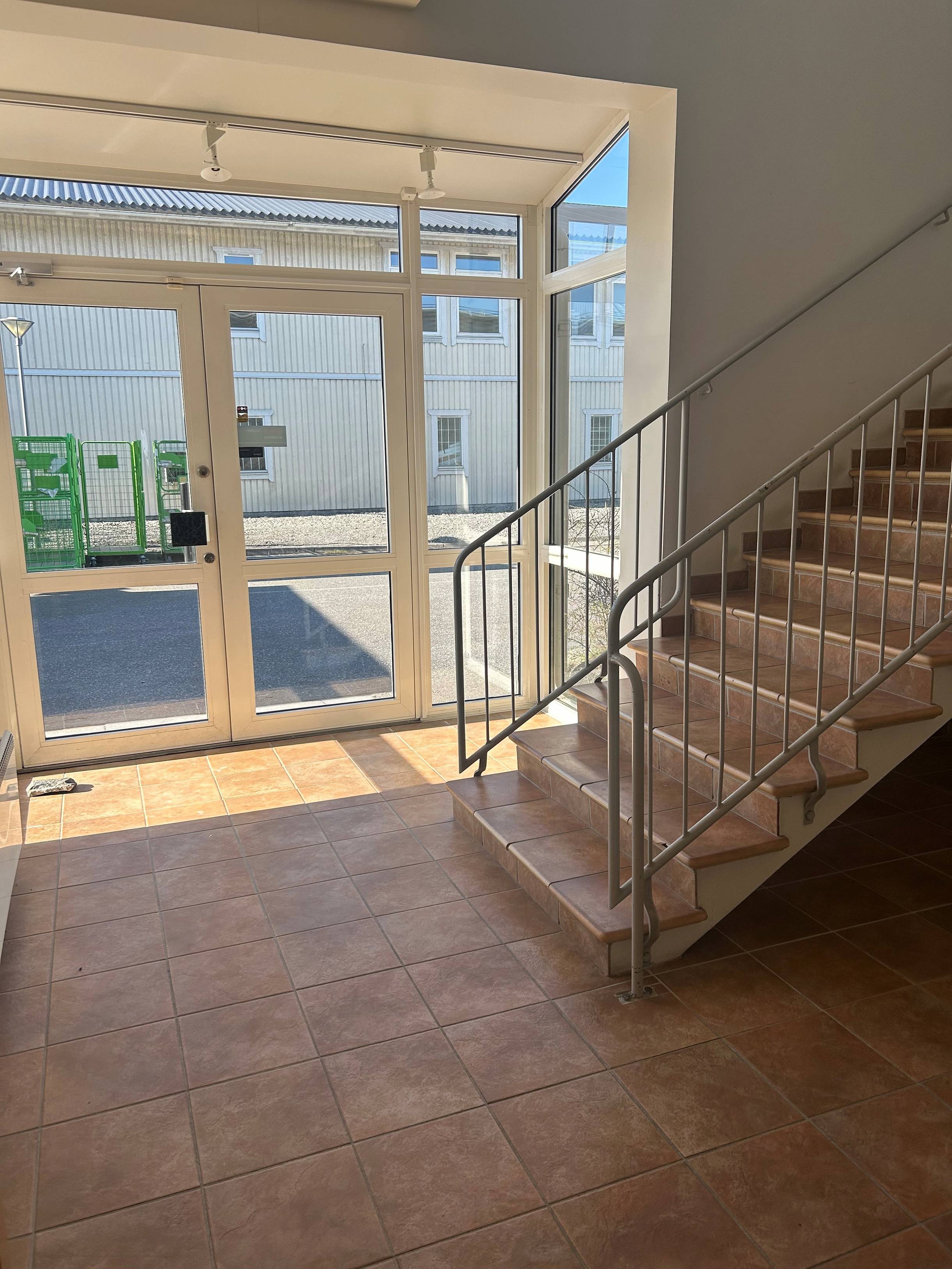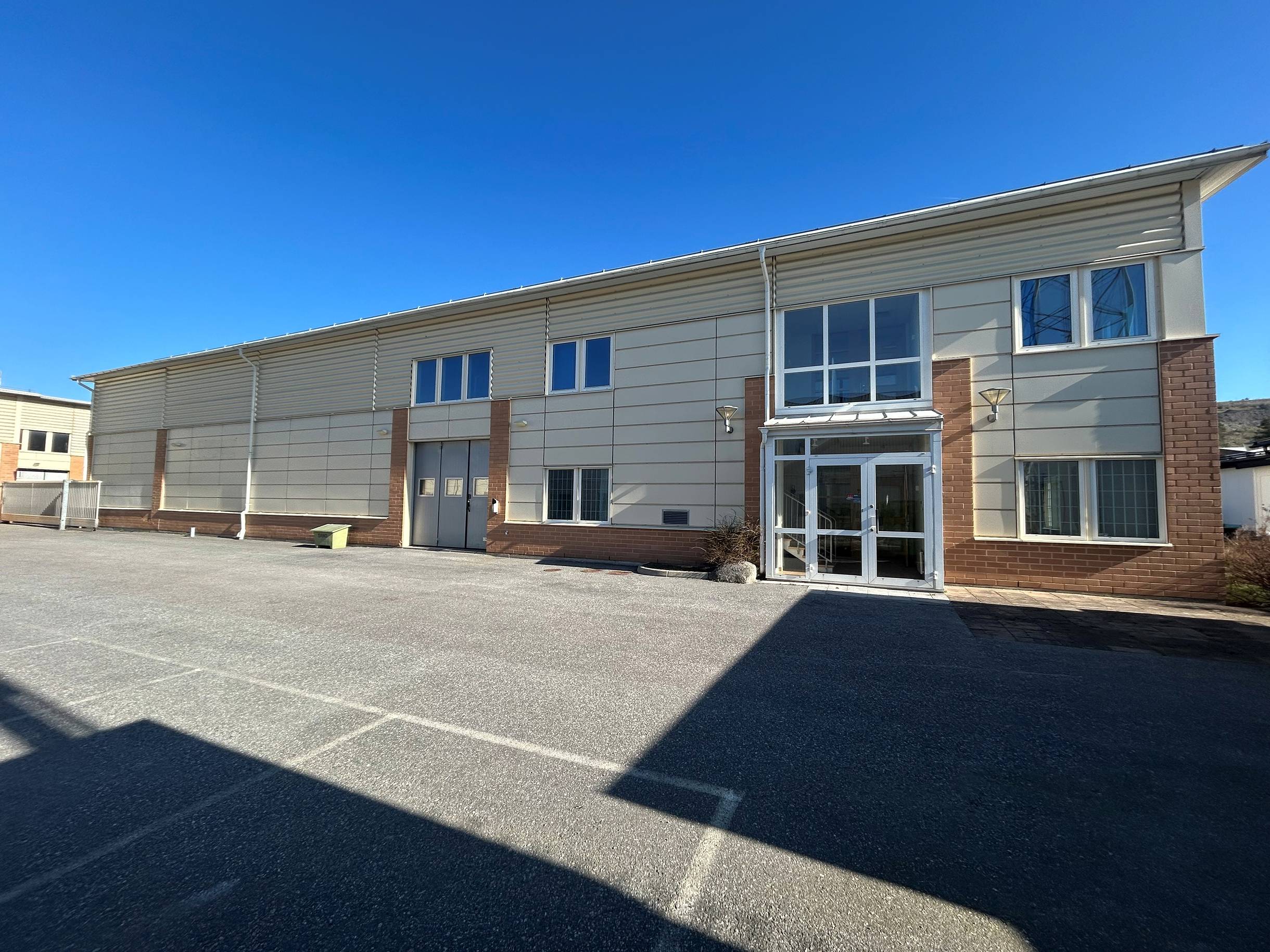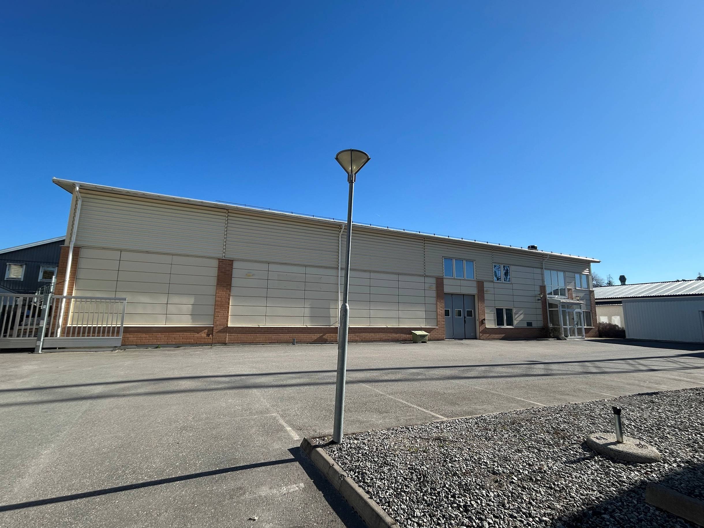 Fin verksamhetsbyggnad med två markportar och generös takhöjd.