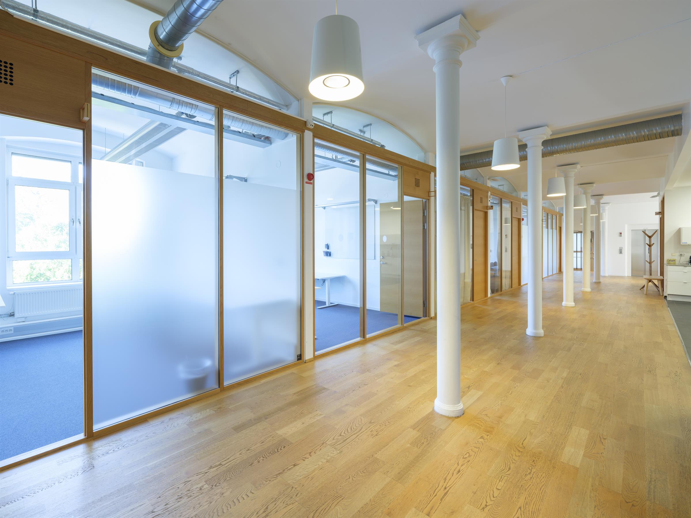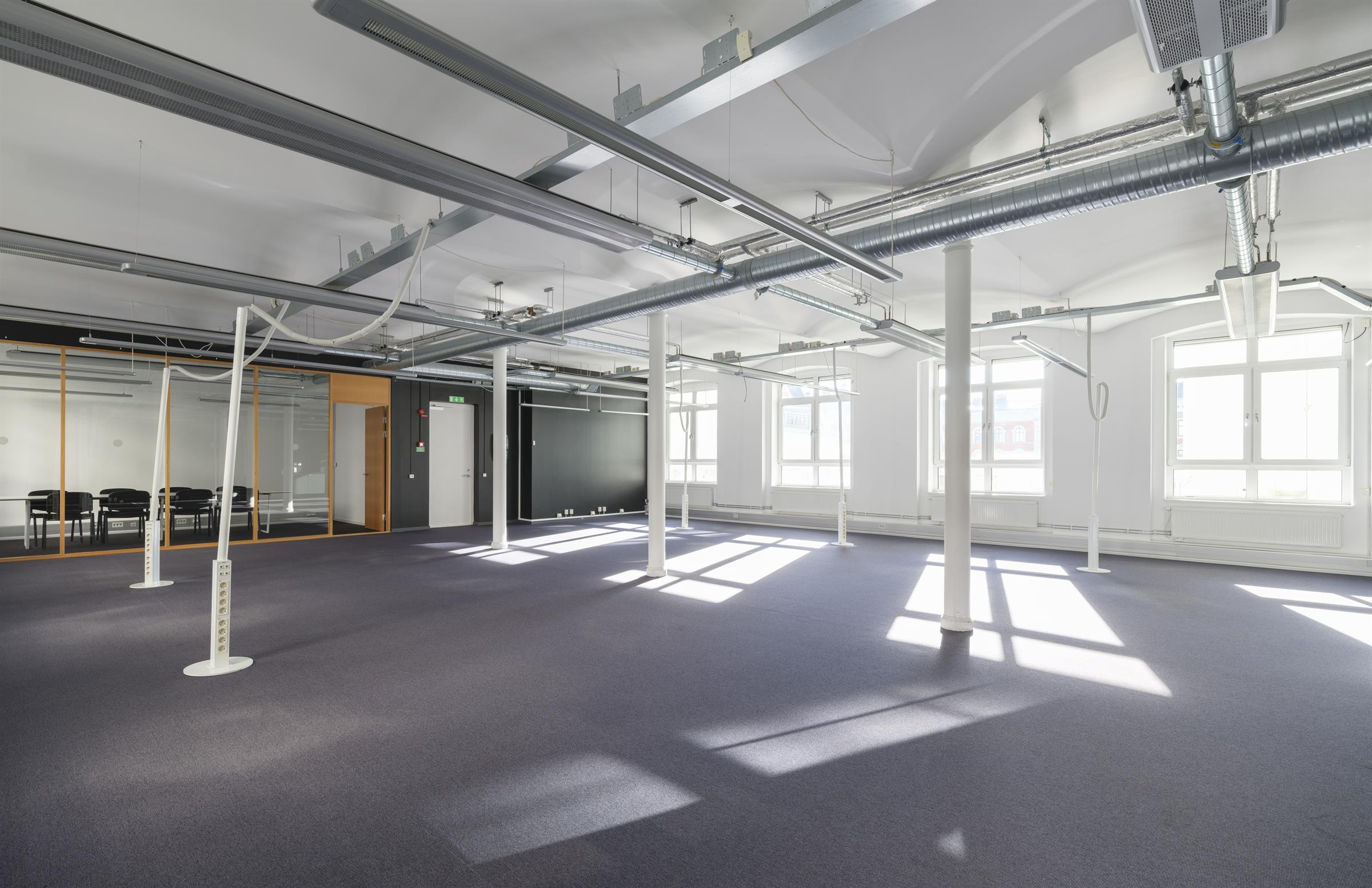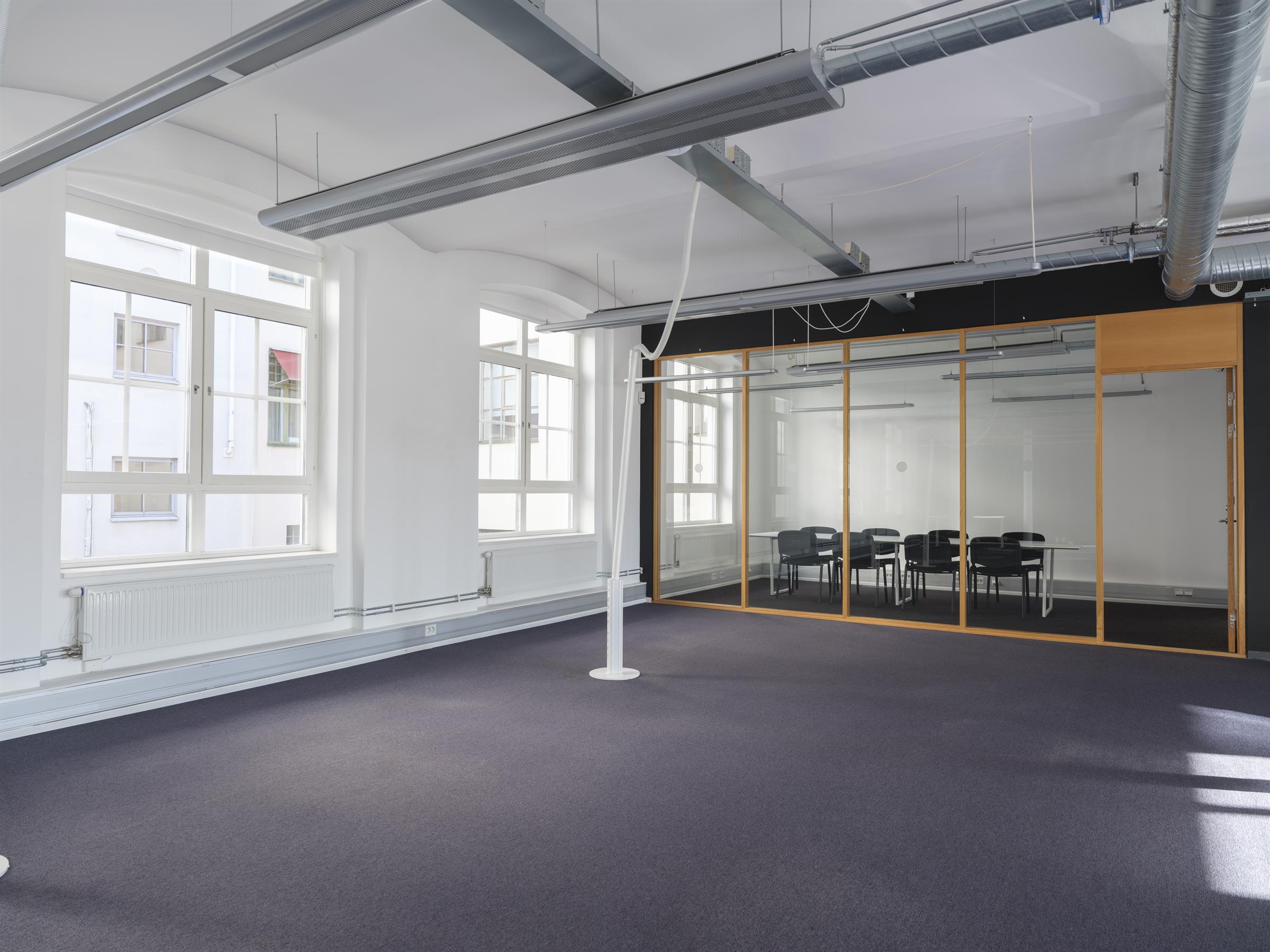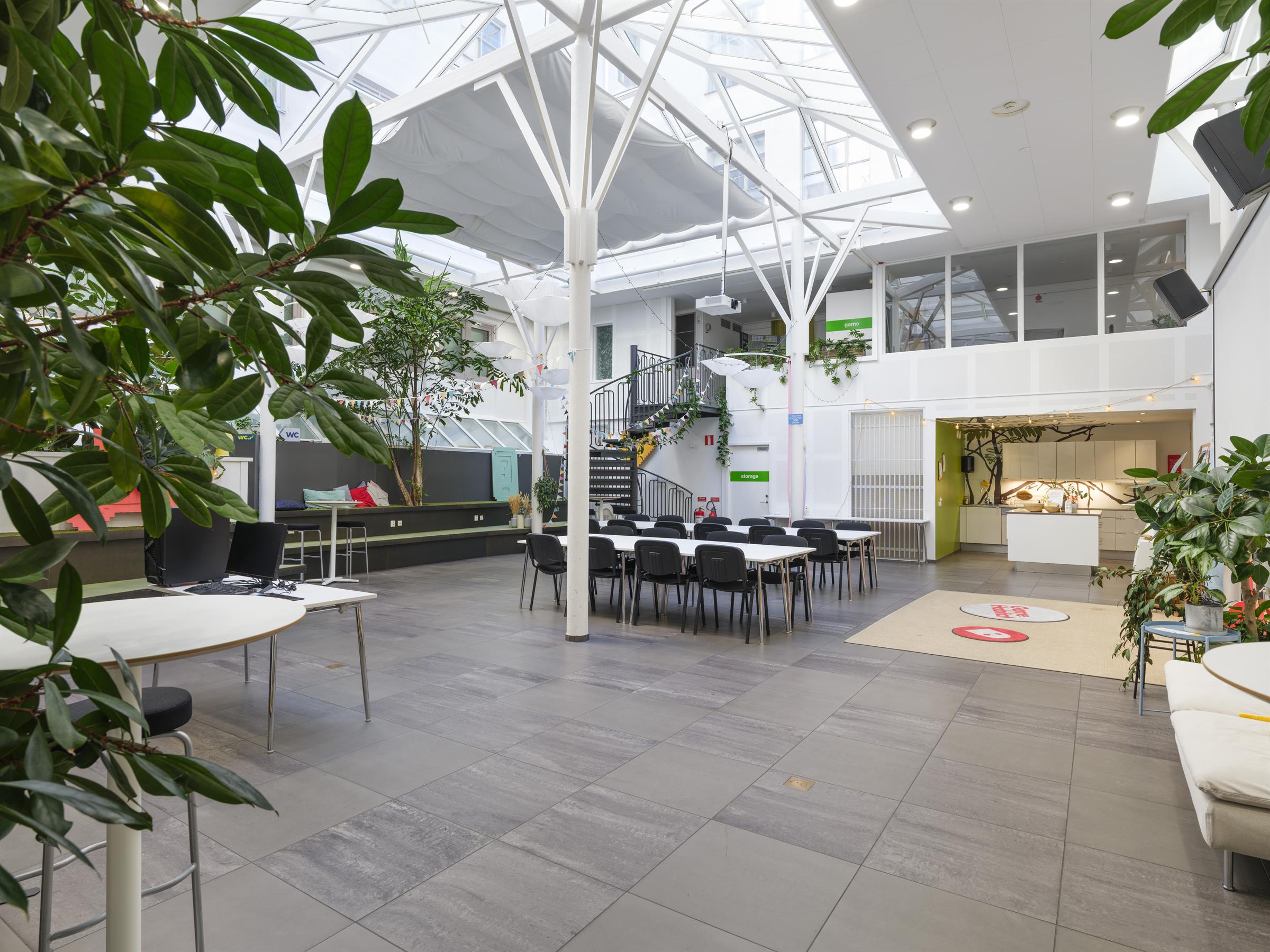 Ljus atriumyta med sittplatser och växter. Korridor med glasväggar och trägolv. Fastigheten Magnus Stenbock 2 i grönskande kvarter mitt i Malmö. Större öppen kontorsyta med pelare och fönster. Mötesrum med bord och stolar. Öppen kontorsyta med stora fönster och naturligt ljus. Stor kontorsyta med fönster längs hela väggen. Kontorsyta med glasat mötesrum. Mötesrum med lång konferensbord och skärm.