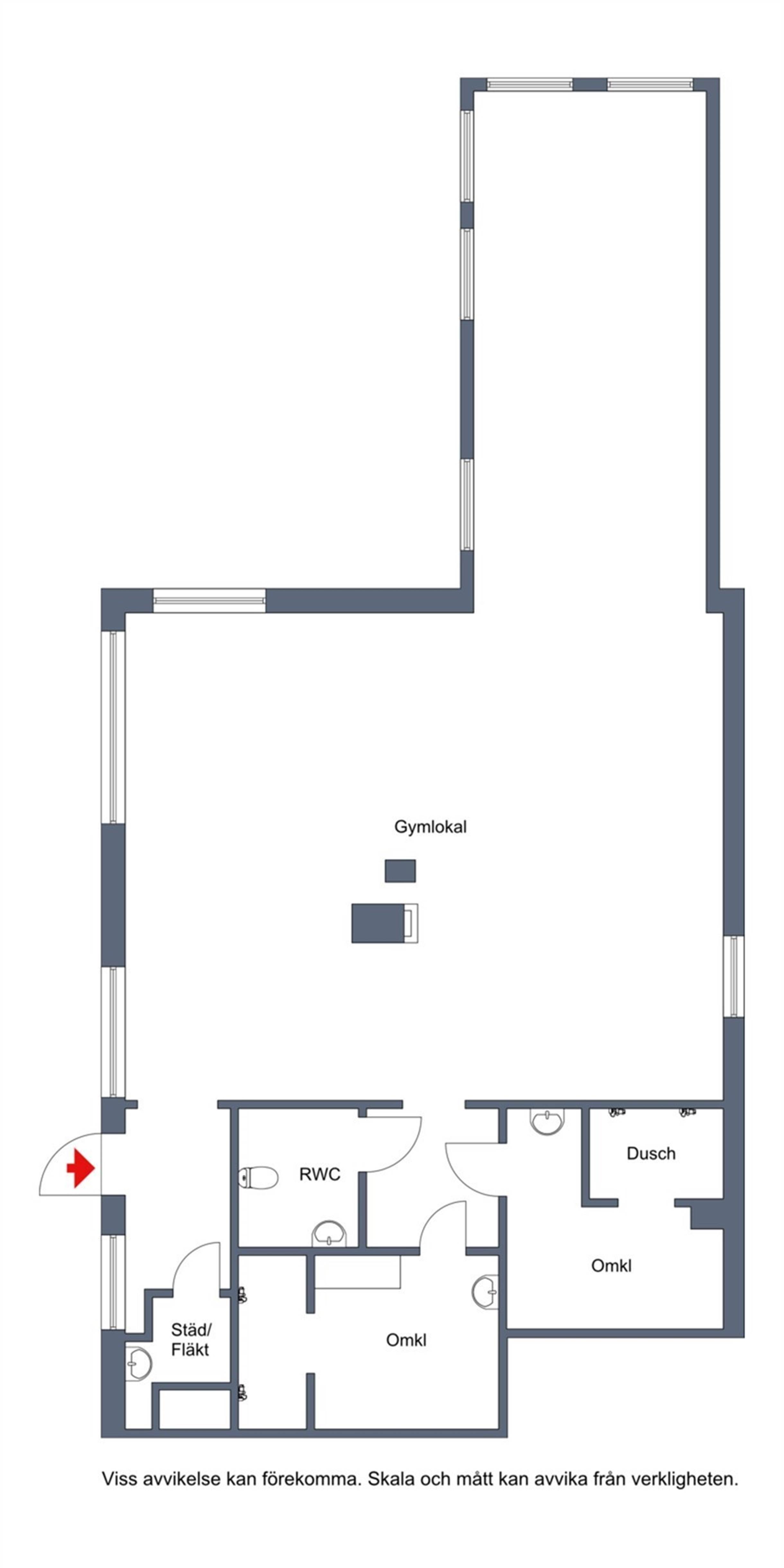 Idag är lokalen anpassad för gymverksamhet, lokalen kan anpassas till butik, kontor eller annan önskad verksamhet och det ska göras i samråd med hyresvärden.