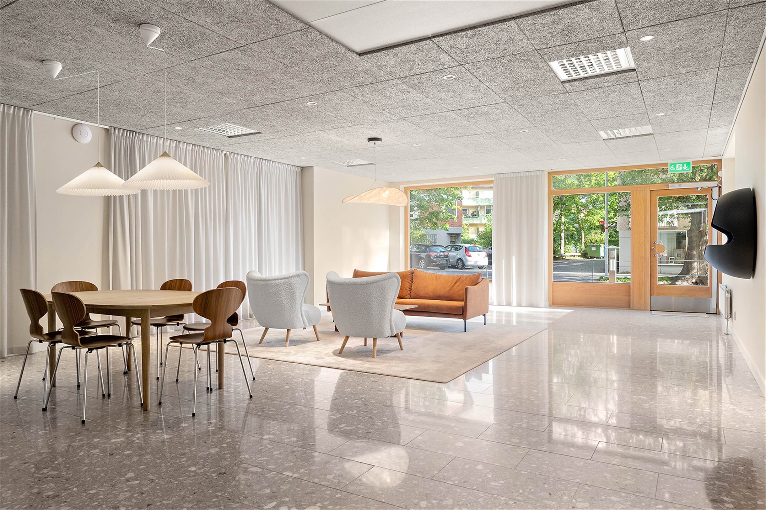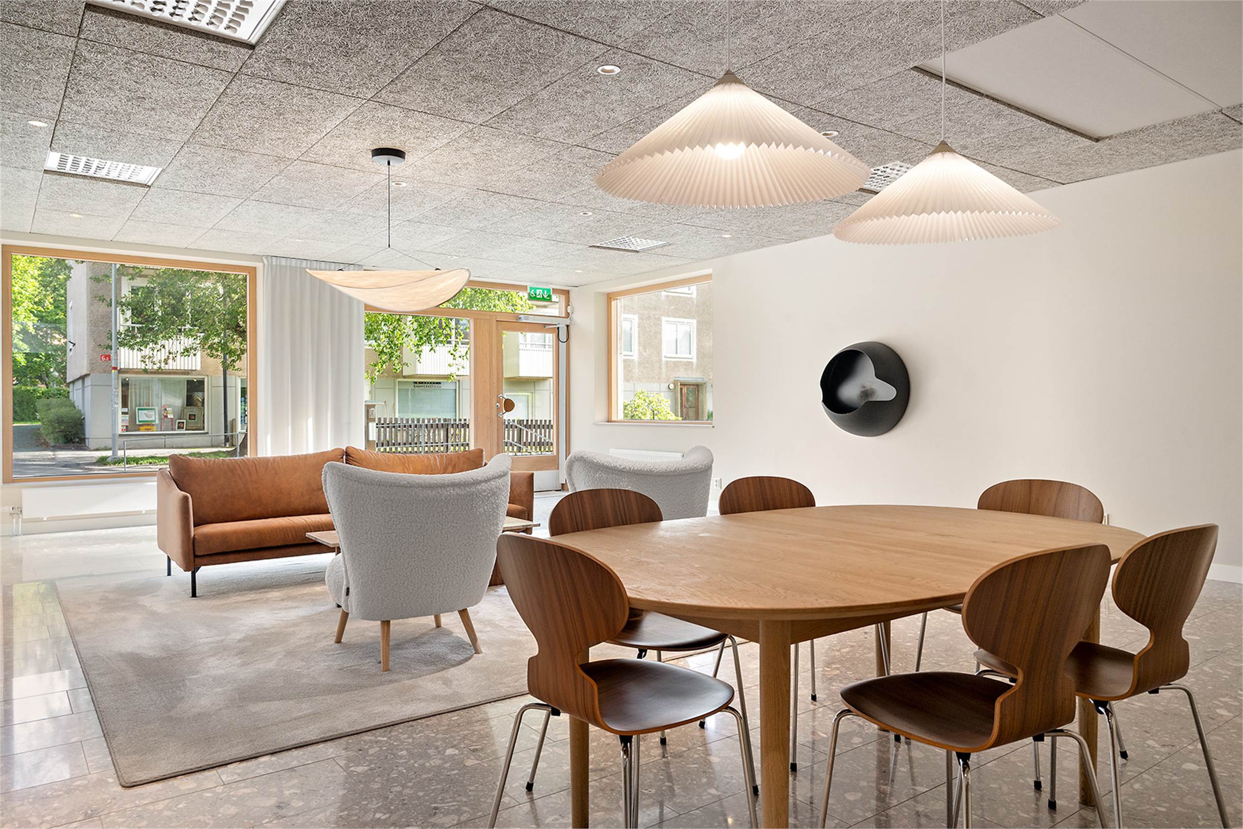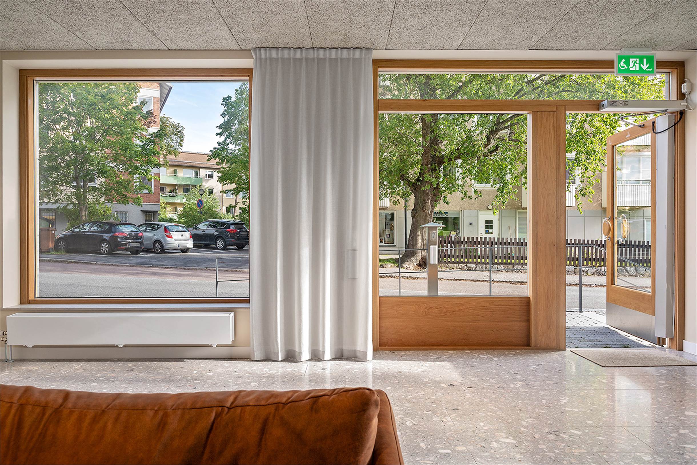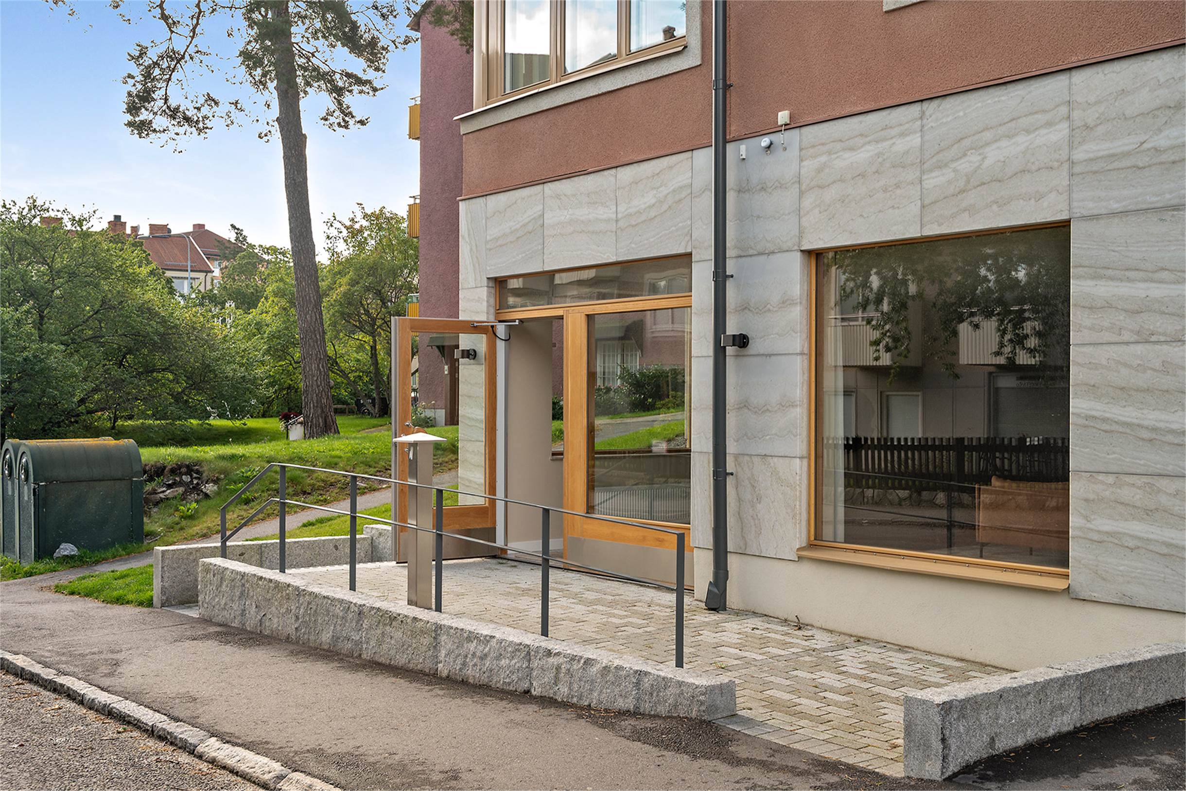 Lokalen kan hyras ut med de möbler som finns på bilderna inkluderade om man önskar det. På väggen sitter en vägghängd etanolkamin som även kan hänga kvar. Smidig inpassering via ramp eller trappa till dörren samt automatisk dörröppnare.