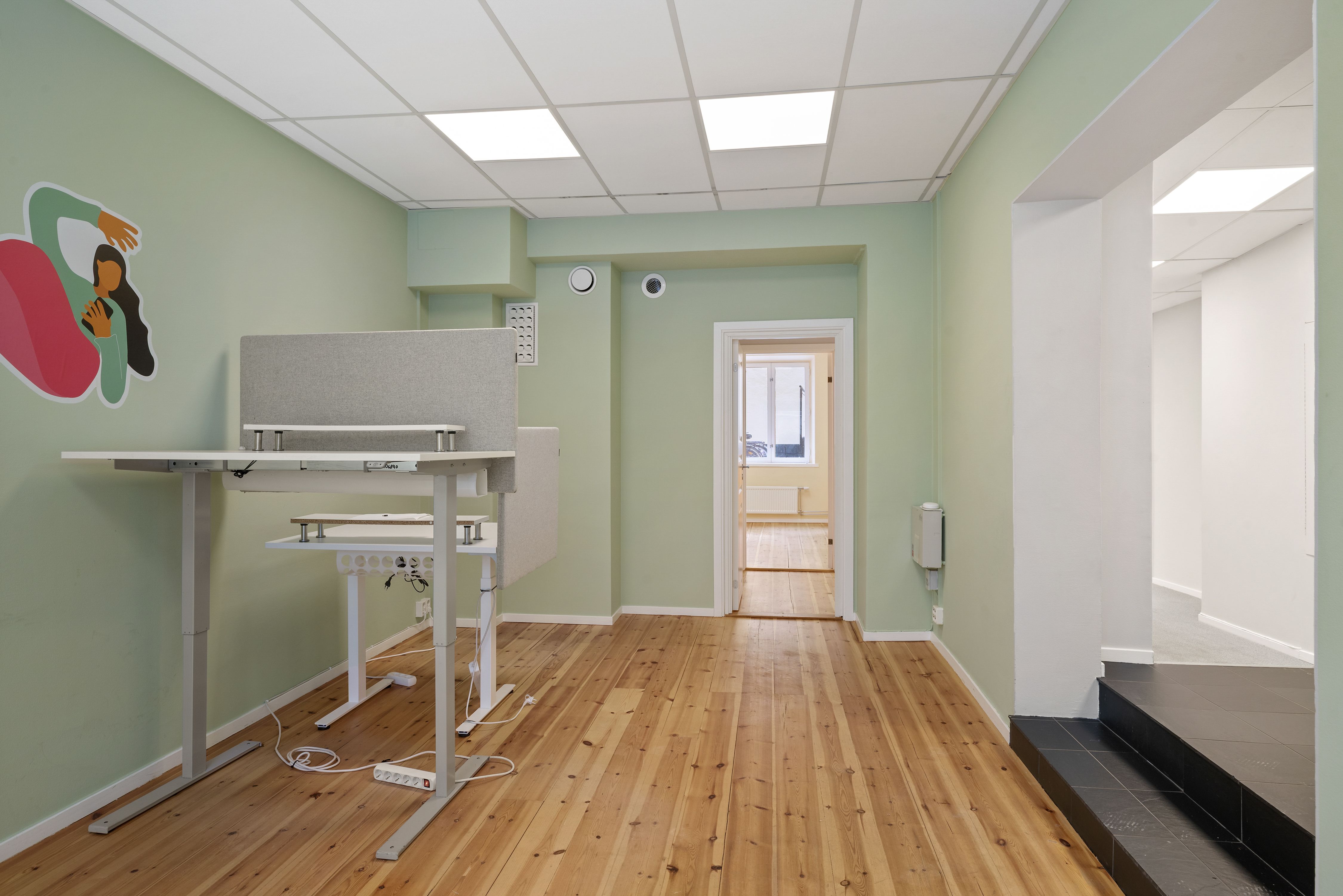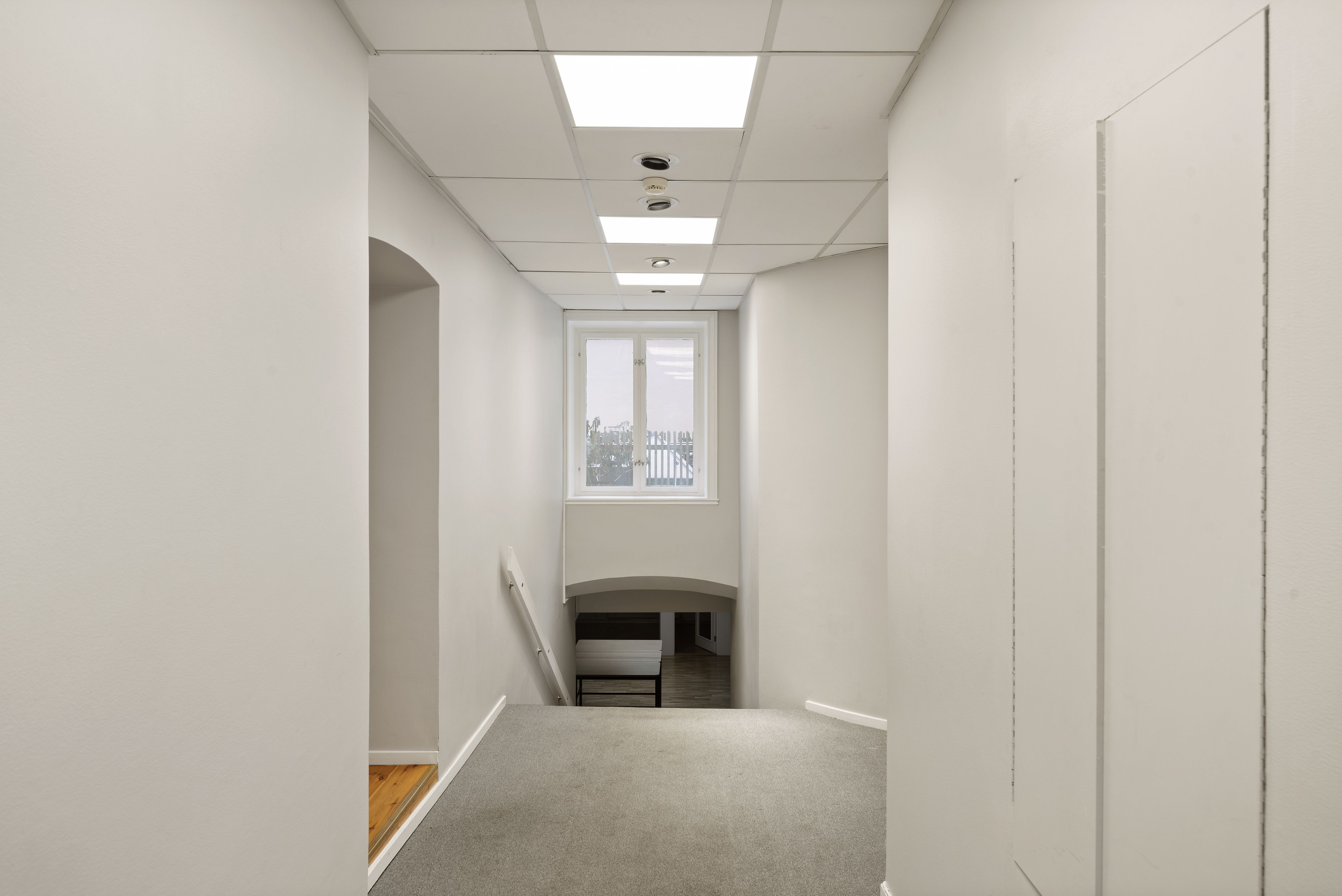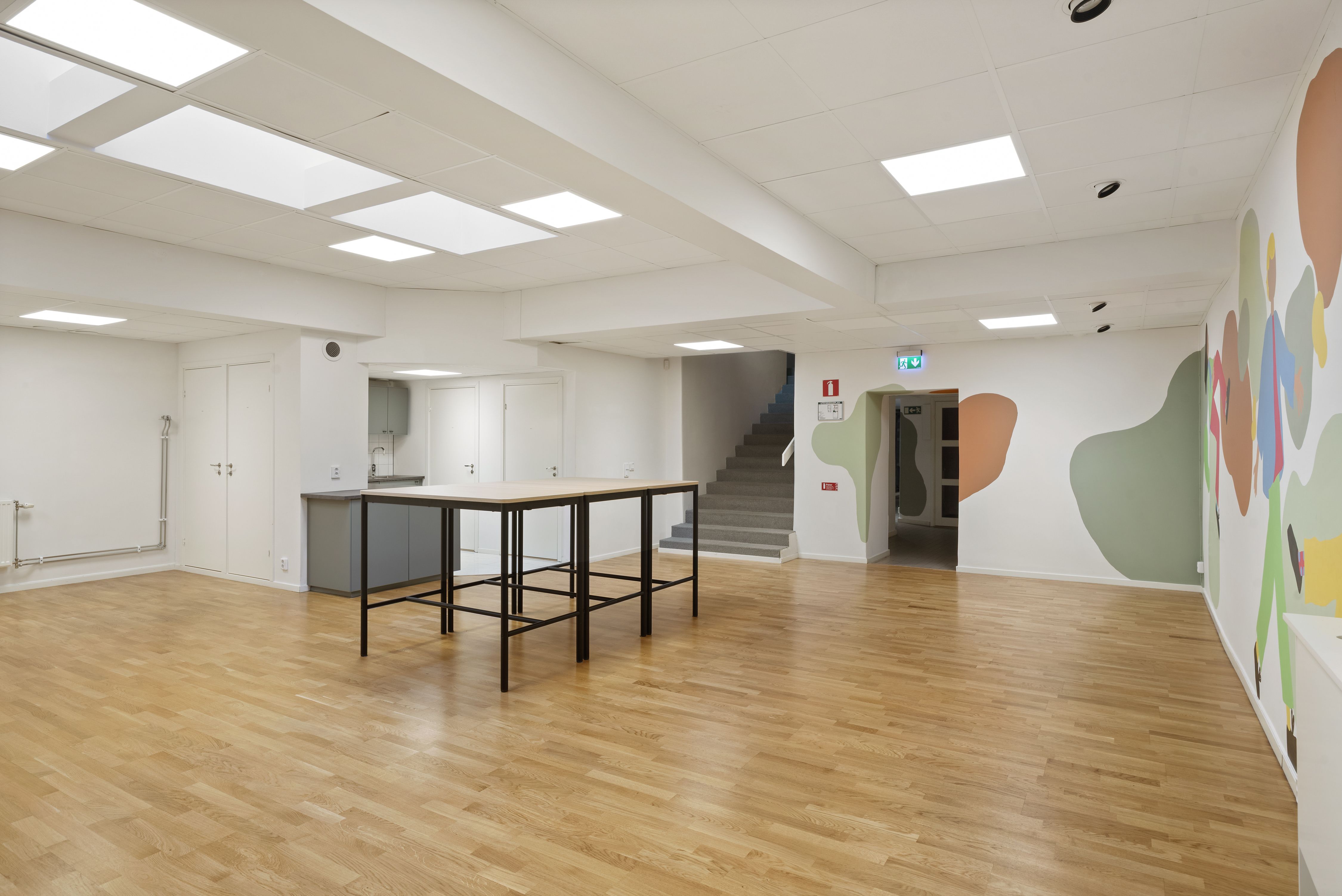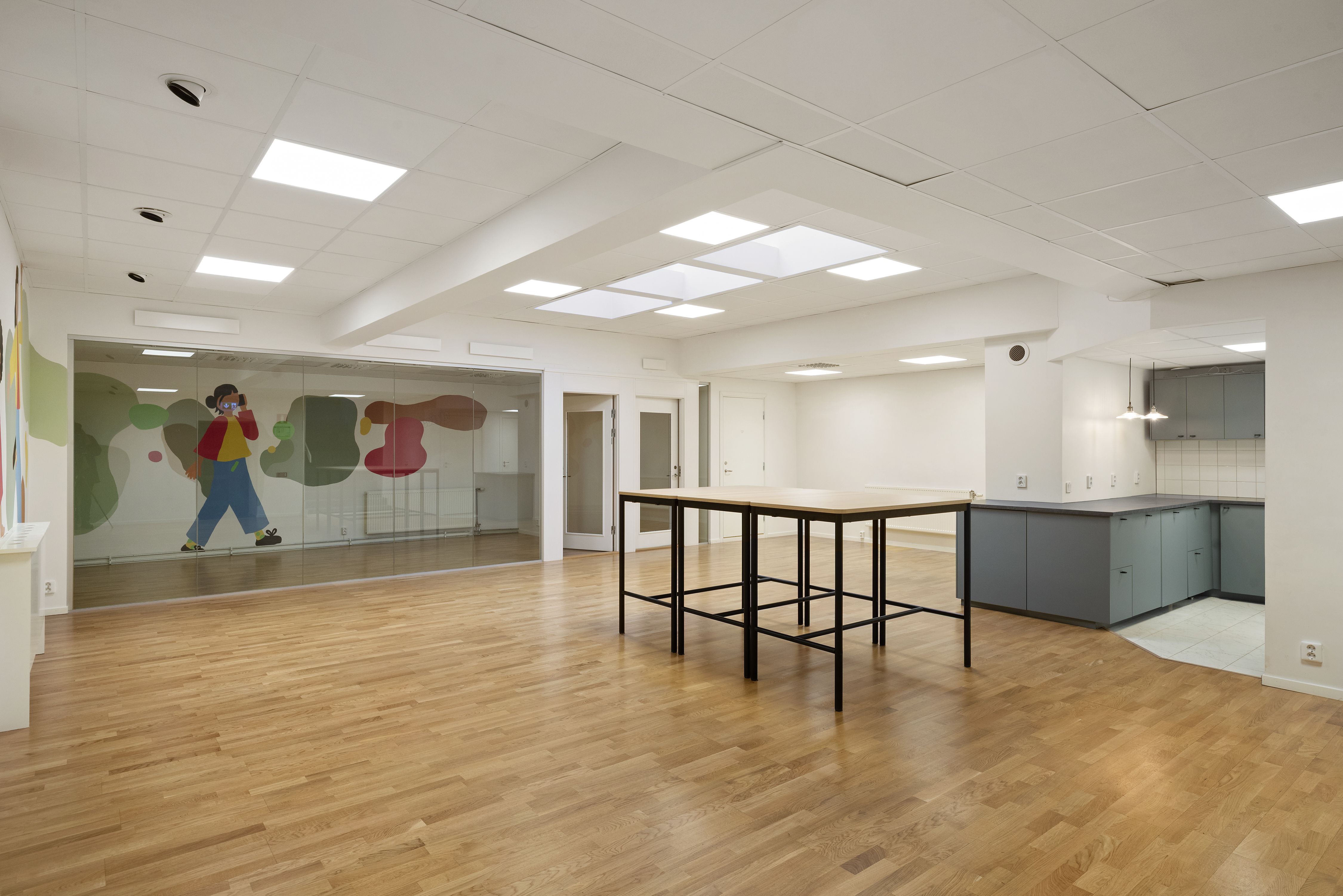 En trappa ner fortsätter lokalen med en större öppen yta med takfönster, fyra rum för möten/fokus samt två duschar.