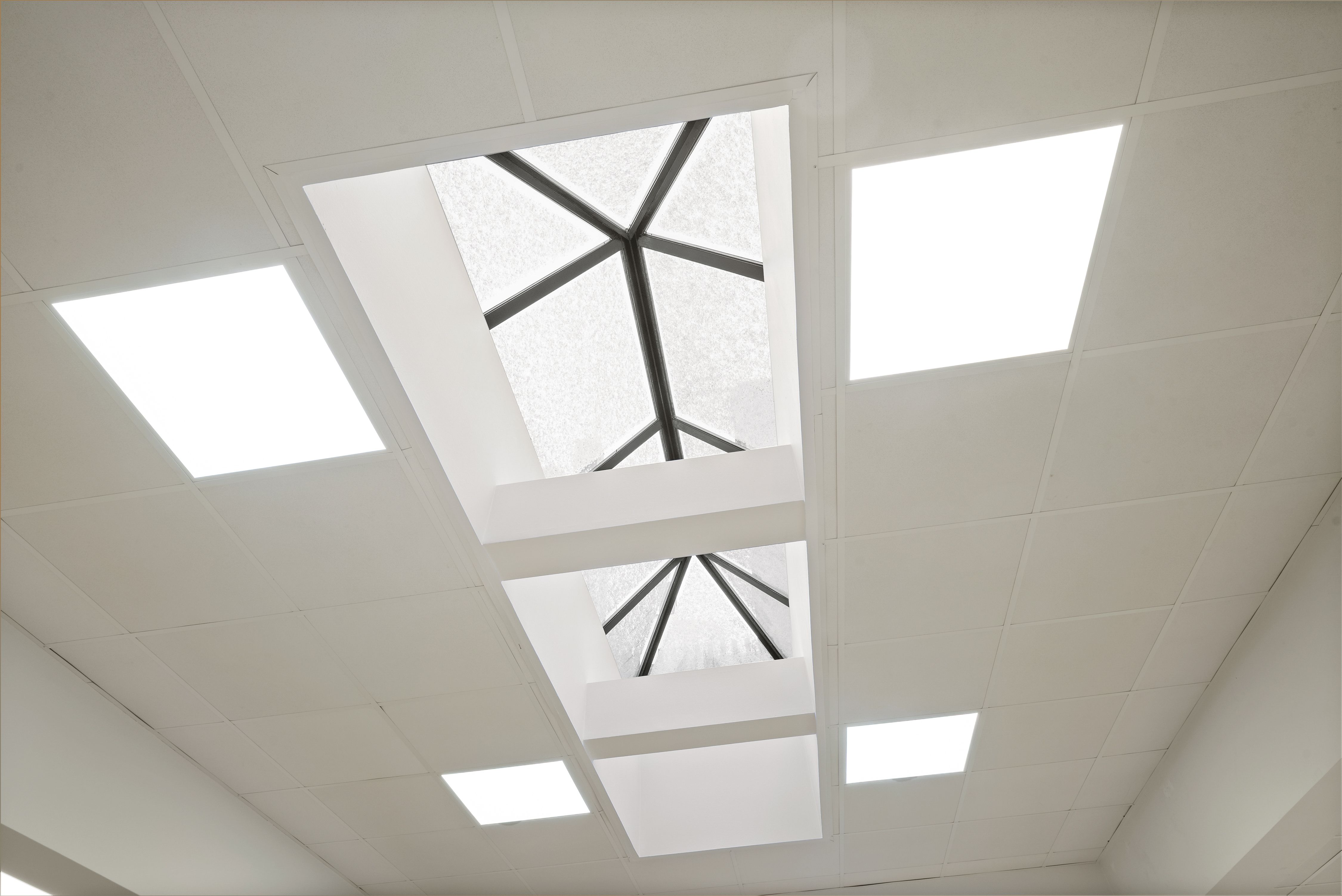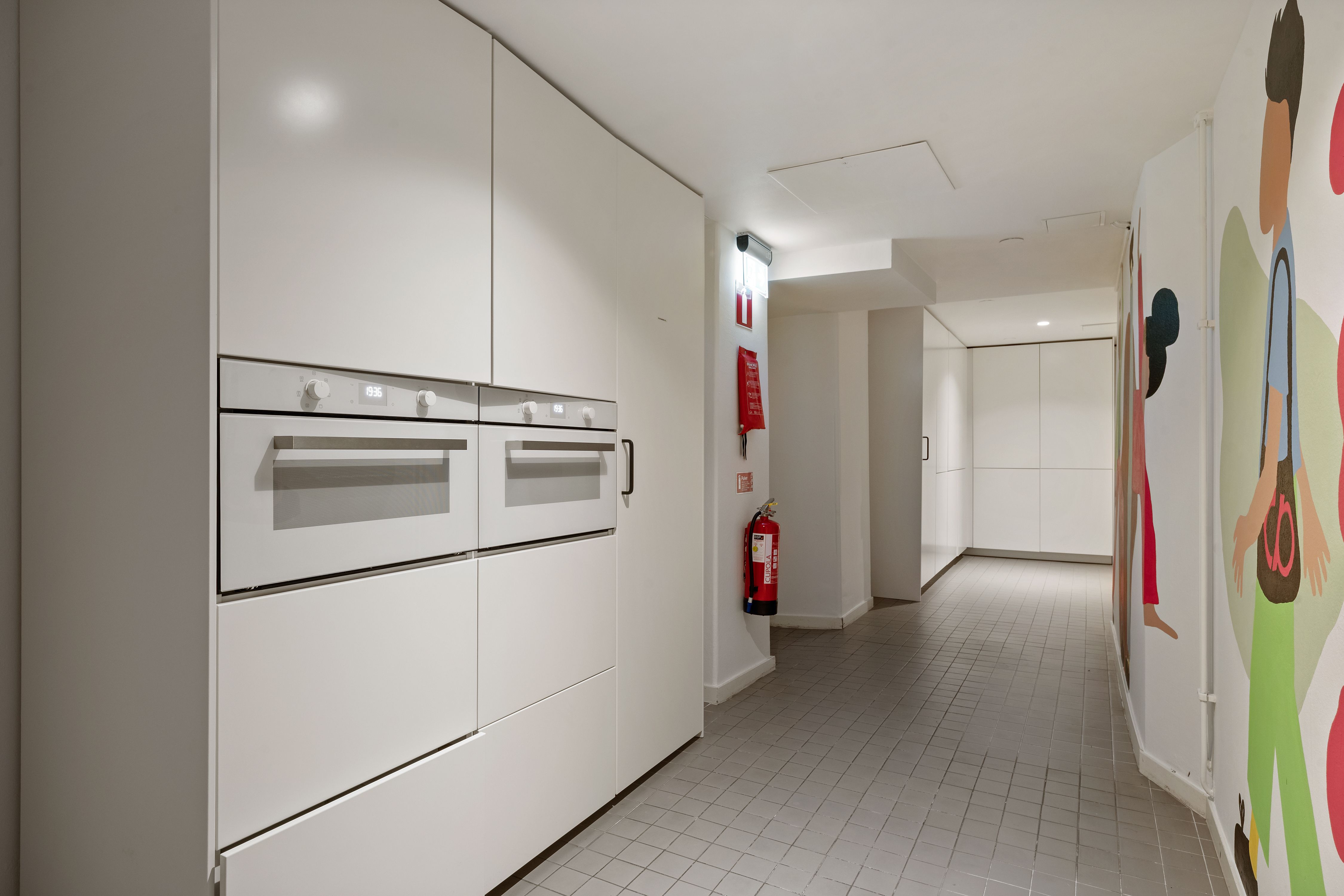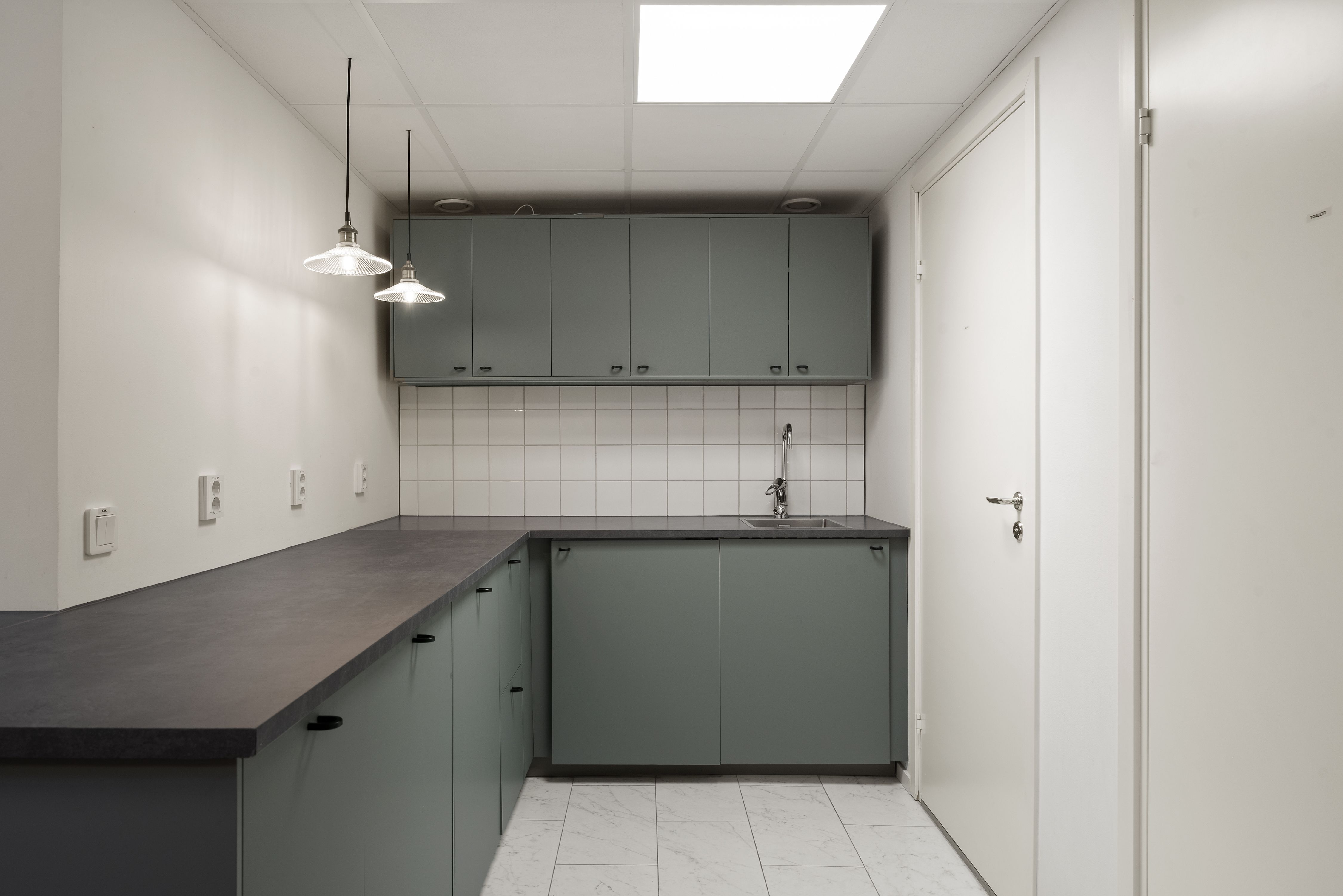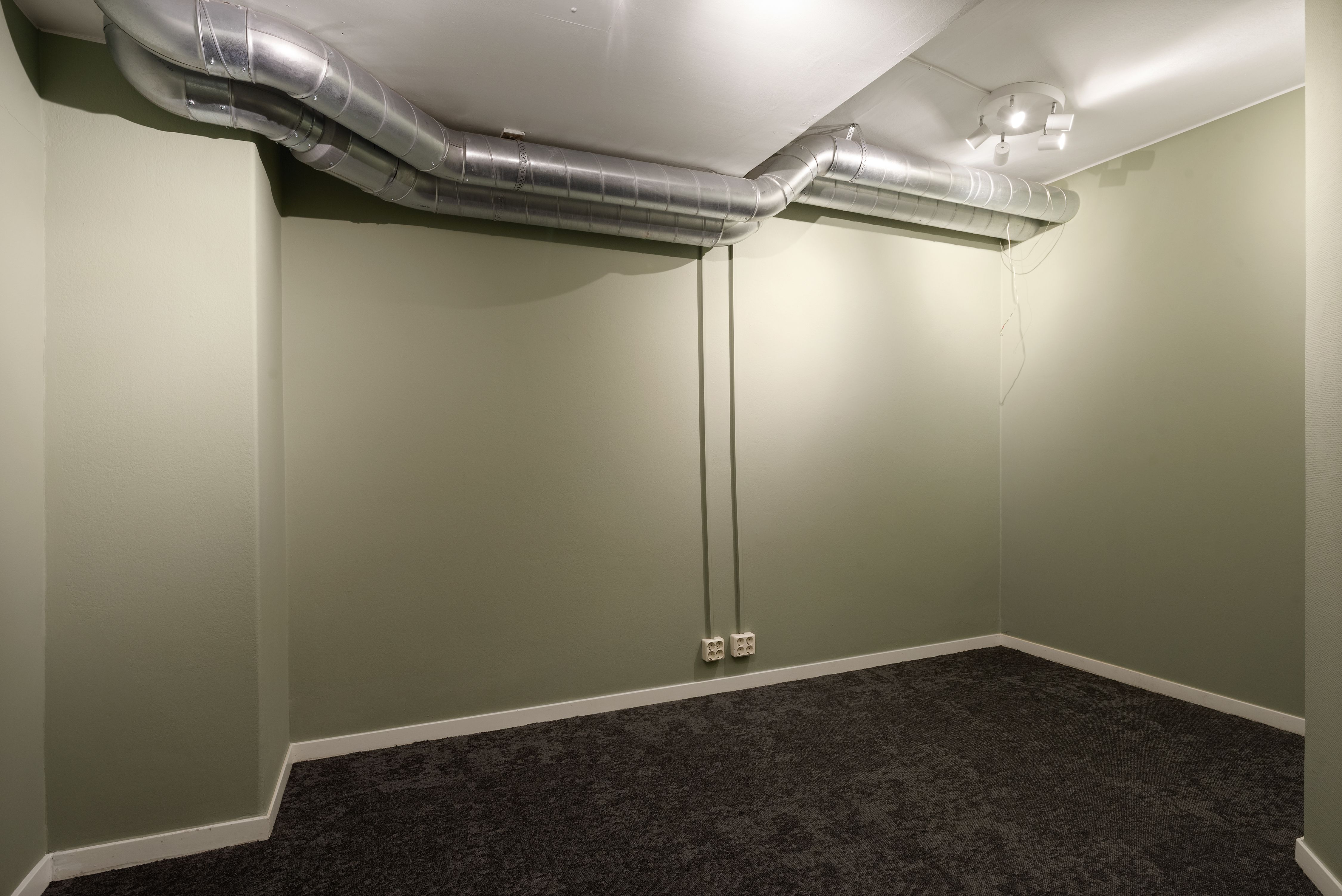 En trappa ner fortsätter lokalen med en större öppen yta med takfönster, fyra rum för möten/fokus samt två duschar.