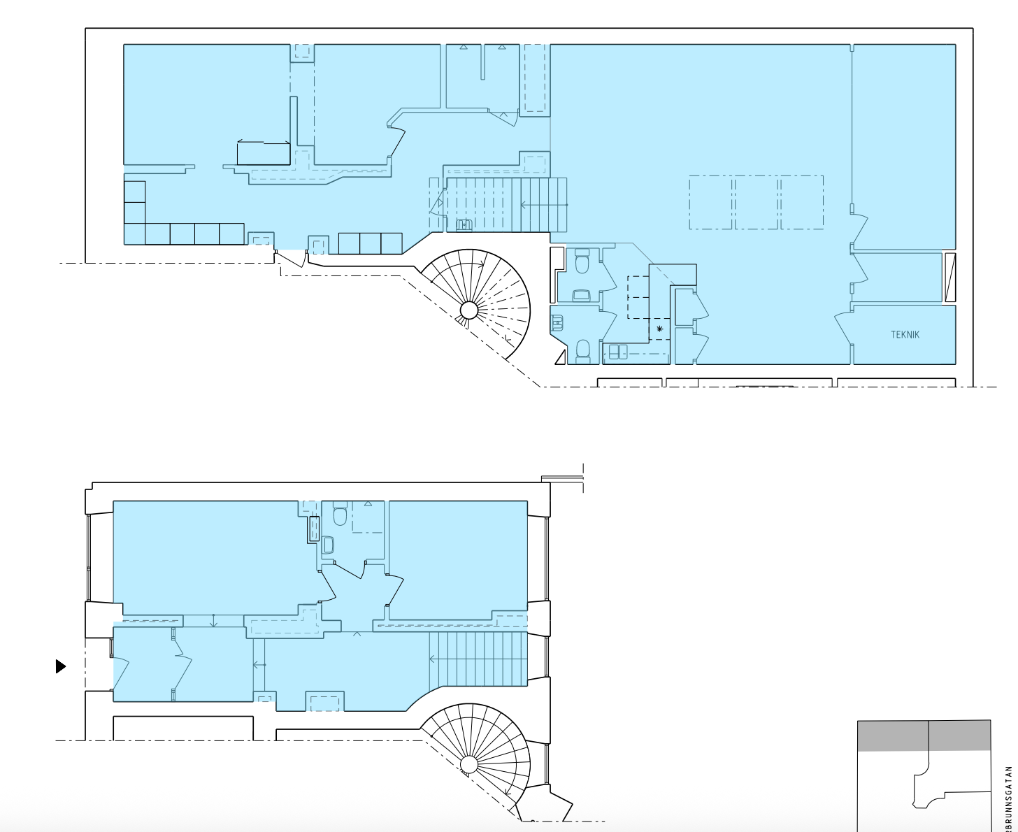 På gatuplan, fördelat på 65 kvm, finns två arbetsrum samt en wc.